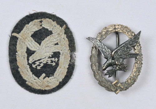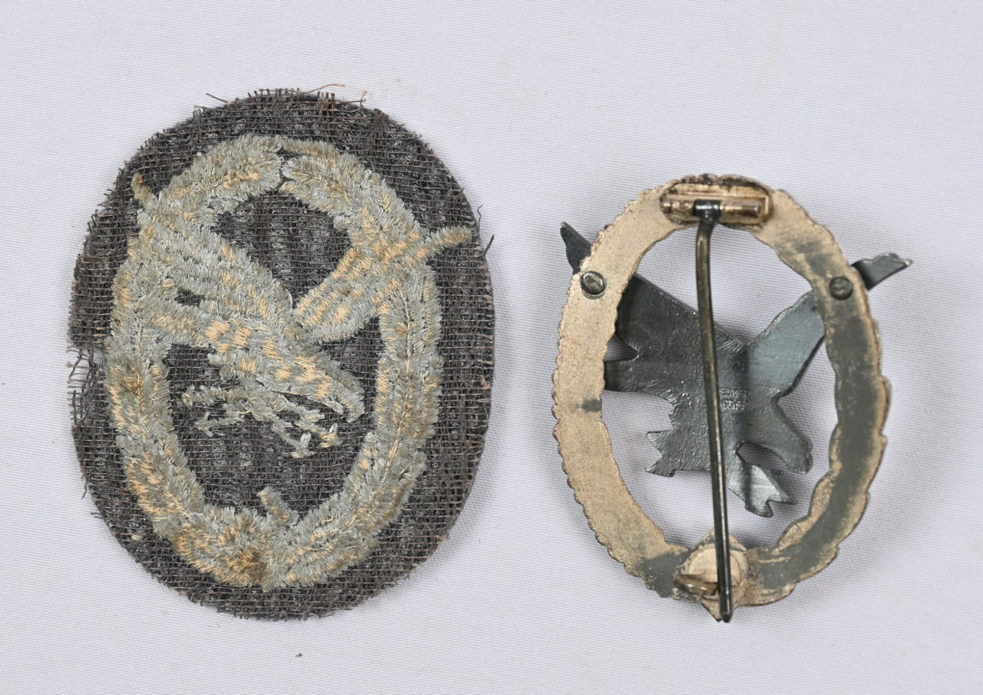 Saksan Lentokoneen ampujan merkki salamoilla, hienosinkkiä. Nimmergut 4016. Takana valmistajan merkintä ”W. Deumer Lüdenscheid”. Hyvä kunto. Lisäksi saman aiheinen kangasmerkki