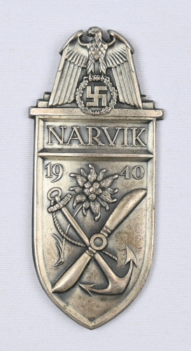Saksan NARVIK 1940 -hihakilpi hopeoitua tompakkia, ei magneettinen. Ilman taustakangasta, kiinnityspiikit katkaistu, muuten erittäin siistikuntoinen.