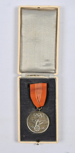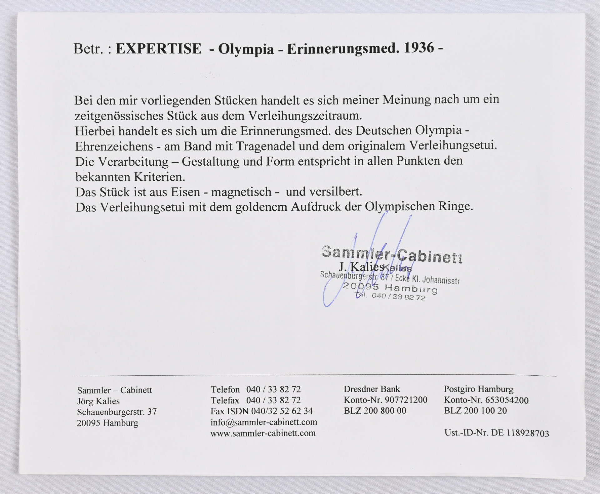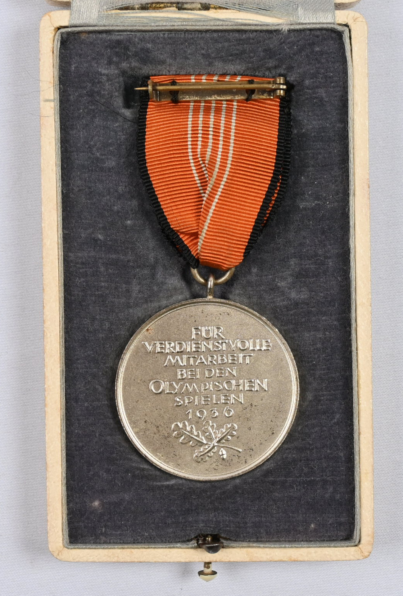 Saksan Olympialaisten 1936 muistomitali hopeoitua rautaa nauhalla alkuperäisessä kotelossa. Nimmergut 3573. Aitoutus Kaliles (2022)