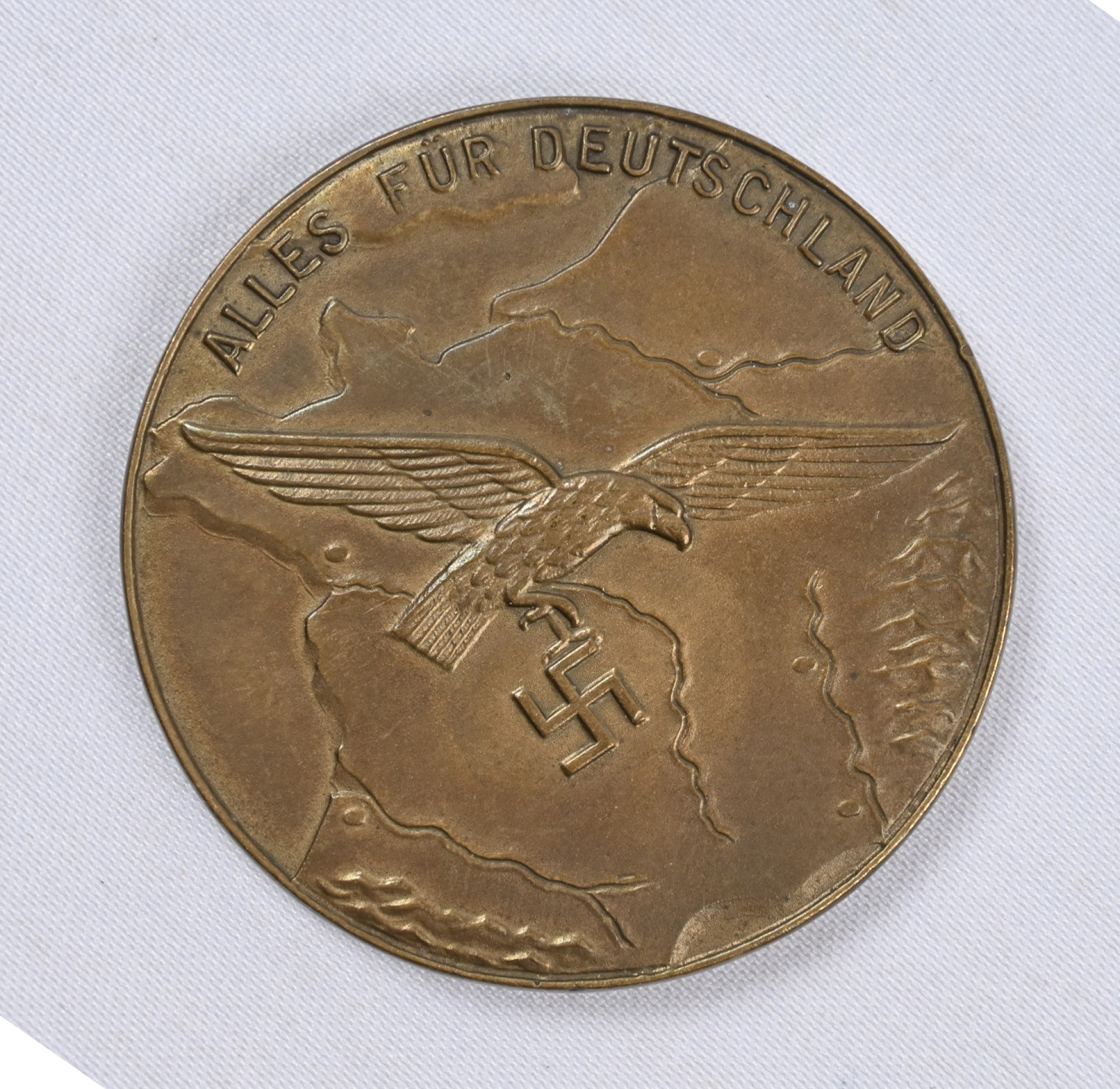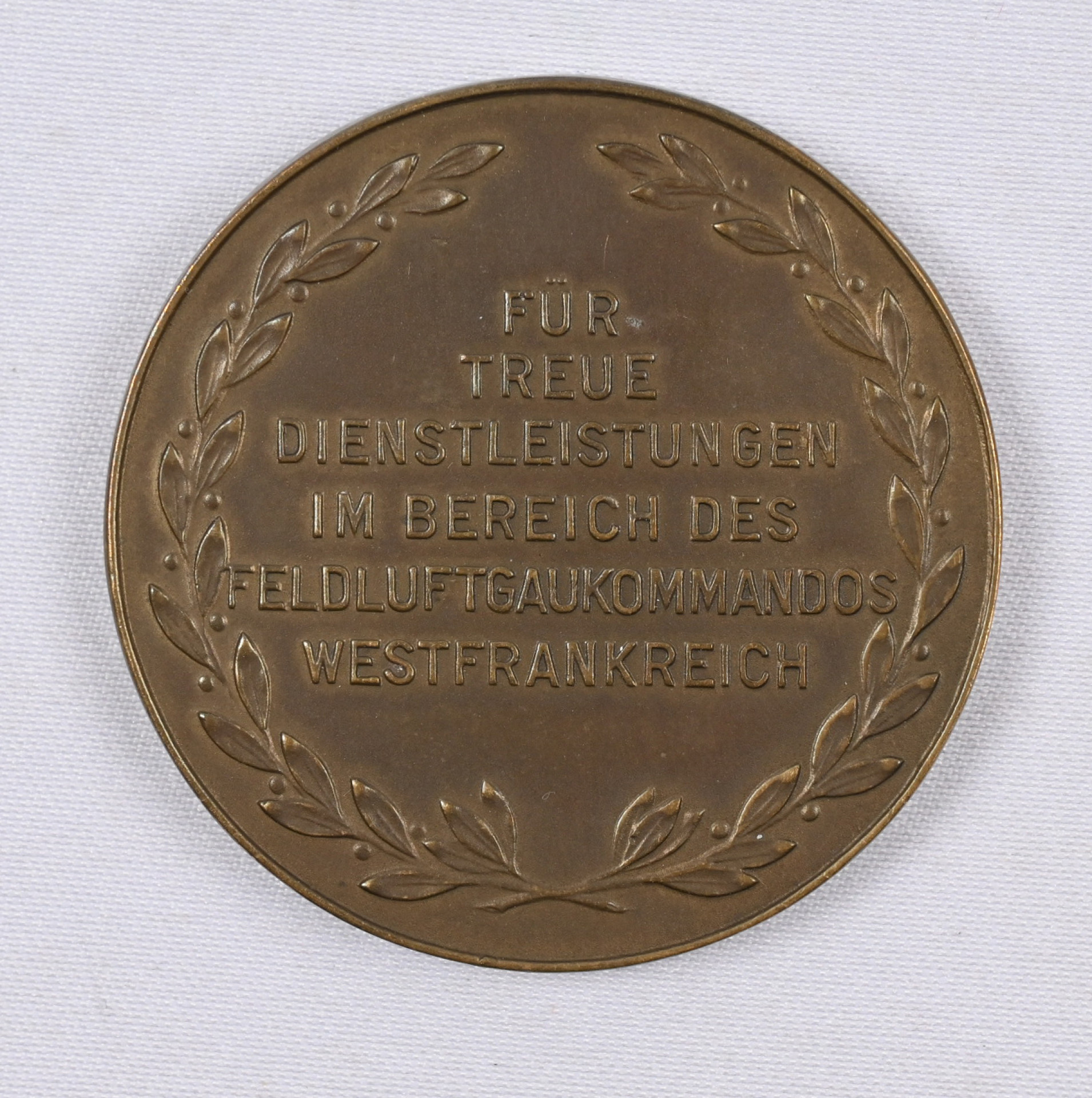 Saksan Pronssinen mitali palvelusta länsi-Ranskassa. Hakaristiä kantava kotka Ranskan kartan yllä. Takana teksti ”Für treue Dienstleistungen im Bereicht des Feldluftgaukommandos Westfrankreich” Nimmergut 4029.