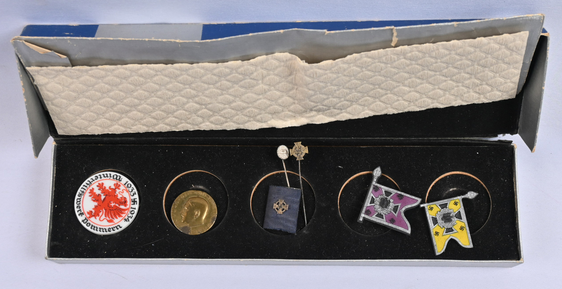 Saksan äidin risti nauhalla alkuperäisessä rasiassa (rikki), kunniamerkki 25 vuoden palveluksesta alkuperäisessä rasiassa sekä muutama pinssi, mm. 1933/-34 talviapu Pommer