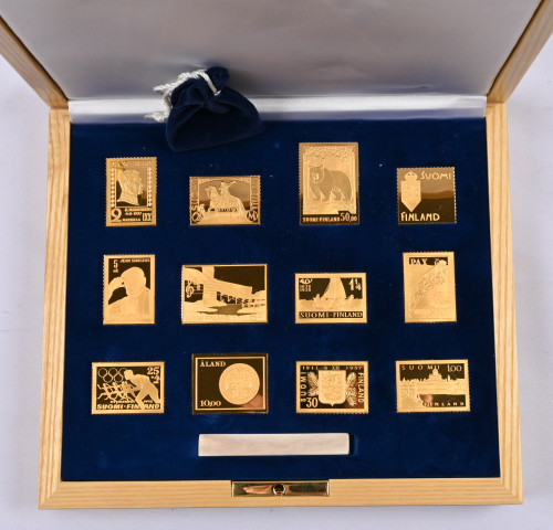 Sata vuotta Suomalaisuutta kokoelma 12 kullattu hopealaattaa (925), joissa postimerkki -aihe