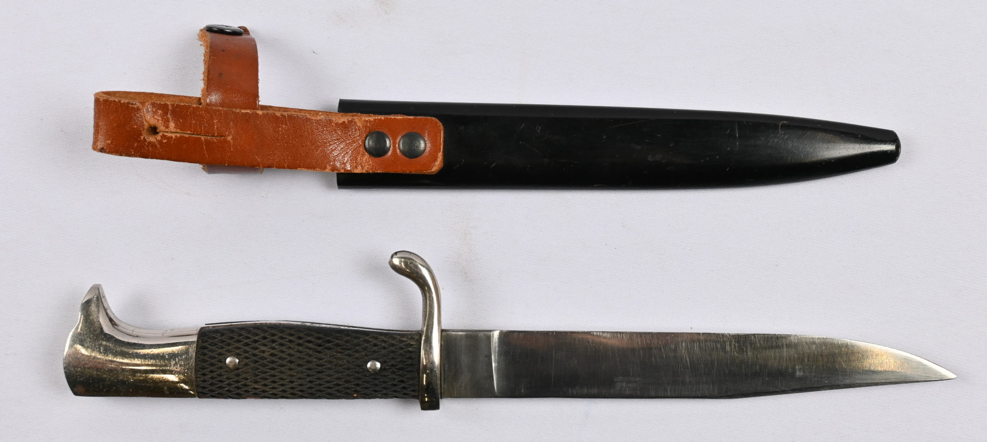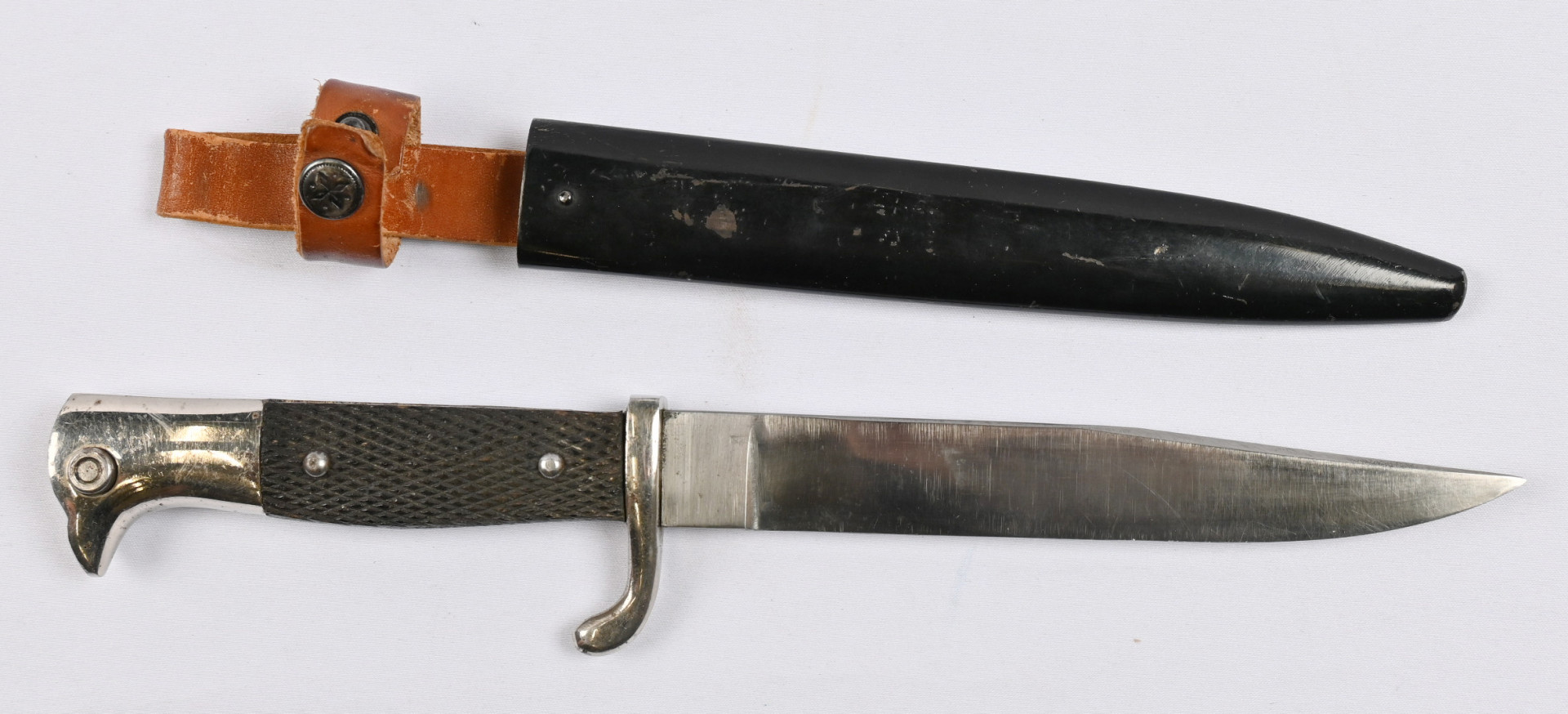 Saksalainen, tikari tupen kanssa, pituus noin 28,5 cm. Tavanomaista käyttökulumaa