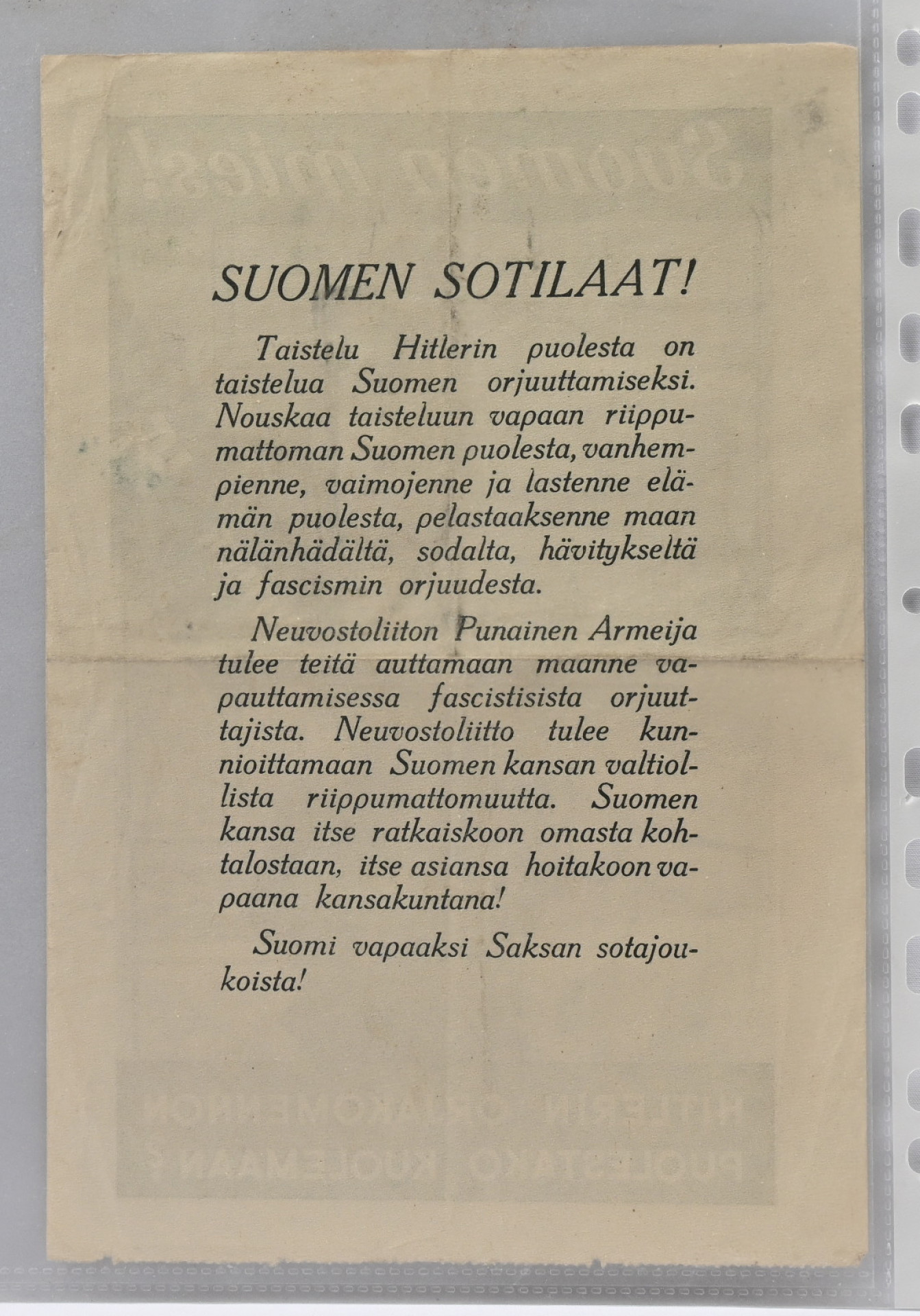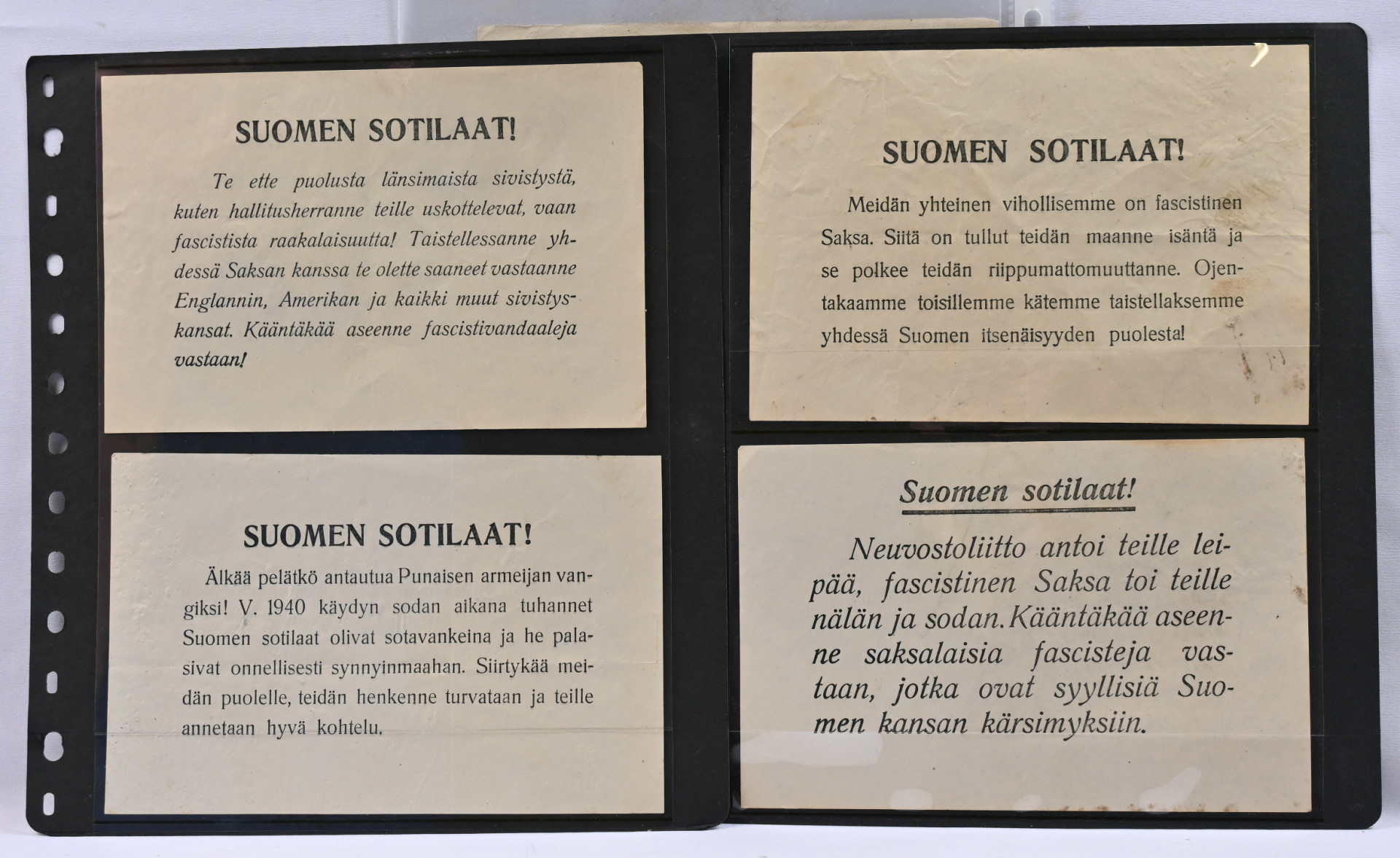 Neuvostoliittolainen lentolehtisiä: ”Suomen Mies - Hitlerin orjakomennon puolestako kuolemaan?” sekä muita jatkosodan ajan lentolehtisiä neljä erilaista. Hieno erä. ..