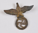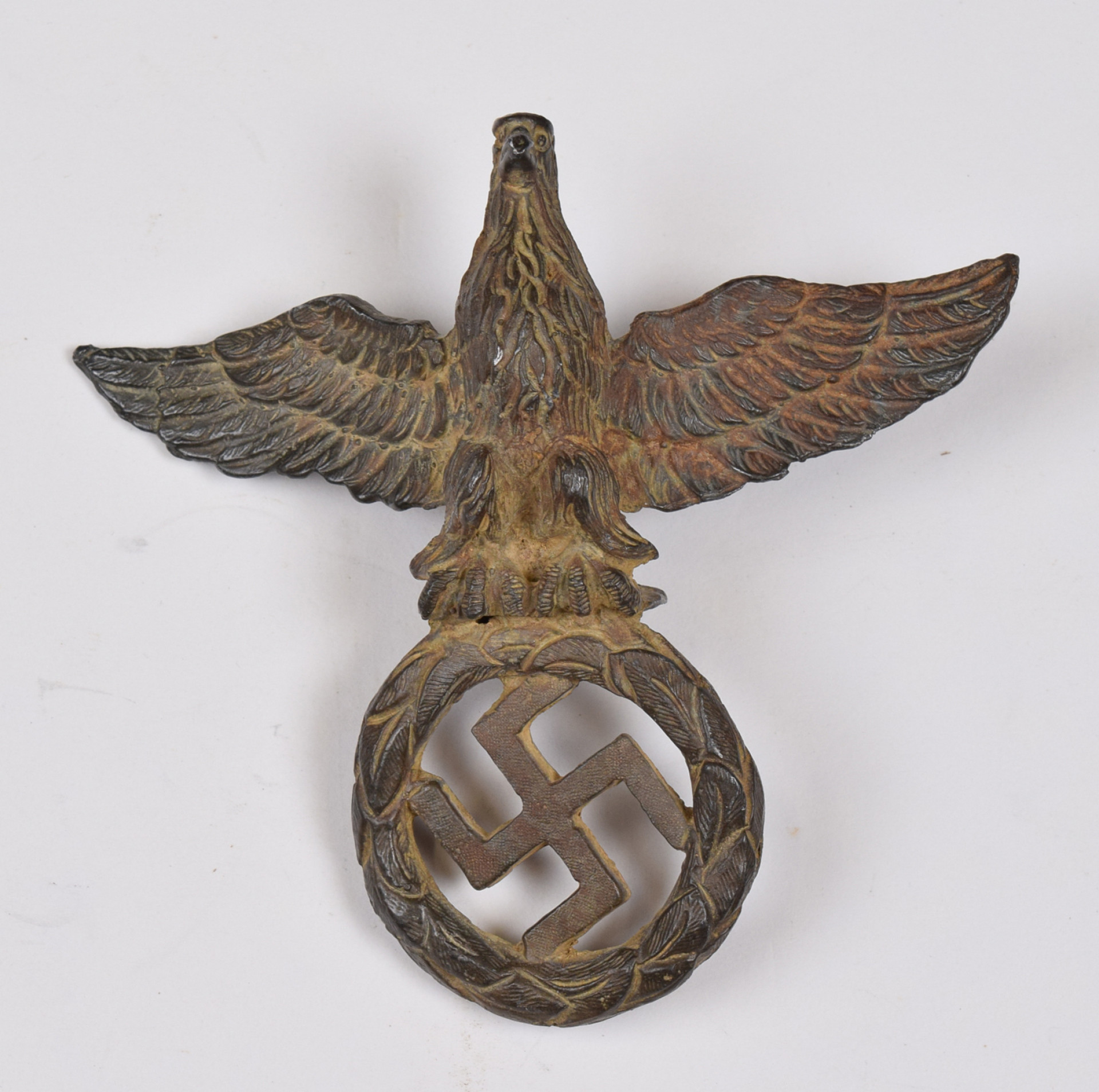 Saksalainen upea pronssivalettu kotka hakaristiseppeleellä. Ilmeisesti pienen lipputangon (auton?) tai vastaavan koriste. Korkeus n. 9 cm, leveys n. 9,5 cm