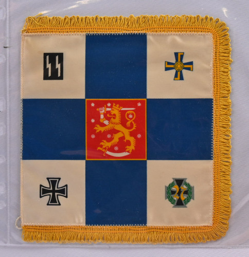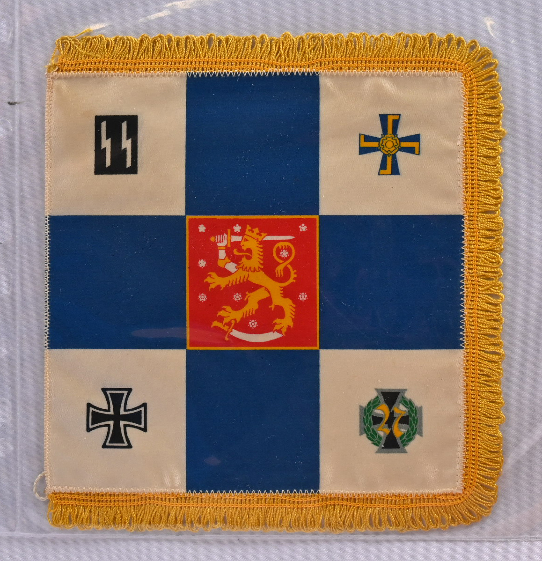 Suomen SS -vapaaehtoispataljoonan pöytälippu. Koko noin 15½ x 15½ cm.