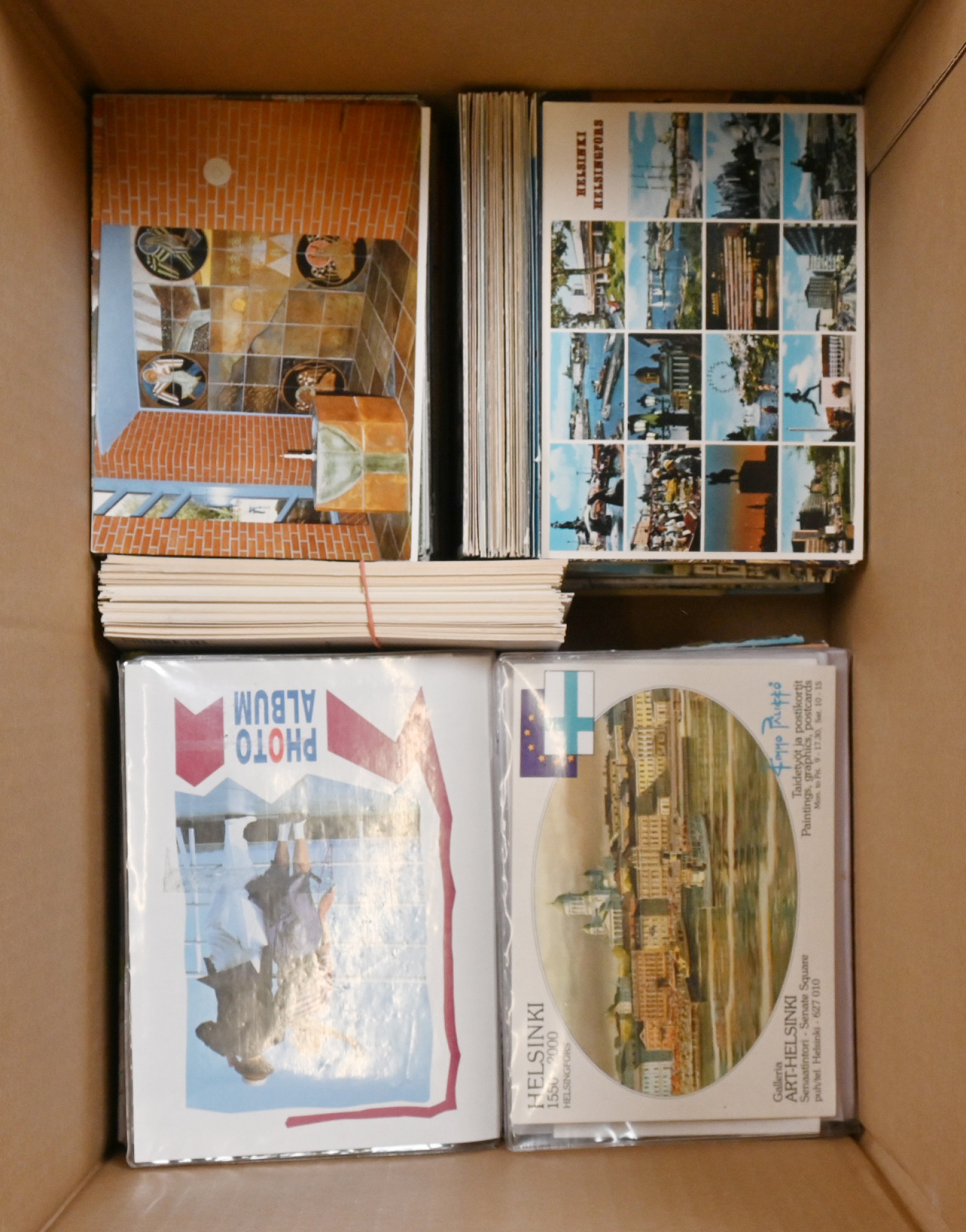 Helsinki, runsas erä lähinnä uudempia paikkakuntakortteja. Lisäksi kenkälaatikollinen kirkkokortteja monilta eri paikkakunnilta. Yhteensä yli 10 KG.