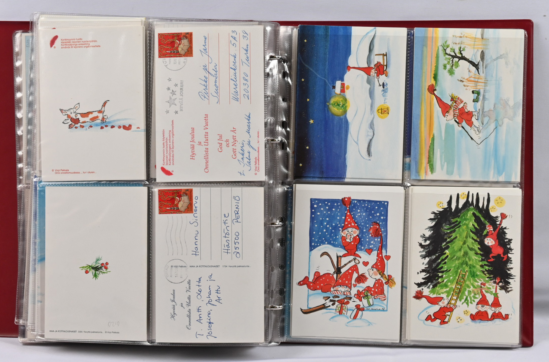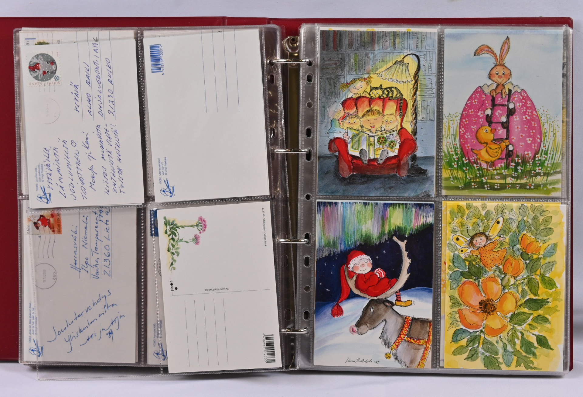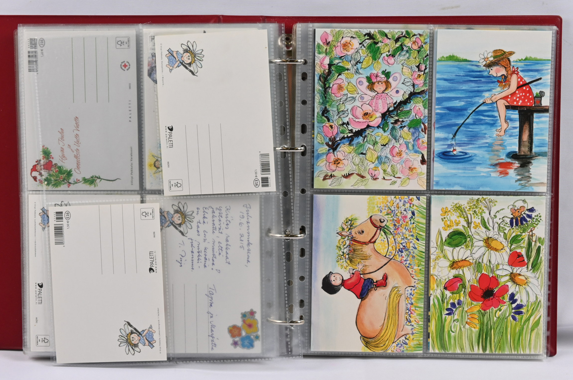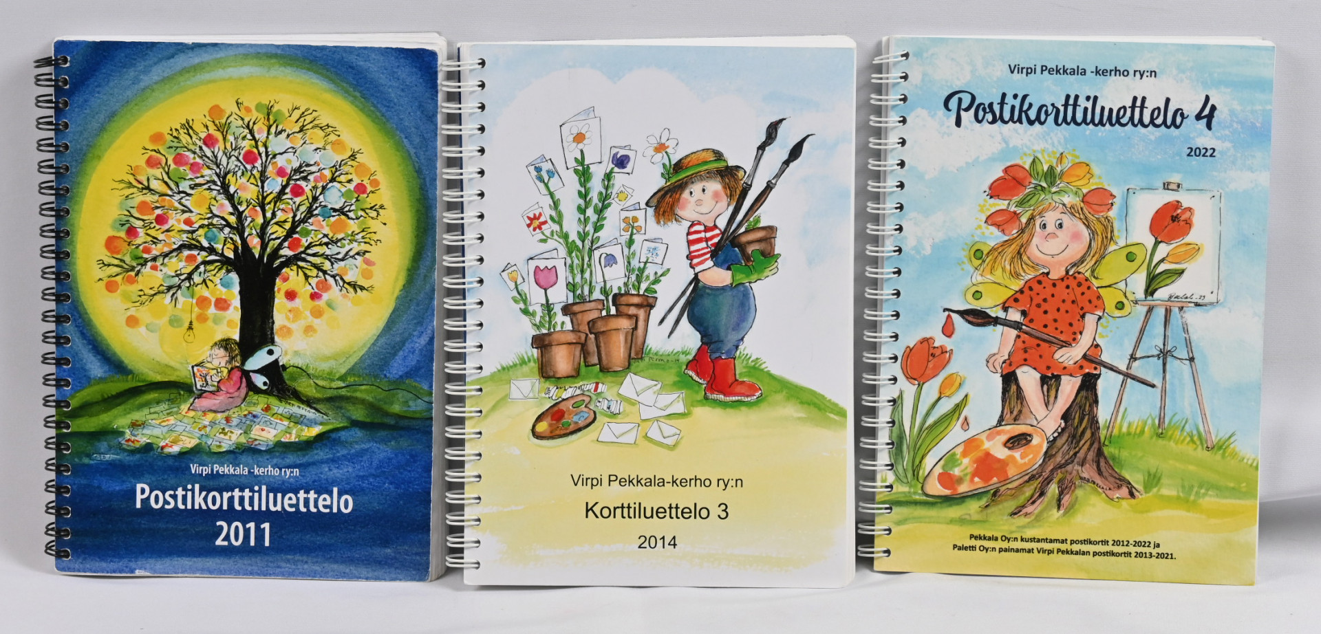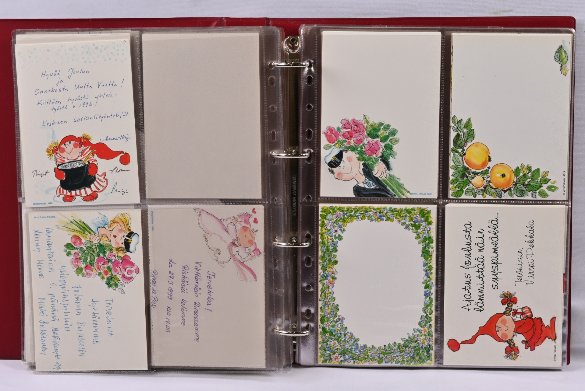 Virpi Pekkala kokoelma 13 kansiossa. Satoja ja satoja kortteja, lisäksi kolme luetteloa kyseisistä korteista