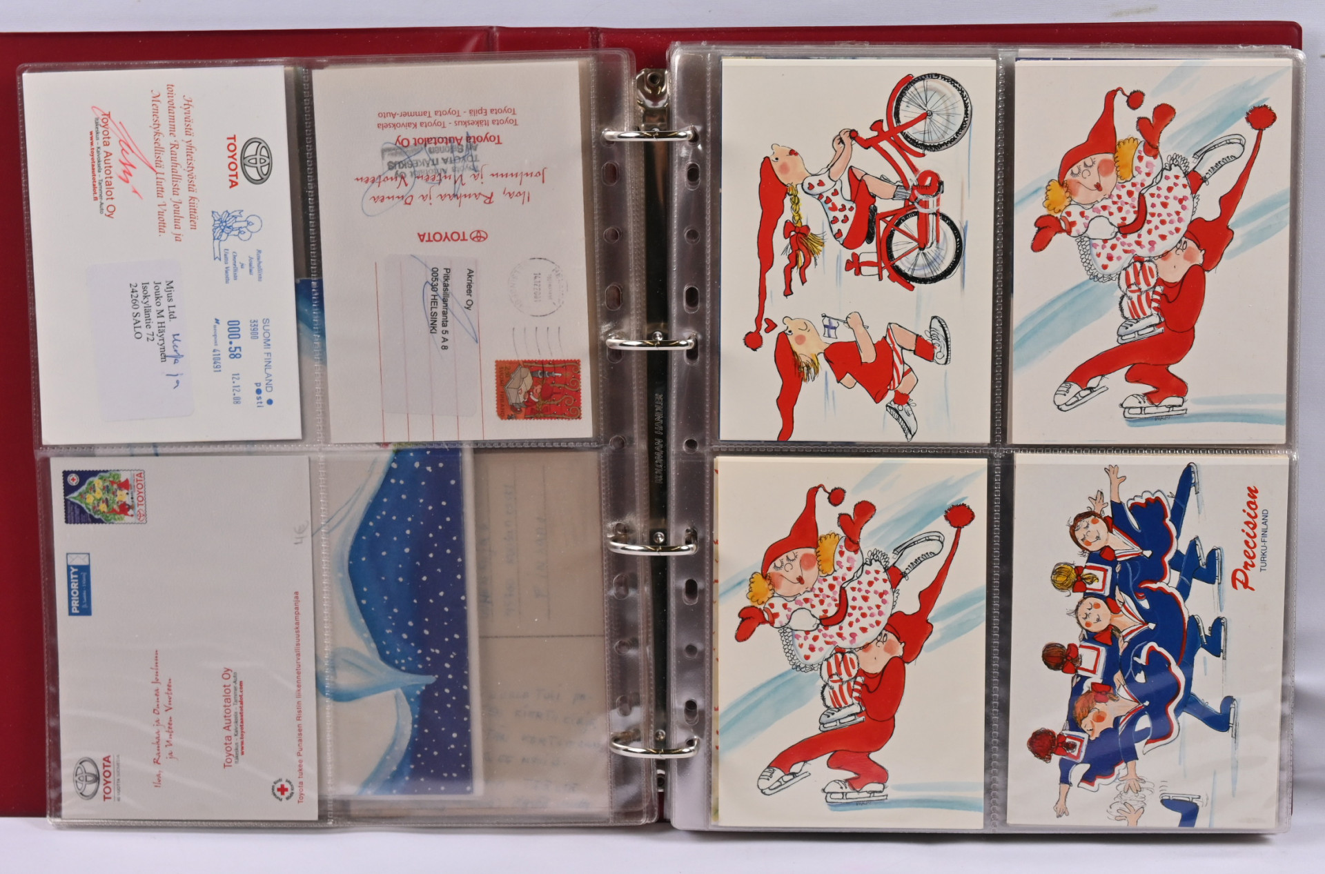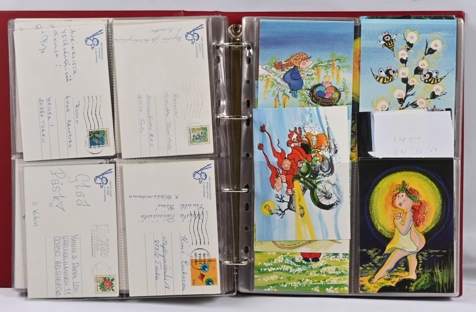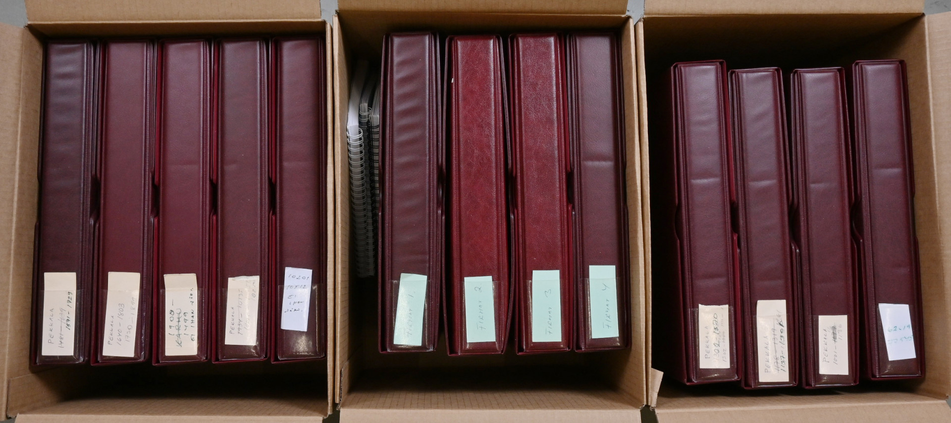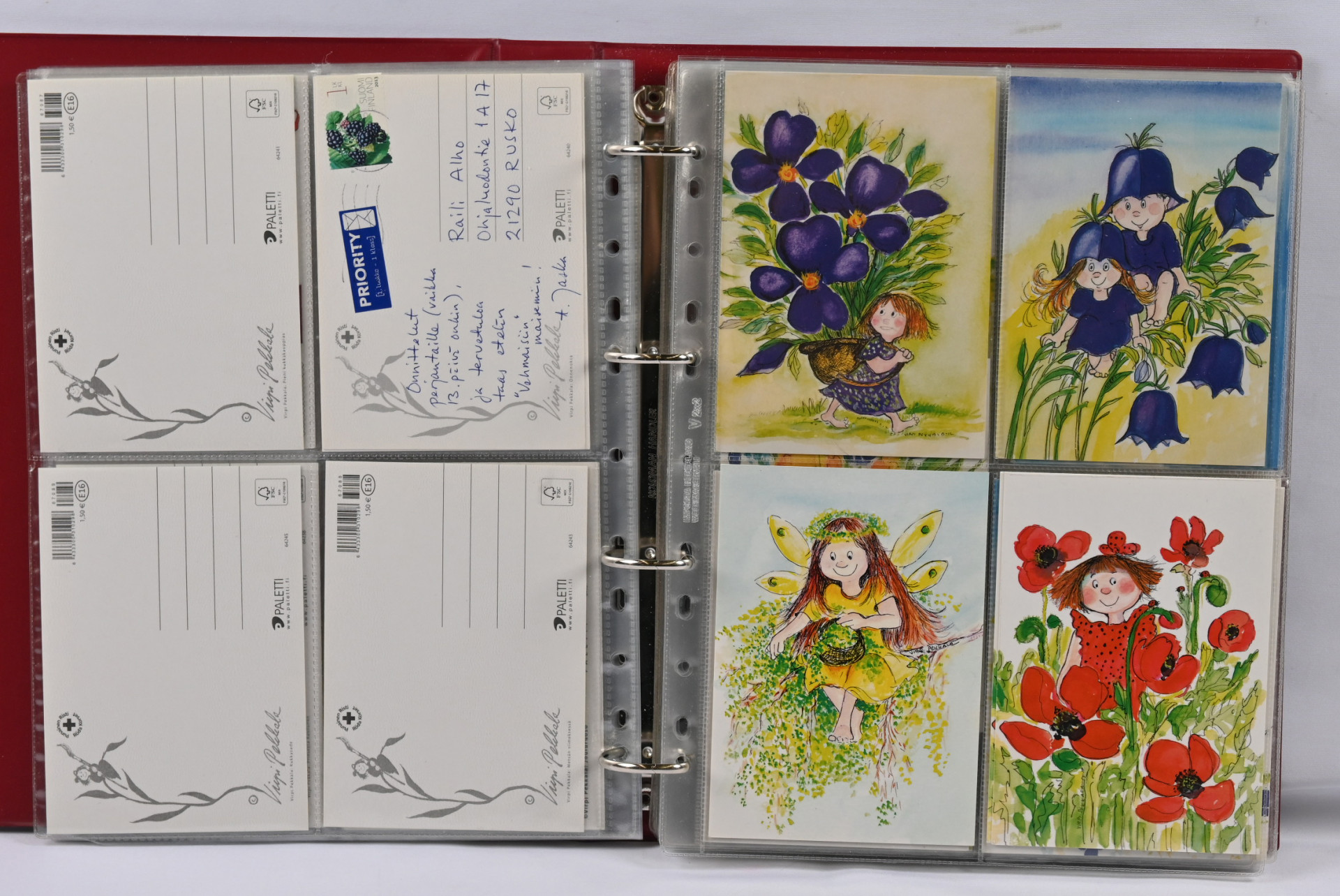 Virpi Pekkala kokoelma 13 kansiossa. Satoja ja satoja kortteja, lisäksi kolme luetteloa kyseisistä korteista