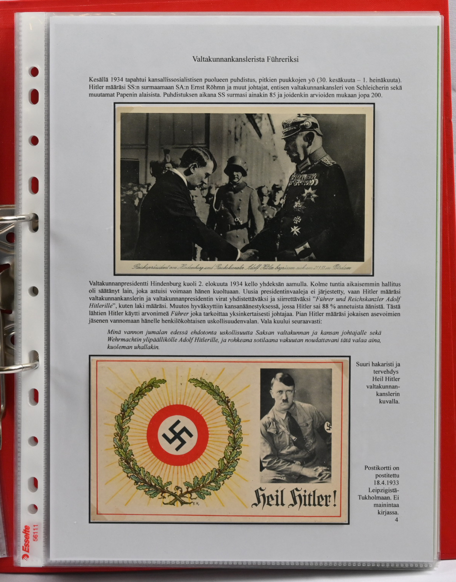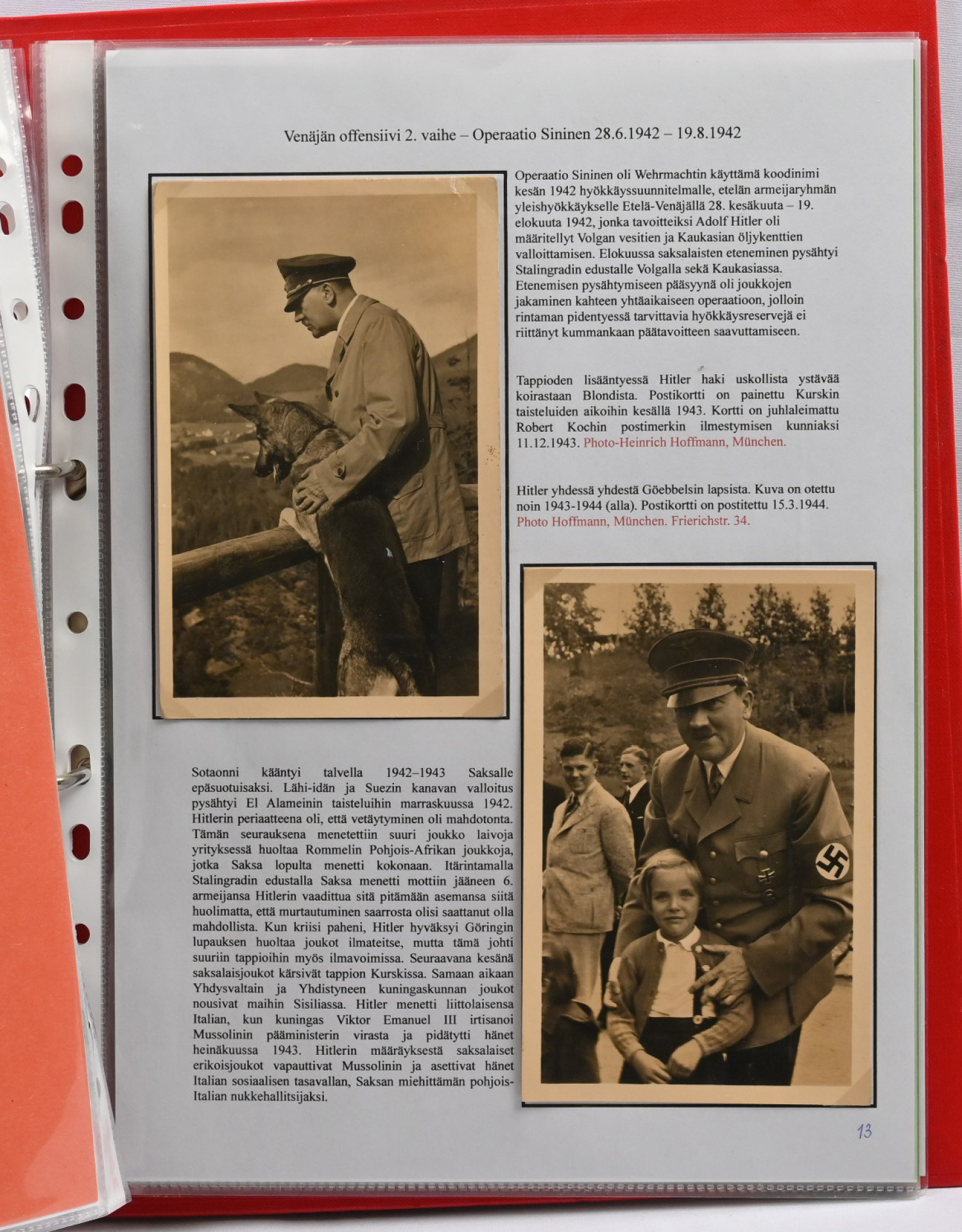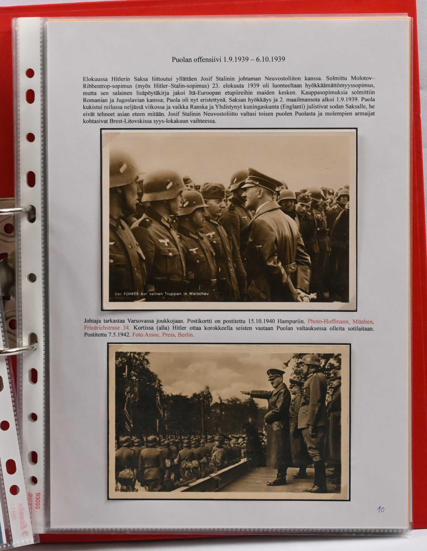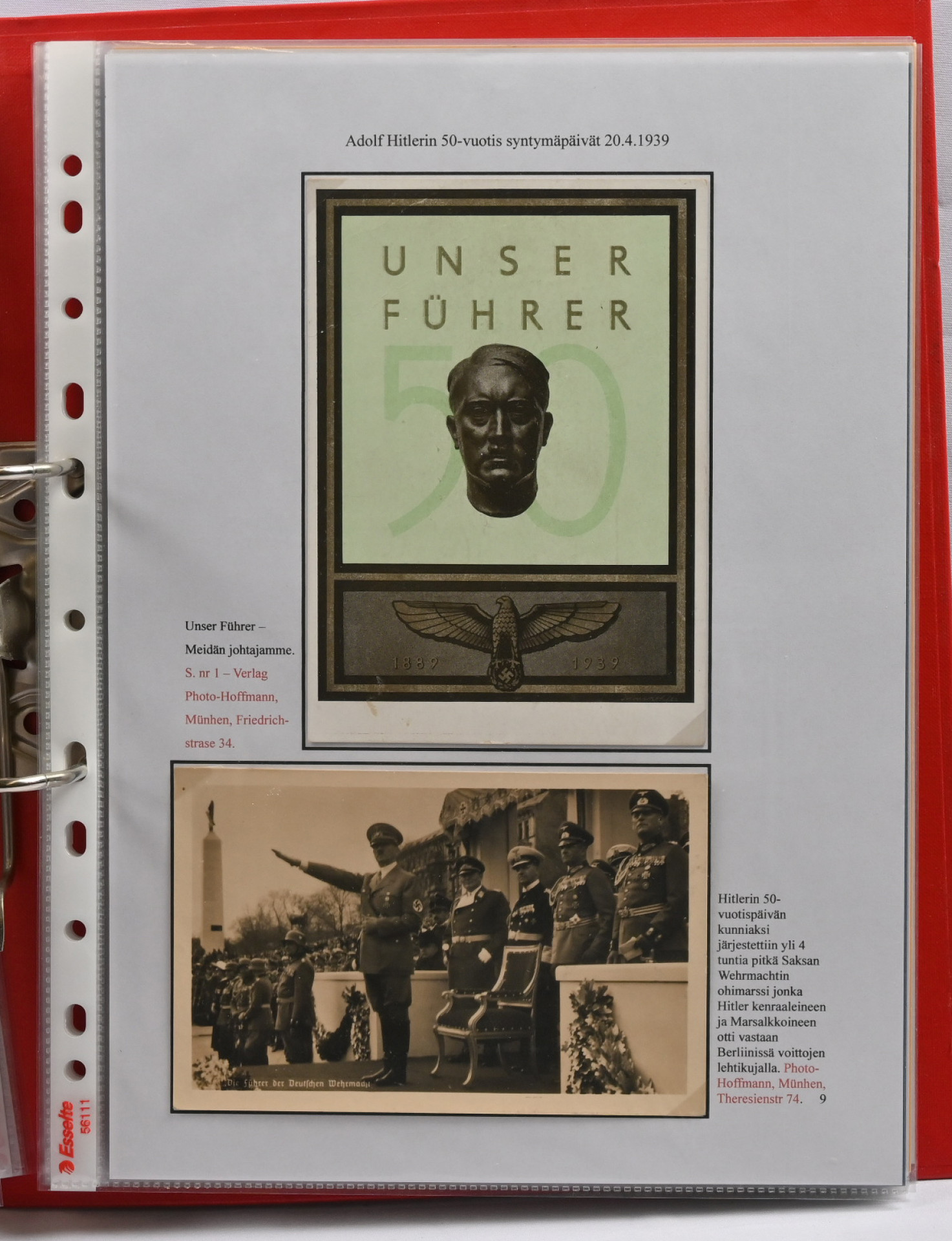Adolf Hitler postikorteissa. Hieno yhden kehyksen (16 sivua) korttiasiantuntijan laatima näyttelykokoelma runsain, seikkaperäisin selityksin. 30 hienokuntoista korttia, joukossa harvinaisuuksia!