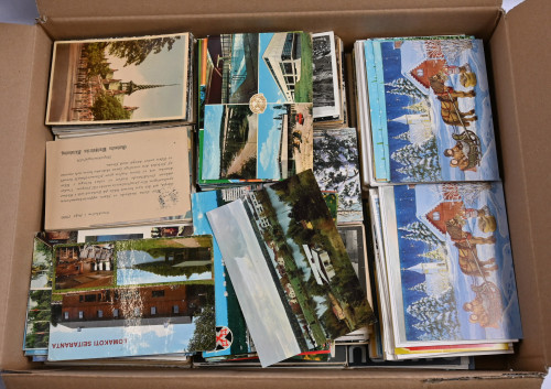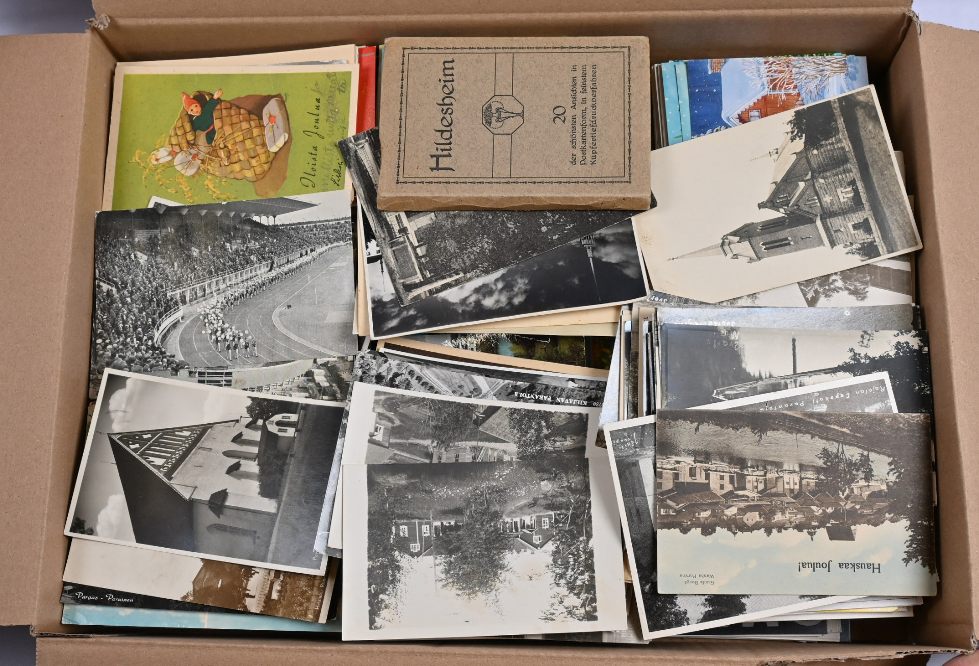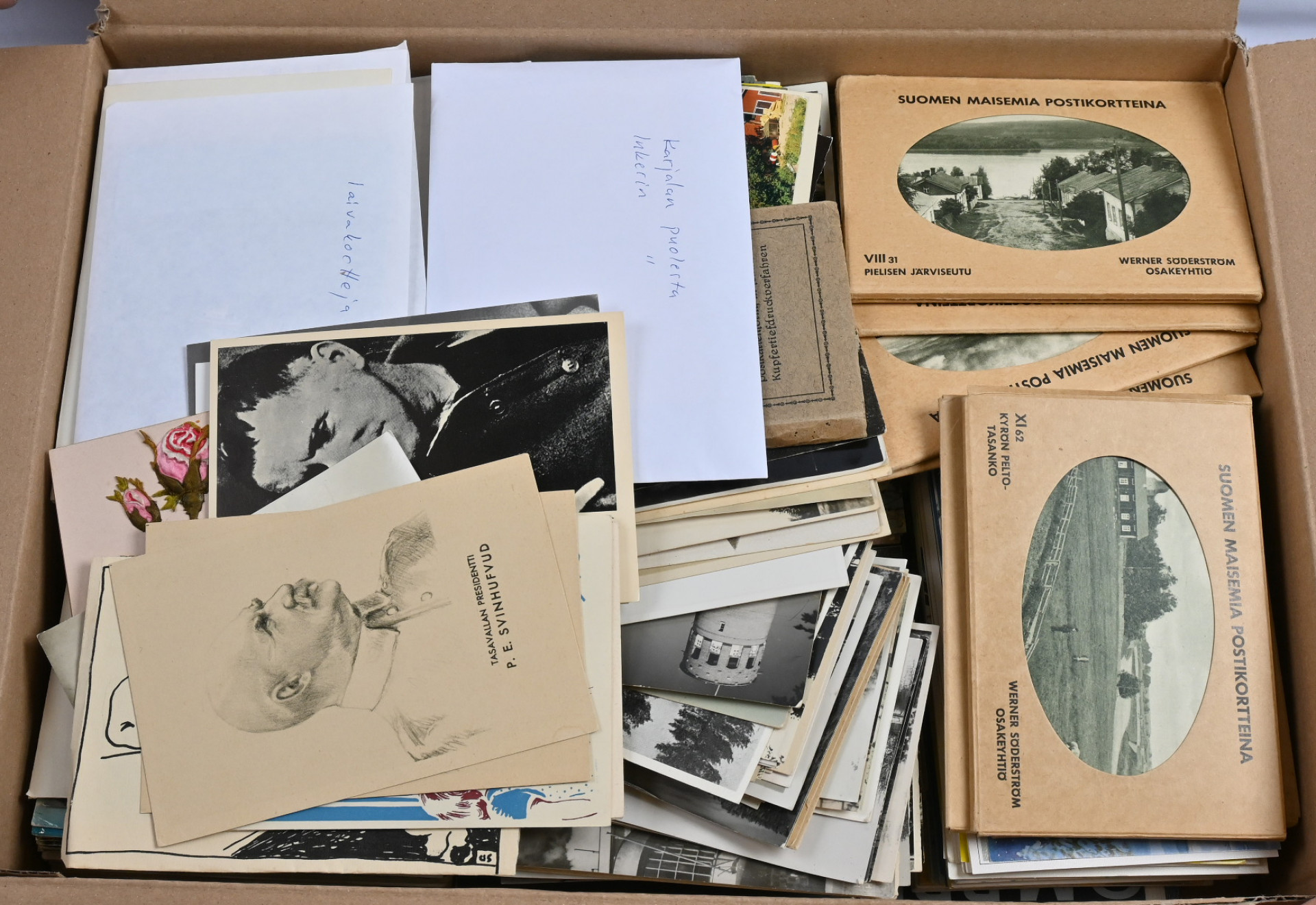 Hyvä erä eri aiheisia kortteja yli 5,5 KG laatikossa. Lähinnä suomalaisia, vähän myös ulkomaita. Paljon vanhaa, taiteilija (Wendelin, Nyström ym.) - ja paikkakuntakorttia. Mm. onnittelukortti vuodelta 1885, Tukholman 1912 ja Helsingin 1952 olympialaiset, Karjalan / Inkerin puolesta, useita sarjoja ”Suomen maisemia postikorteissa” ym.