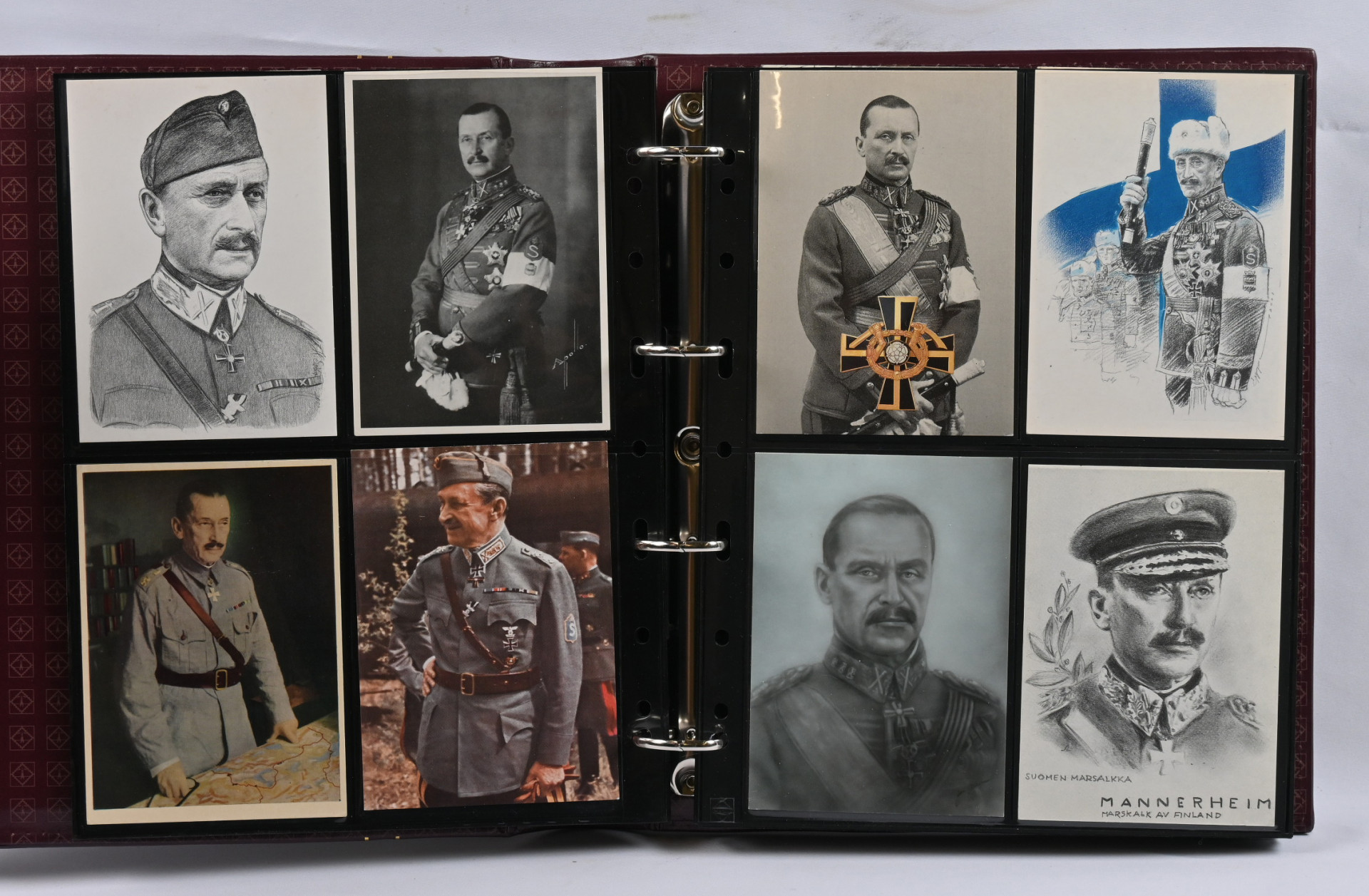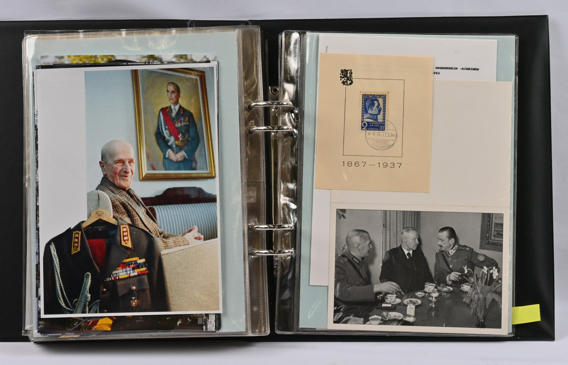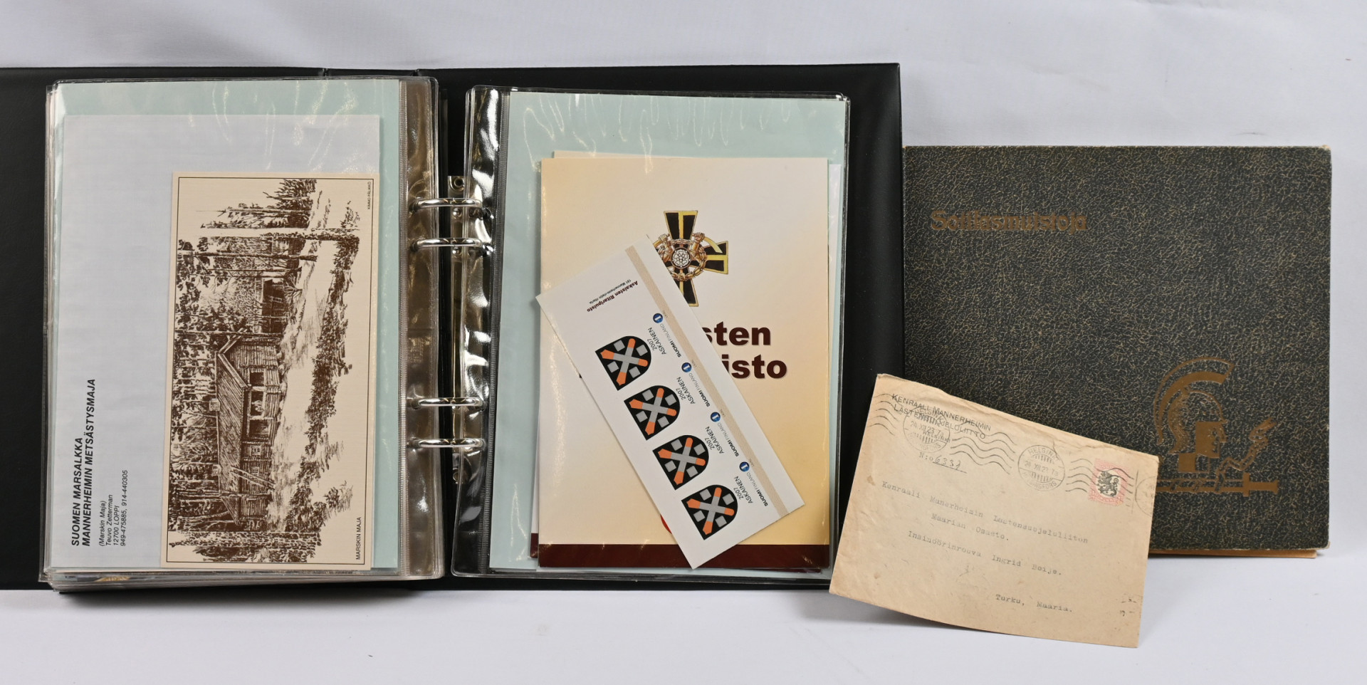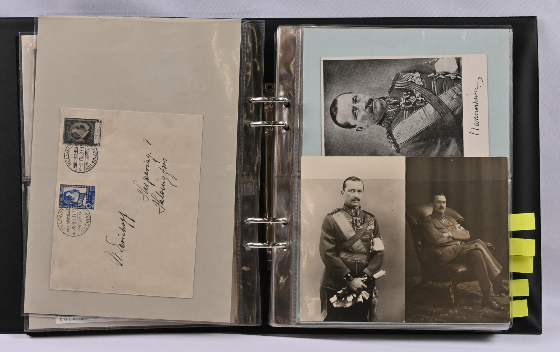 Mannerheim, erittäin hyvä materiaalia lähinnä postikortteja ja valokuvia kahdessa kansiossa. Toisessa kansiosa yli 20 vanhaa valokuvaa sekä uudistuotantoa, nimikirjoitus kortilla 1944, postikortteja, mm. venäläinen karikatyyrikortti (tahraa), filateliakohteita suomesta ja USA:sta ja vähän muutakin materiaalia. Toisessa kansiossa korttikokoelma, jossa yli 60 erilaista lähinnä modernia / uusintapainamakorttia