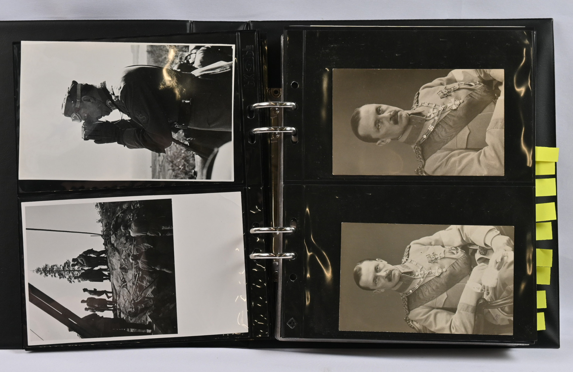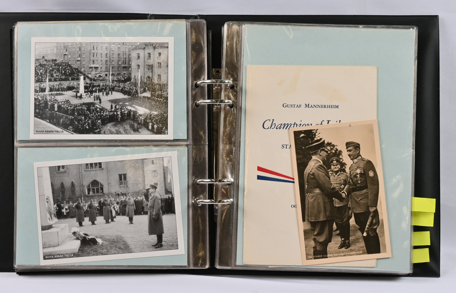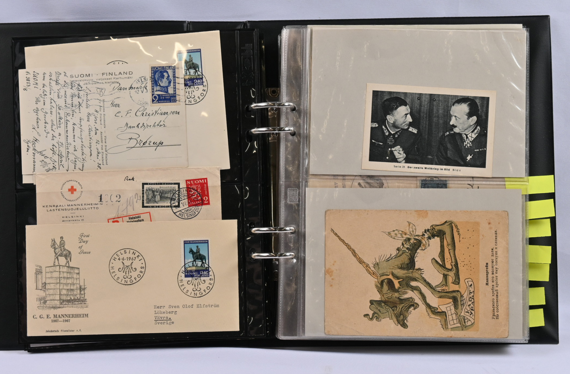 Mannerheim, erittäin hyvä materiaalia lähinnä postikortteja ja valokuvia kahdessa kansiossa. Toisessa kansiosa yli 20 vanhaa valokuvaa sekä uudistuotantoa, nimikirjoitus kortilla 1944, postikortteja, mm. venäläinen karikatyyrikortti (tahraa), filateliakohteita suomesta ja USA:sta ja vähän muutakin materiaalia. Toisessa kansiossa korttikokoelma, jossa yli 60 erilaista lähinnä modernia / uusintapainamakorttia