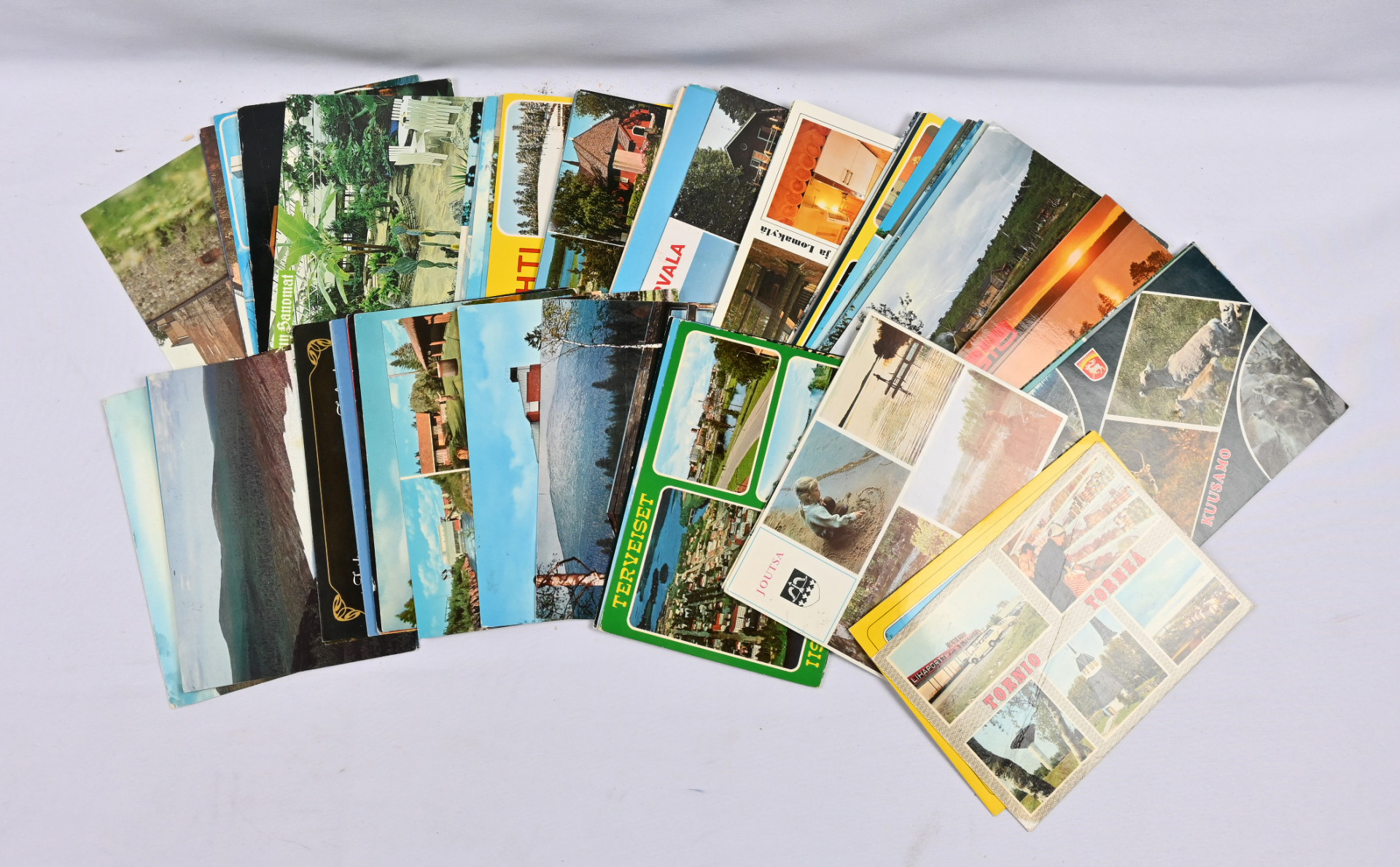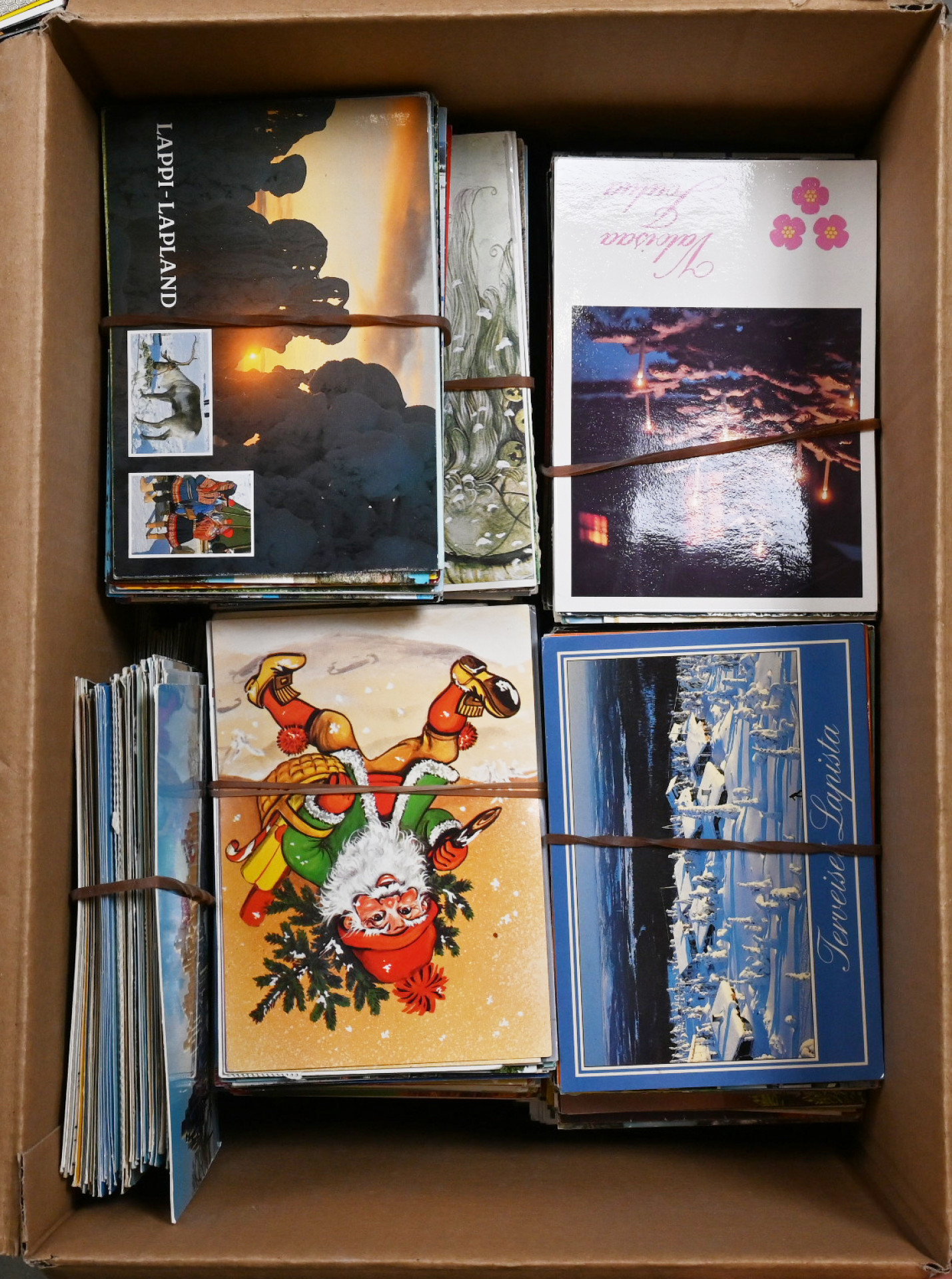 Monipuolinen erä lähinnä uudempaa korttia 10 KG laatikossa. Joulu- ja muita onnittelukortteja, paikkakuntakortteja (vähän ulkomaisiakin), mainos- ym. kortteja