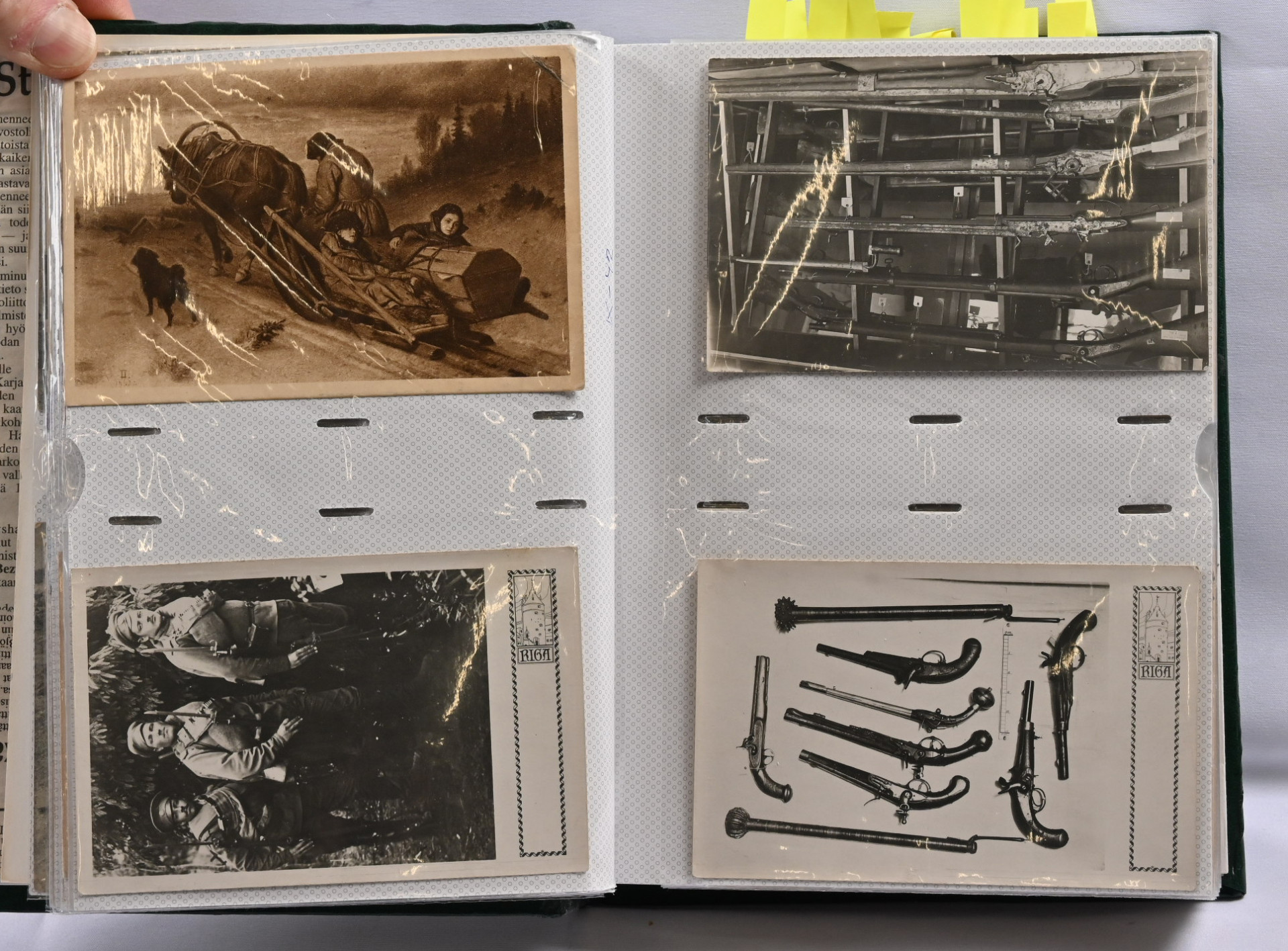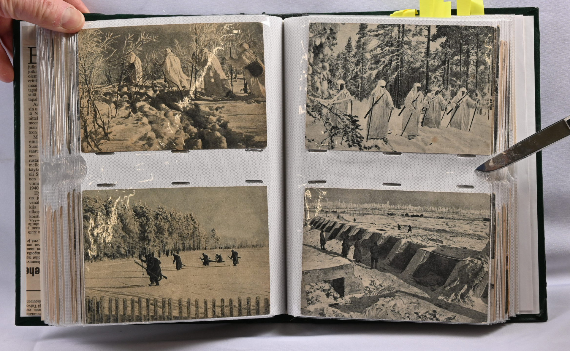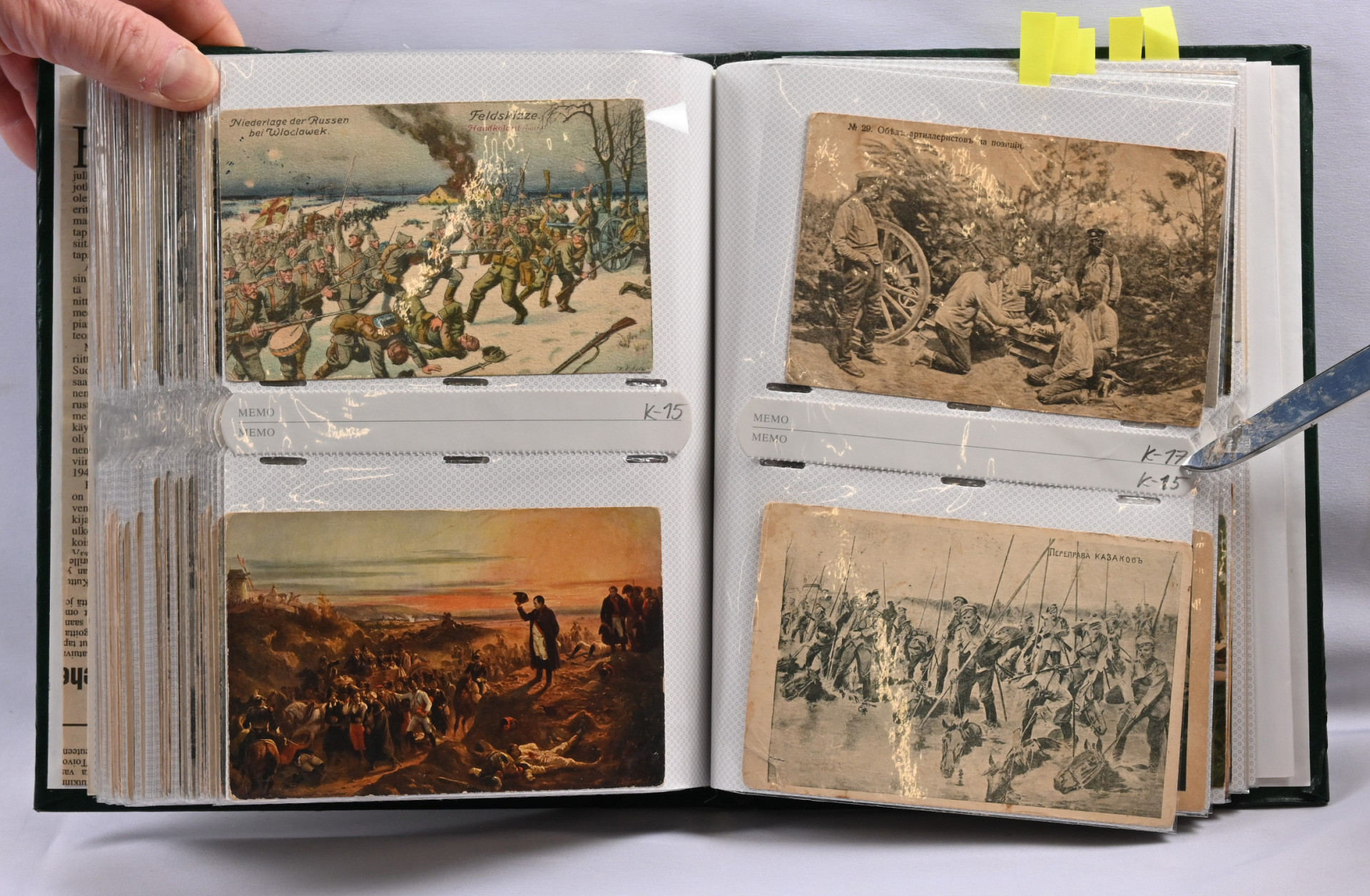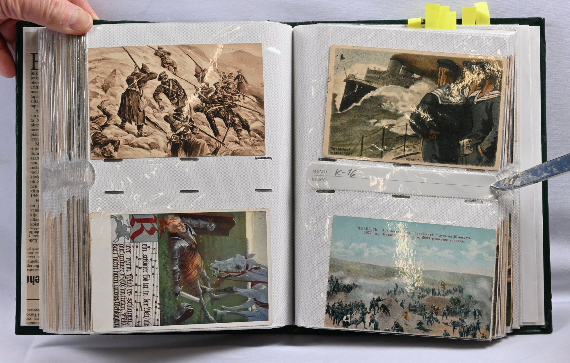 Sota-aiheisia kortteja hieno erä noin 200 kappaletta kansiossa. Suomalaisia ja ulkomaisia, paljon venäläisiä WW2 aikaisia, saksalaisia vanhempia (1. maailmansodan ajalta), suomalaisia kenttäpostikortteja, joitakin panssarivaunuja ym