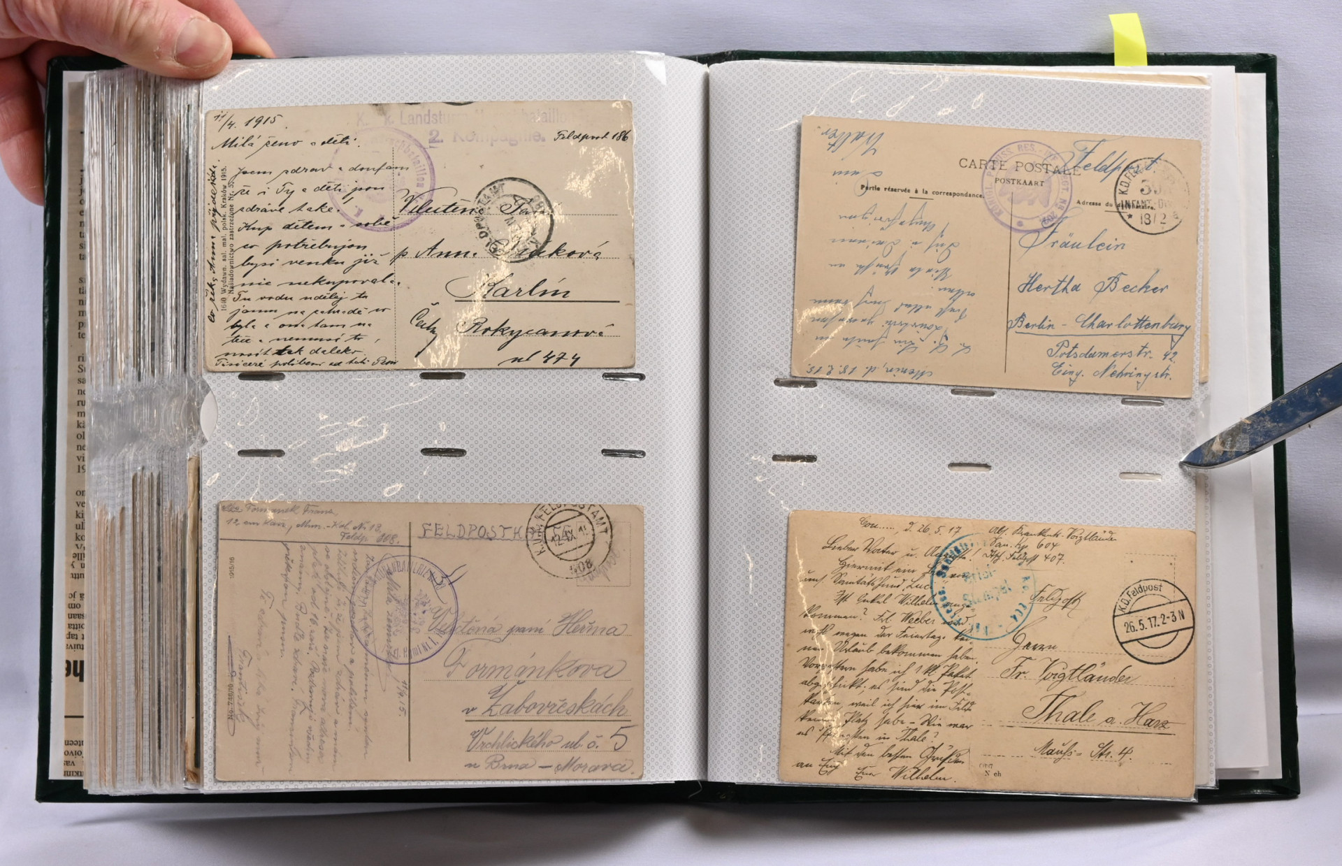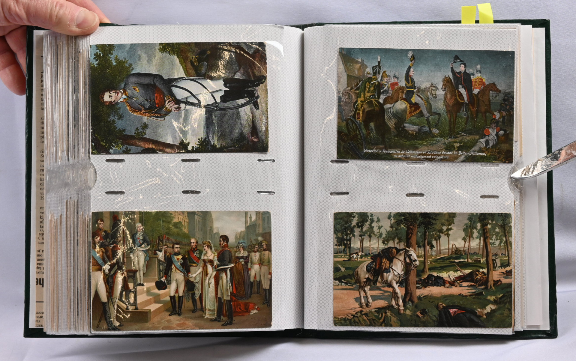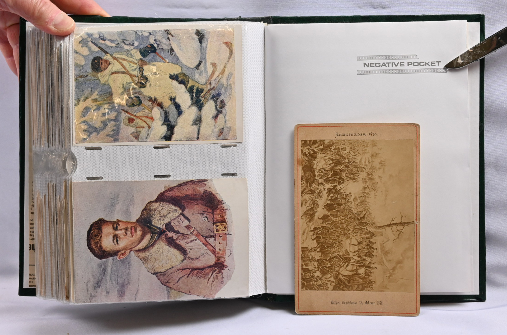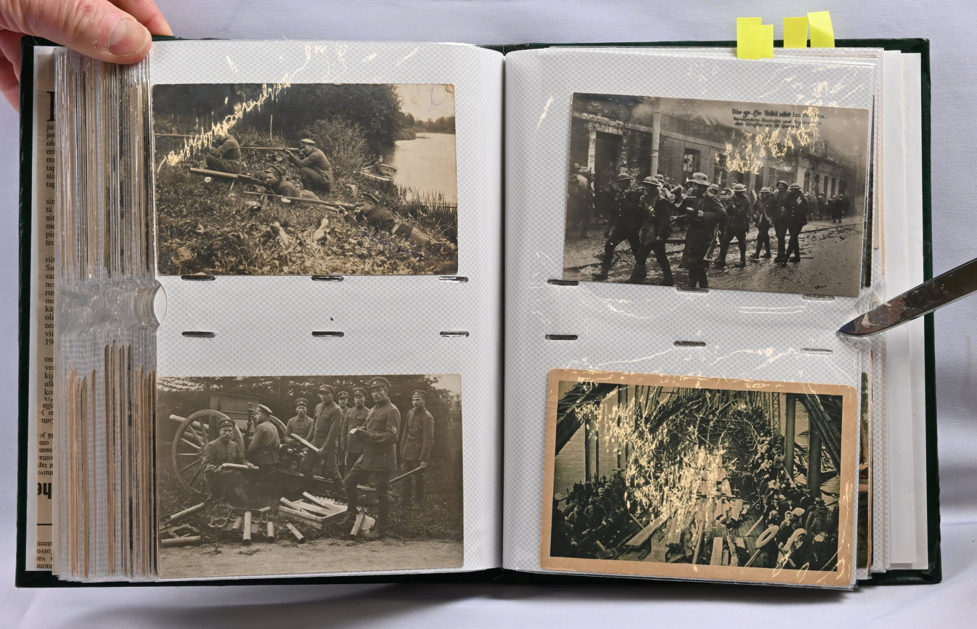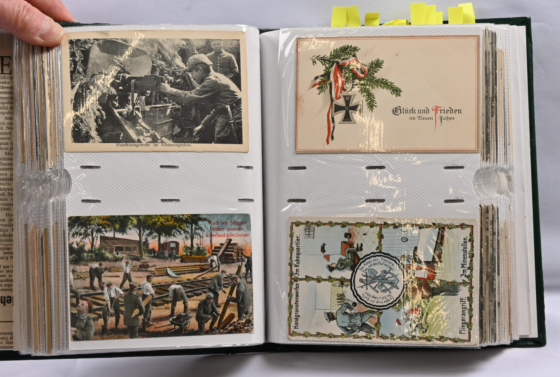 Sota-aiheisia kortteja hieno erä noin 200 kappaletta kansiossa. Suomalaisia ja ulkomaisia, paljon venäläisiä WW2 aikaisia, saksalaisia vanhempia (1. maailmansodan ajalta), suomalaisia kenttäpostikortteja, joitakin panssarivaunuja ym