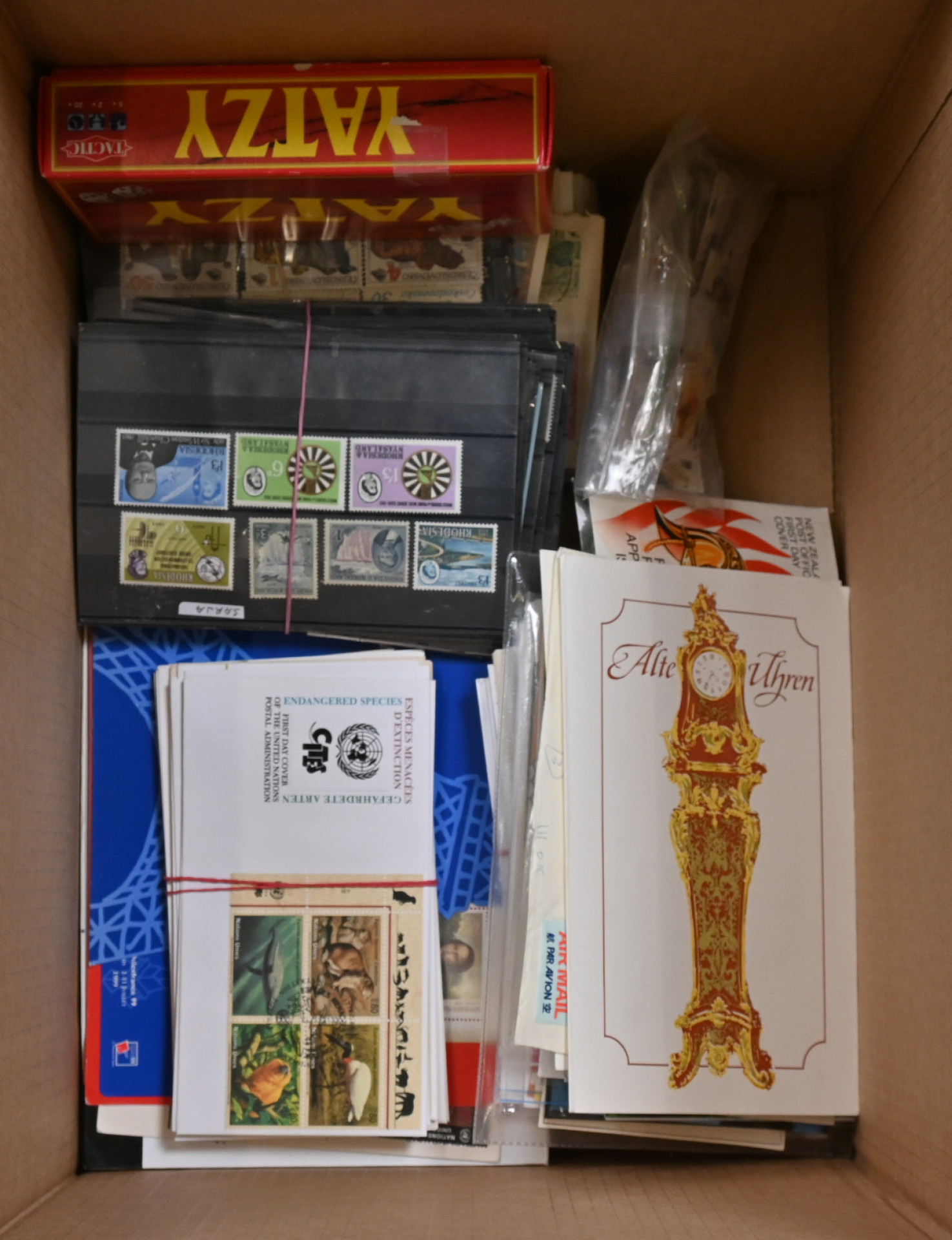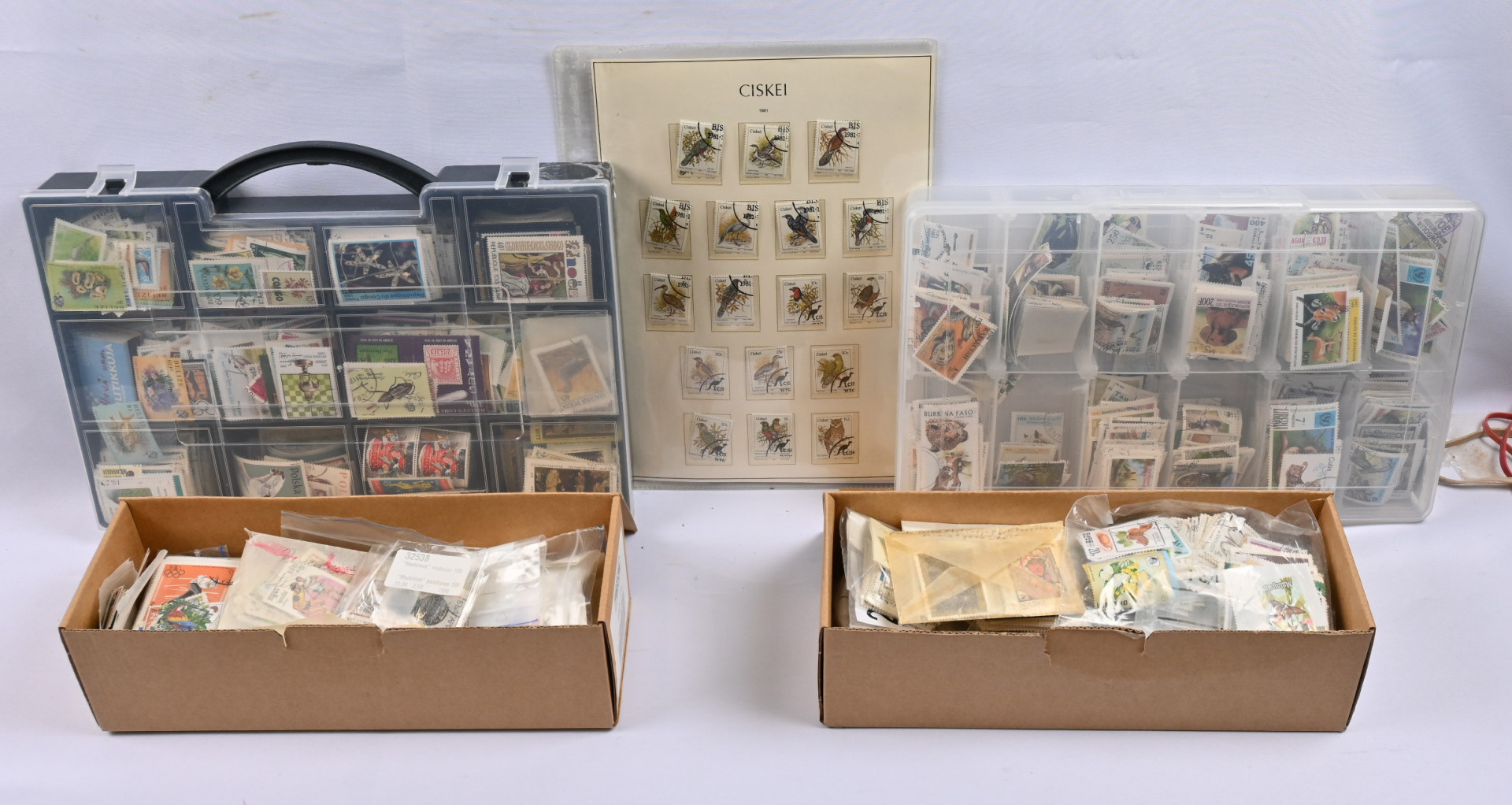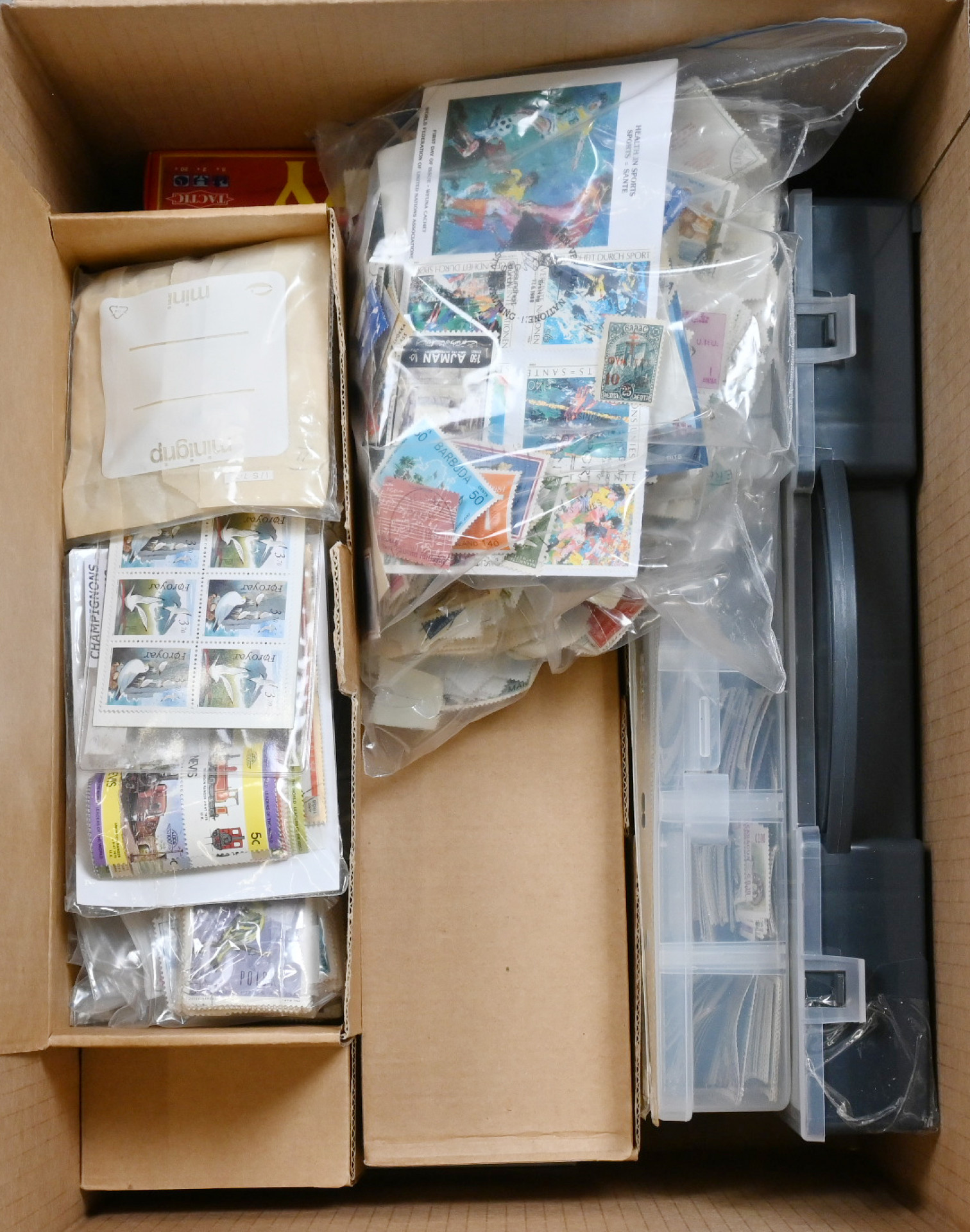 Eri aiheita, iso sekalainen massaerä monia eri aiheita pusseissa, rasioissa, varastokorteilla ym. Tuhansia ja tuhansia merkkejä, leimattua ja leimaamatonta materiaalia monista eri aiheista. Myös hiukan postilähetyksiä ym. kuoria. Yhteensä n. 5½ KG laatikossa.