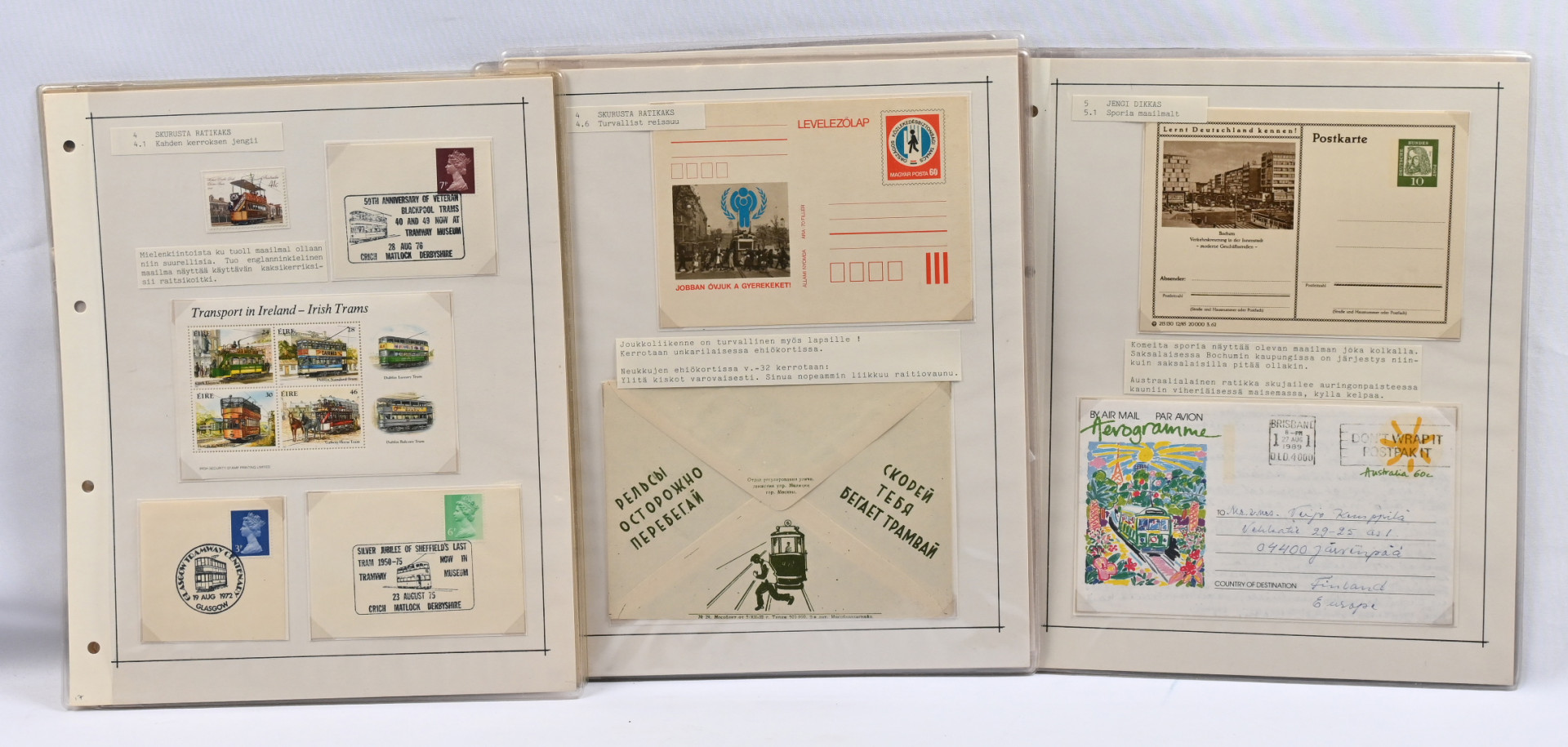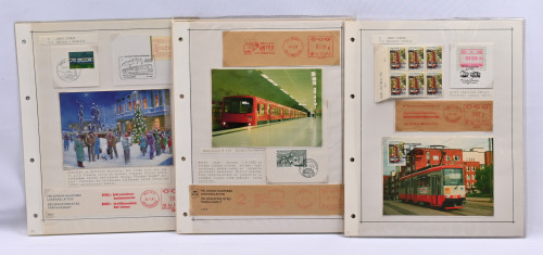 Raitiovaunu / Spora -näyttelykokoelma 20 kokoelmalehdelle monteerattuna, lisäksi erä juna-aiheisia postimerkkejä