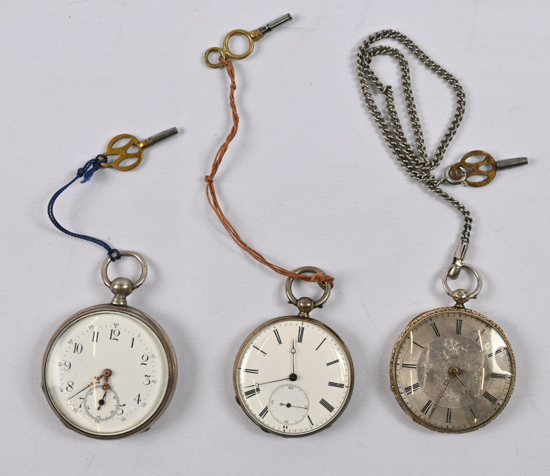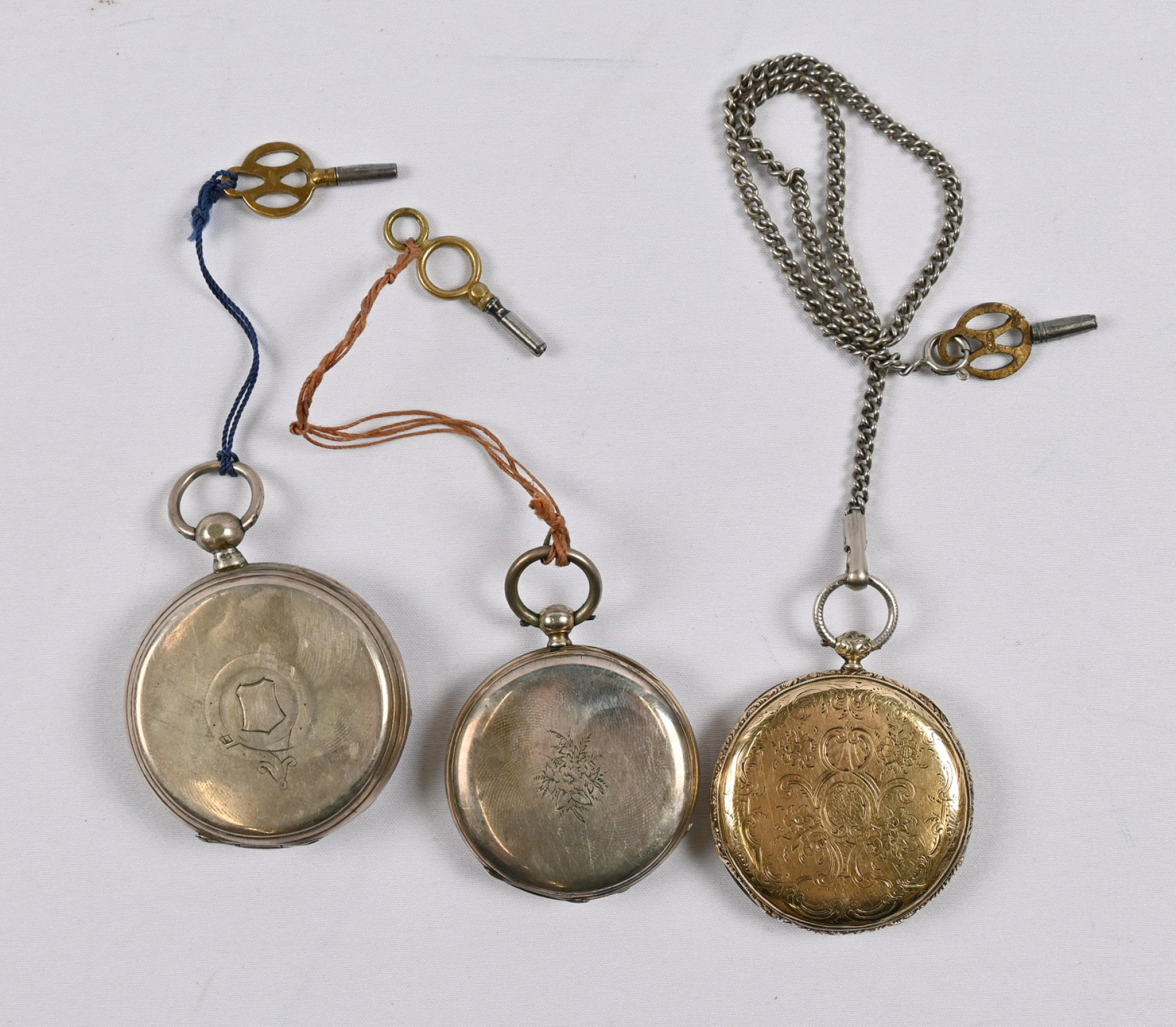 Vanhoja taskukelloja kolme erilaista avaimmilla vedettävää. Tavanomaista käyttökulumaa