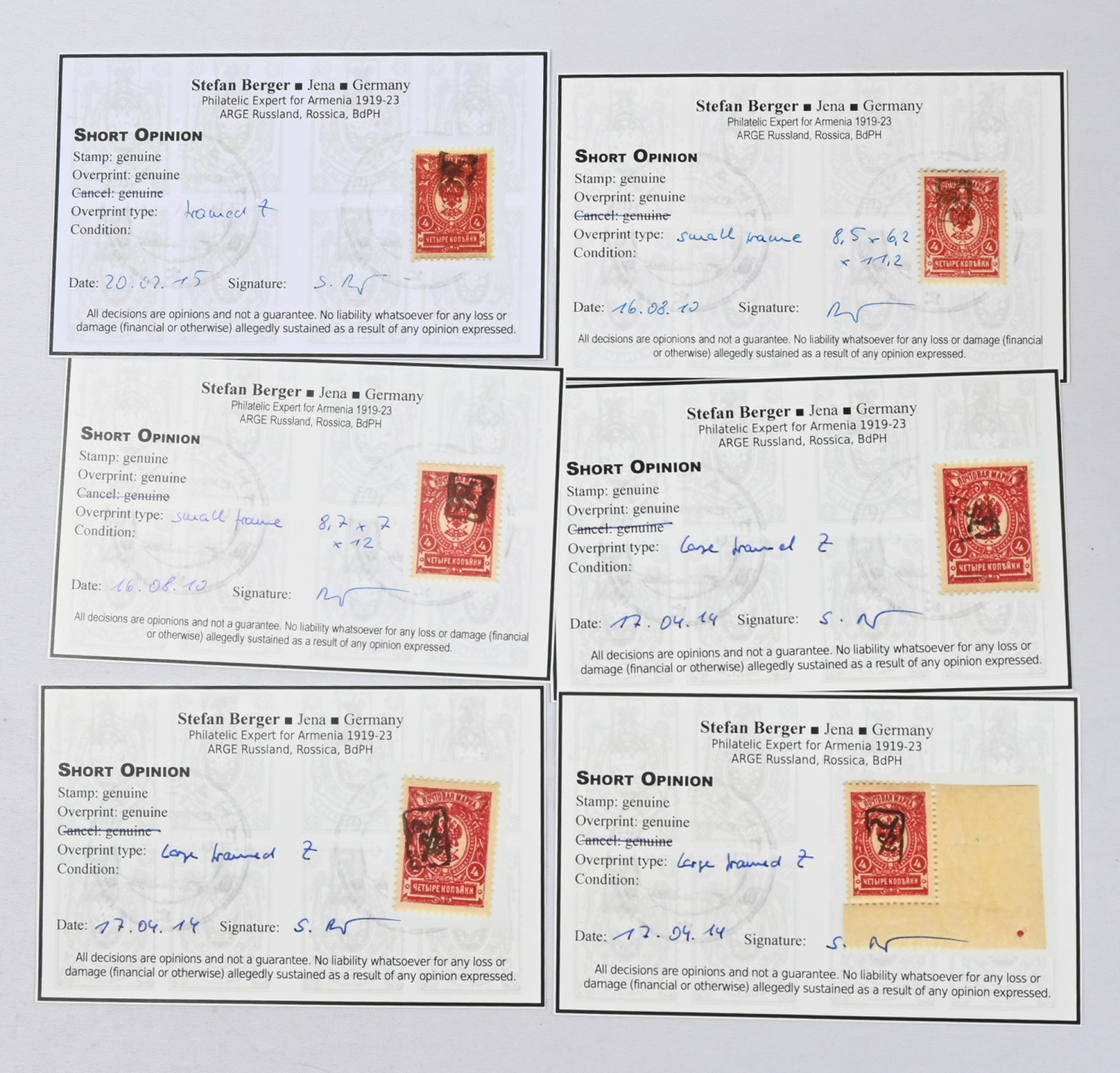 1919 Kehystetty Z 4 kopeekan merkillä Mi 6a, mielenkiintoinen erä jossa kuusi merkkiä, jokaisesta aitoutus (short opinion): Berger
