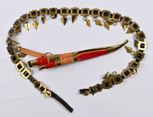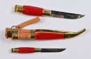 Iisakki Järvenpää kaksineuvoinen puukko ja helvavyö noin 90 cm. Hienokuntoiset puukot!