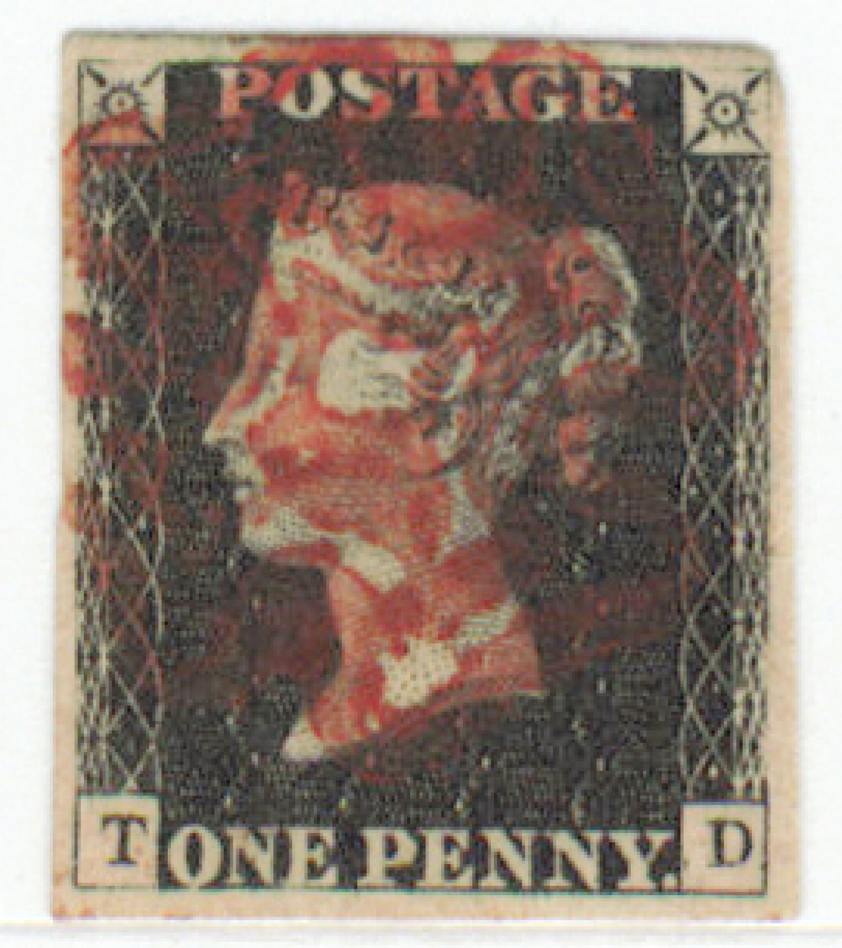1840 Penny Black Mi 1, leimattu ehjäreunainen merkki, maailman ensimmäinen postimerkki!