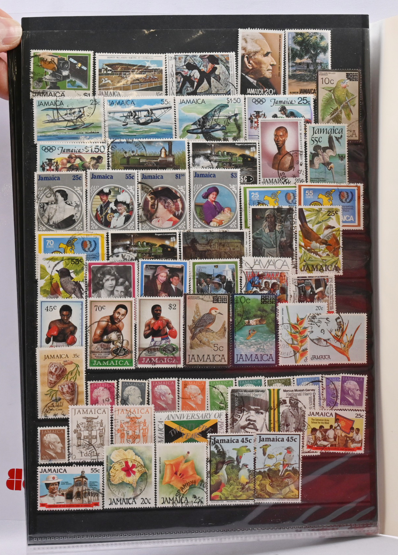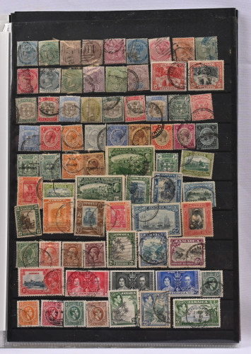Merkkierä varastosivuilla alkaen 1800-luvulta. Muutamalla sivulla vanhempaa sisältäen muutaman shillinkiarvon, pääosin kuitenkin uudempaa värikästä leimattua materiaalia