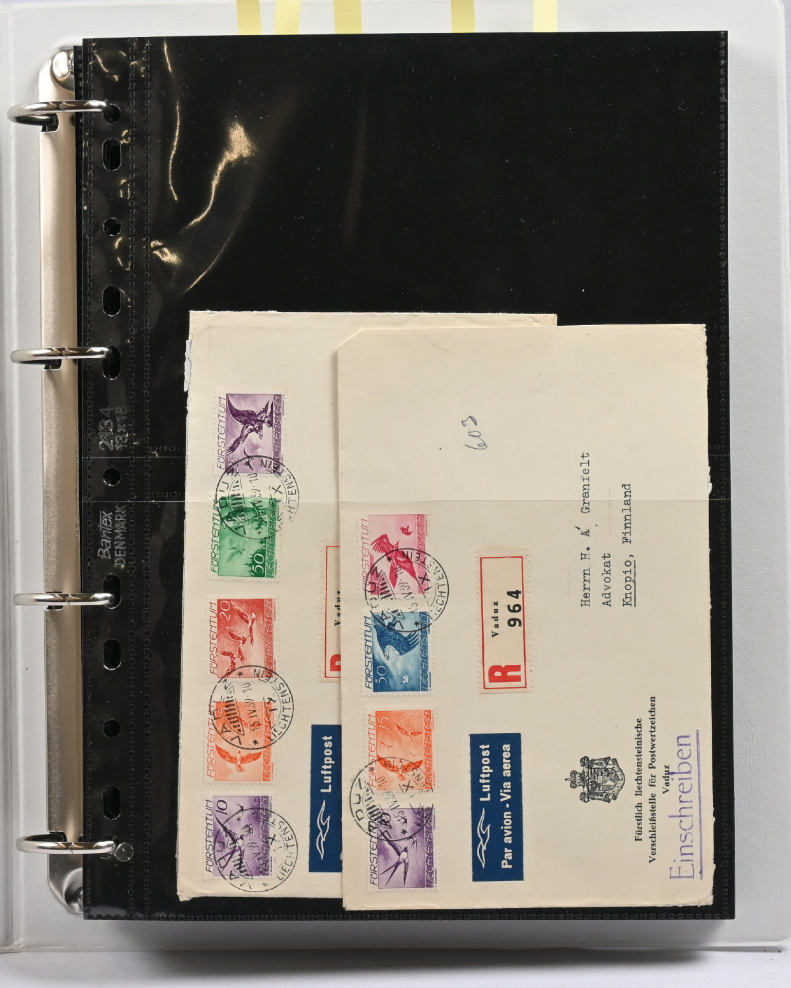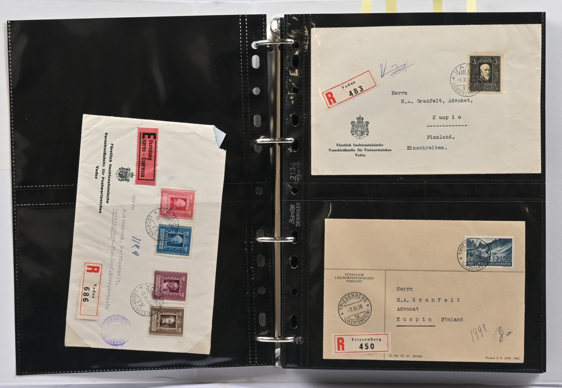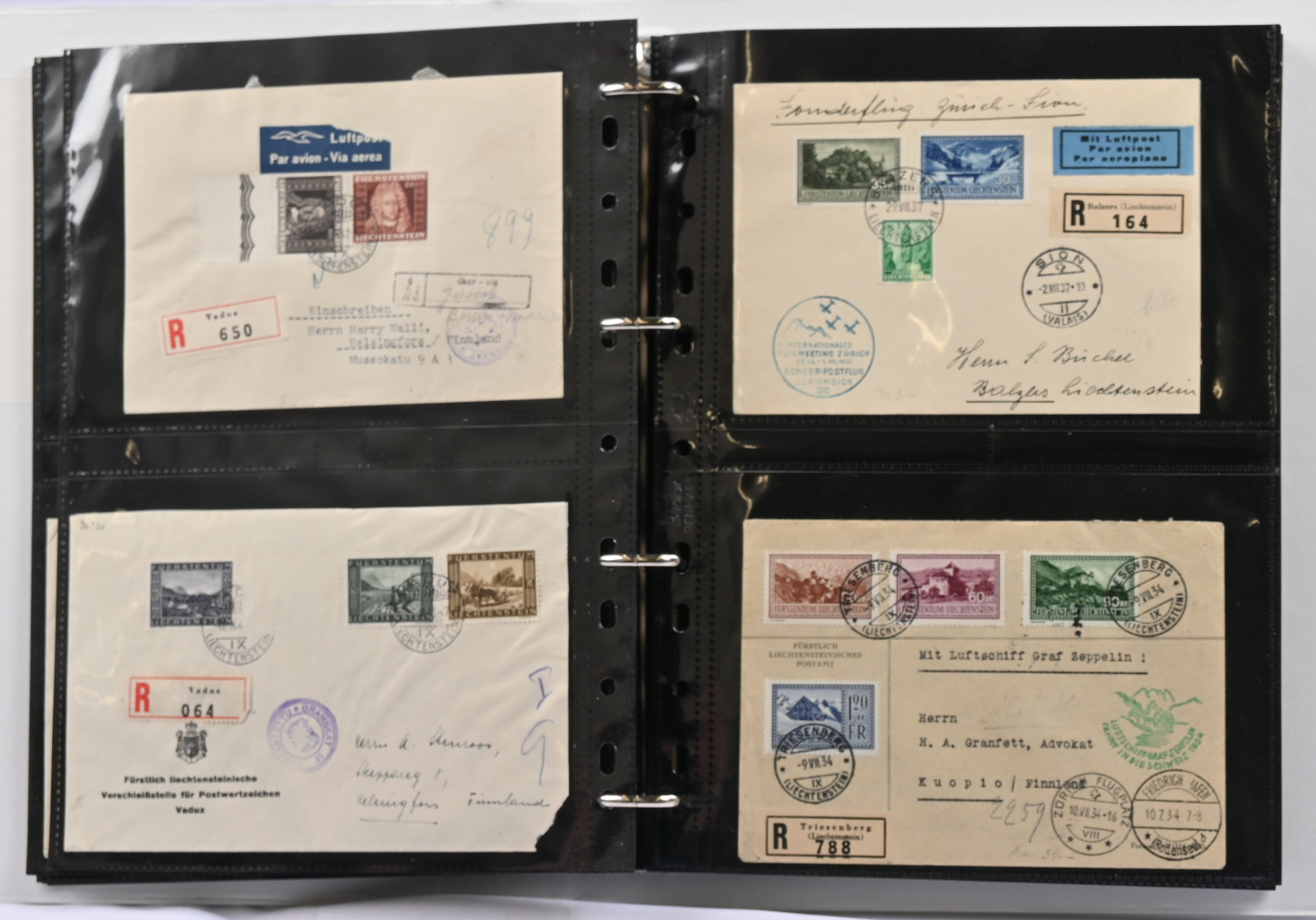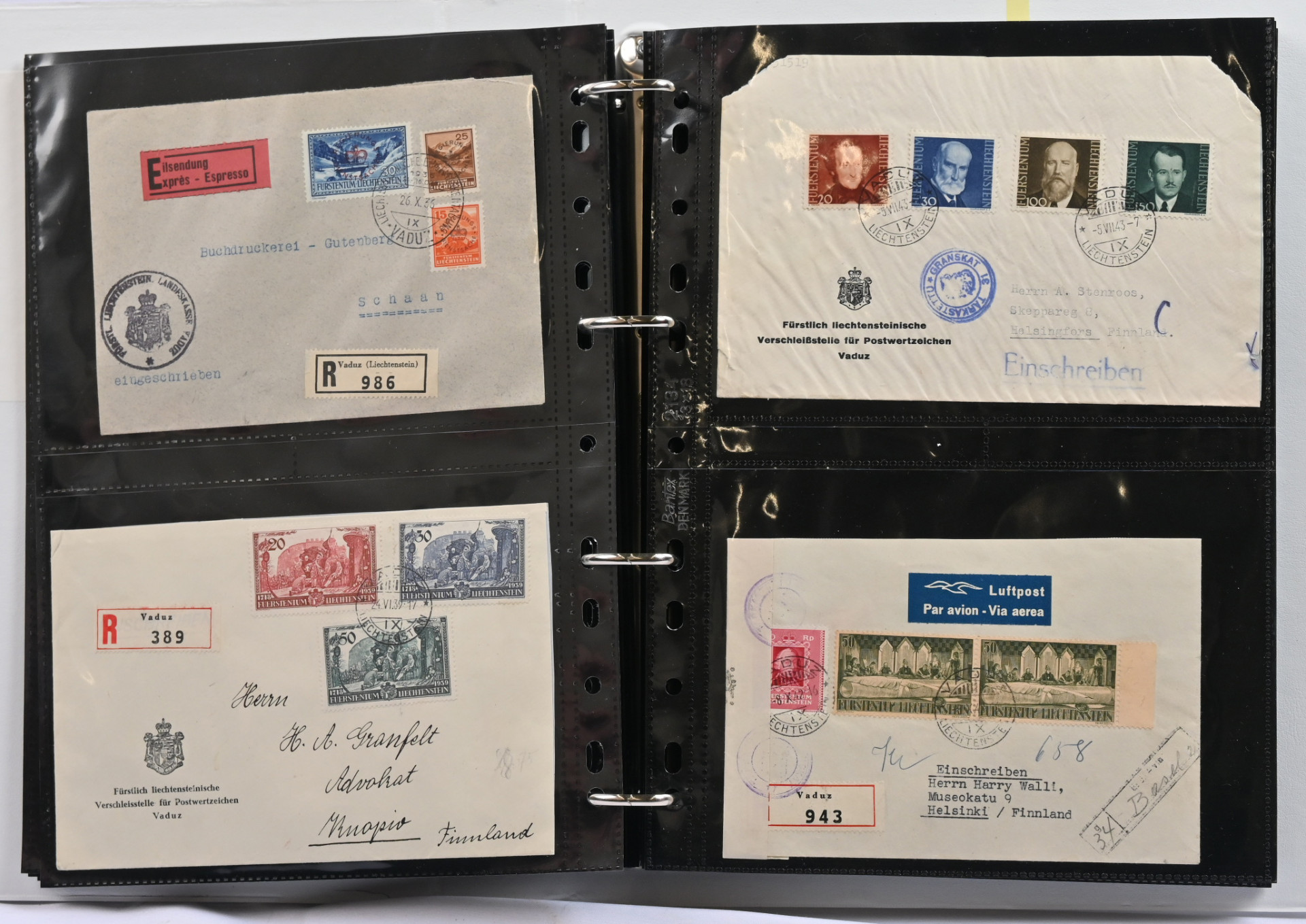 1934 - 1943 kiintoisa postilähetyserä albumissa. Lähes 30 pääosin Suomeen tulleita kirjattuja kirjeitä, muutama pikakirje, sensuuri, lunastus jne. Monia keskihintaisia merkkejä kuorilla, mm. Mi 135-138 Zeppelinkuorella, Mi 152-155 kirjattu FDC-kuori 30.VI.37 Kuopioon, Mi 171 yksin kirjatulla kuorella Suomeen Vaduz -38 ja saapumisleima Kuopio -38, Mi 169, 179, 198-201, virkamerkkejä jne. Lisäksi samassa kansiossa erä uudempaa materiaalia, mm. FDC-kuoria, tavallista posti jne. Kiintoisa!