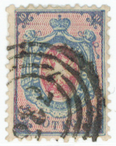 1860 10 kopeekkaa tummansininen/karmiini Mi 1b, siisti leimattu merkki, vain yksi taittunut hammas