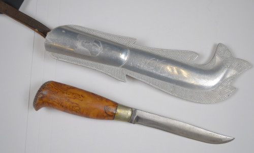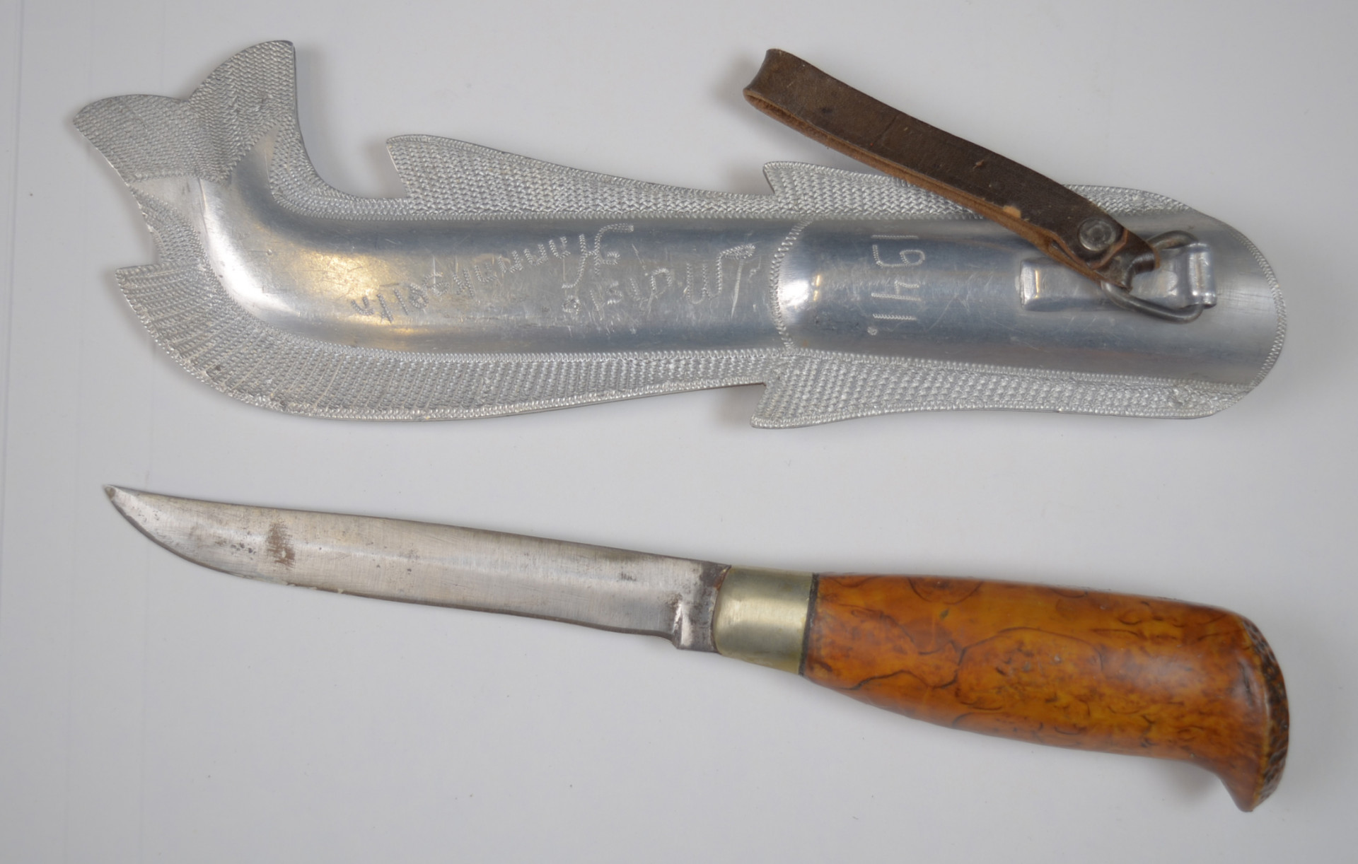 Puhdetyöpuukko, jonka tupessa mm. Muisto Karjalasta 1941. Pituus noin 30 cm