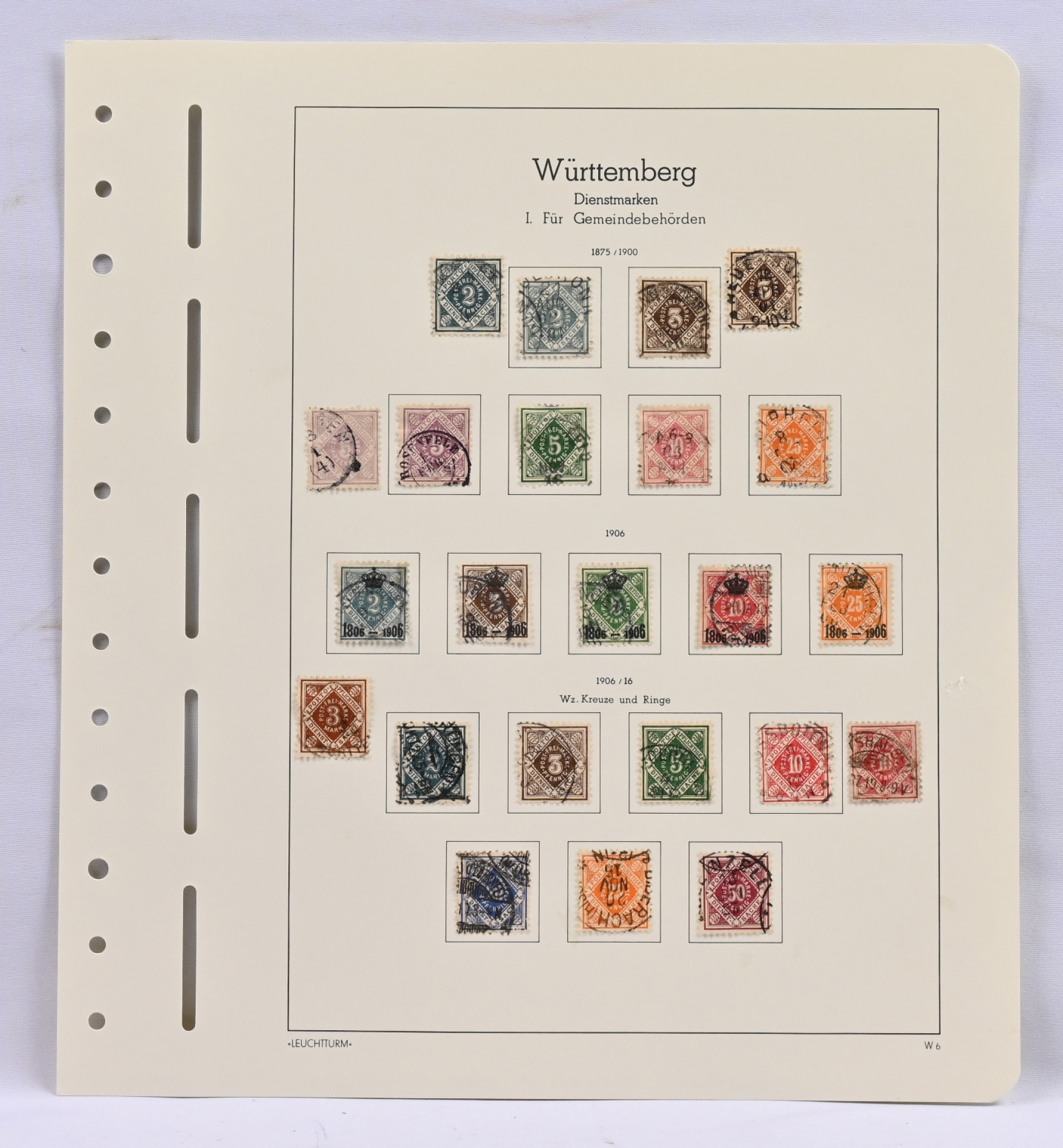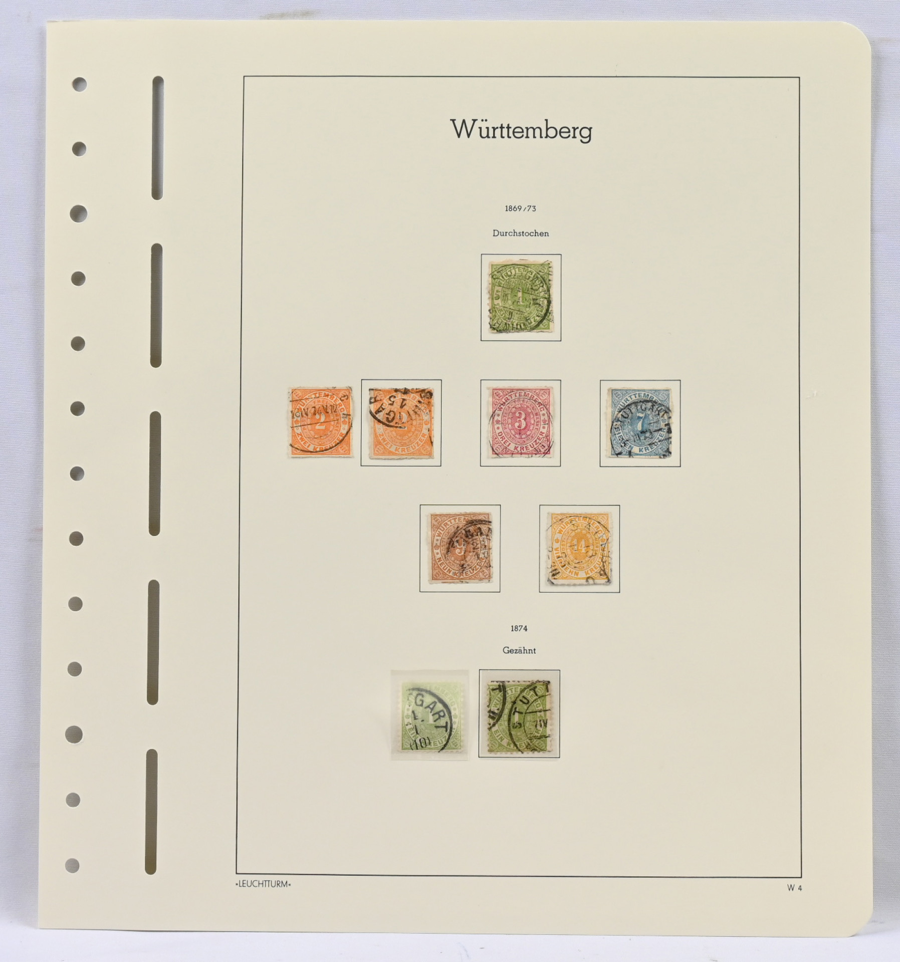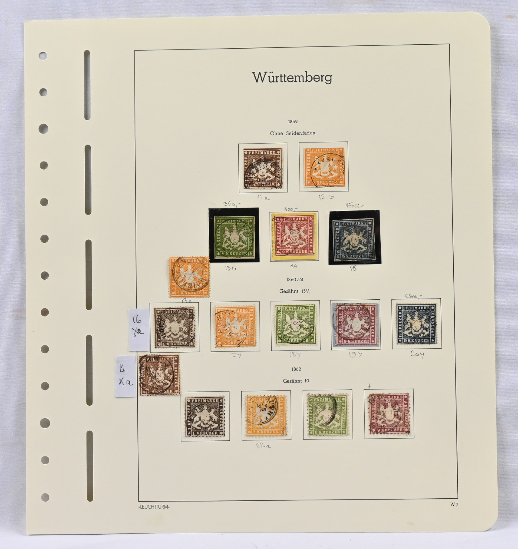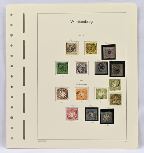 Württemberg, UPEA leimattu kokoelma taskullisilla kansiosivuilla. Käytännössä täydellinen, puuttuu vain kallein 70 Kr merkki Mi 42. Mukana mm. kaikki arvokkaat 18 Kr merkit Mi 5 (3), 10 (2), 15, 20y, ja 29 sekä 1862 1 Kr - 9 Kr Hm 10 Mi 21-24. Myöhemmistä mm. Mi 50 (2), 52 (2), 54, 107, 188 (aitoutus, vikaa), 207, 211 ym. Todella hieno arvokokoelma!