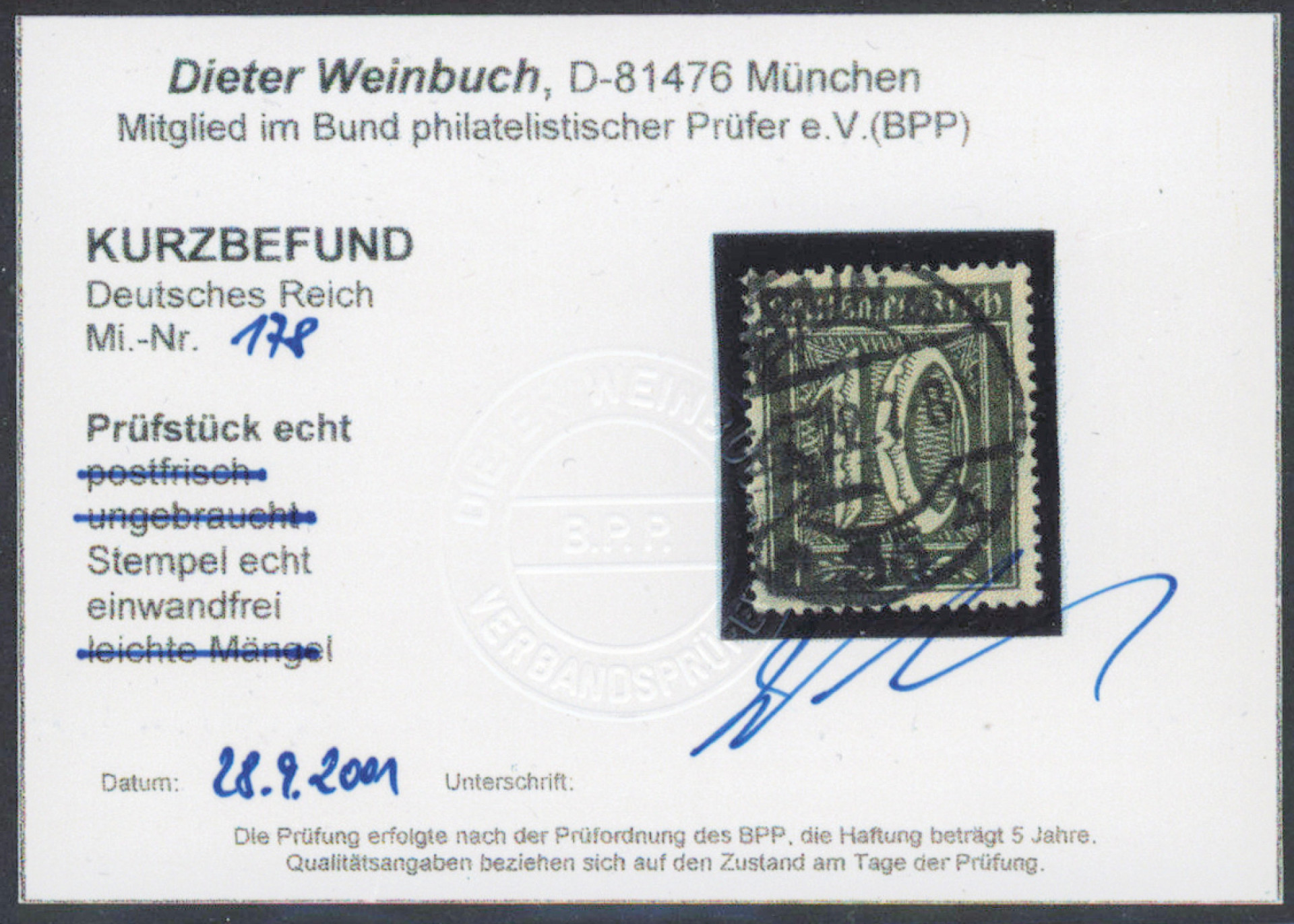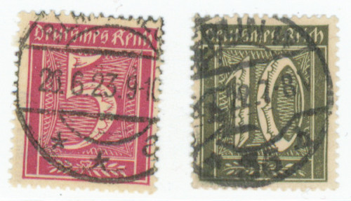 1921 numeroarvot vesileima 2 ”Rauten” 5 Pf ja10 Pf Mi 177-178, kauniit leimatut merkit. 5 Pf takuu: Infla Berlin ja Fleiner BPP, 10 Pf aitoutus: Weinbuch (2001).