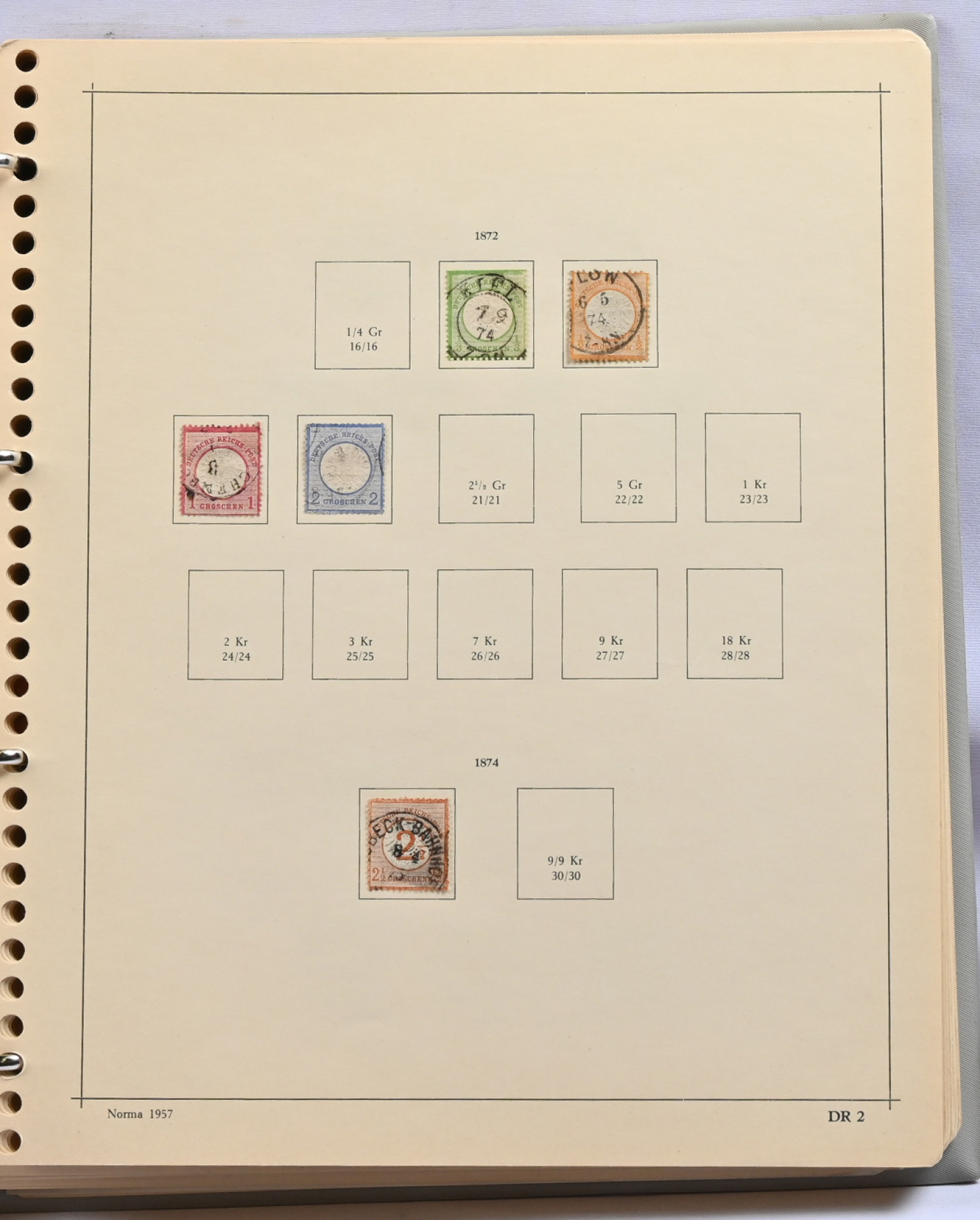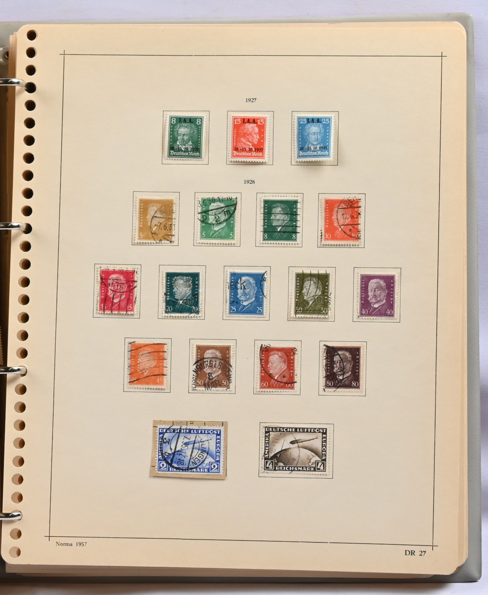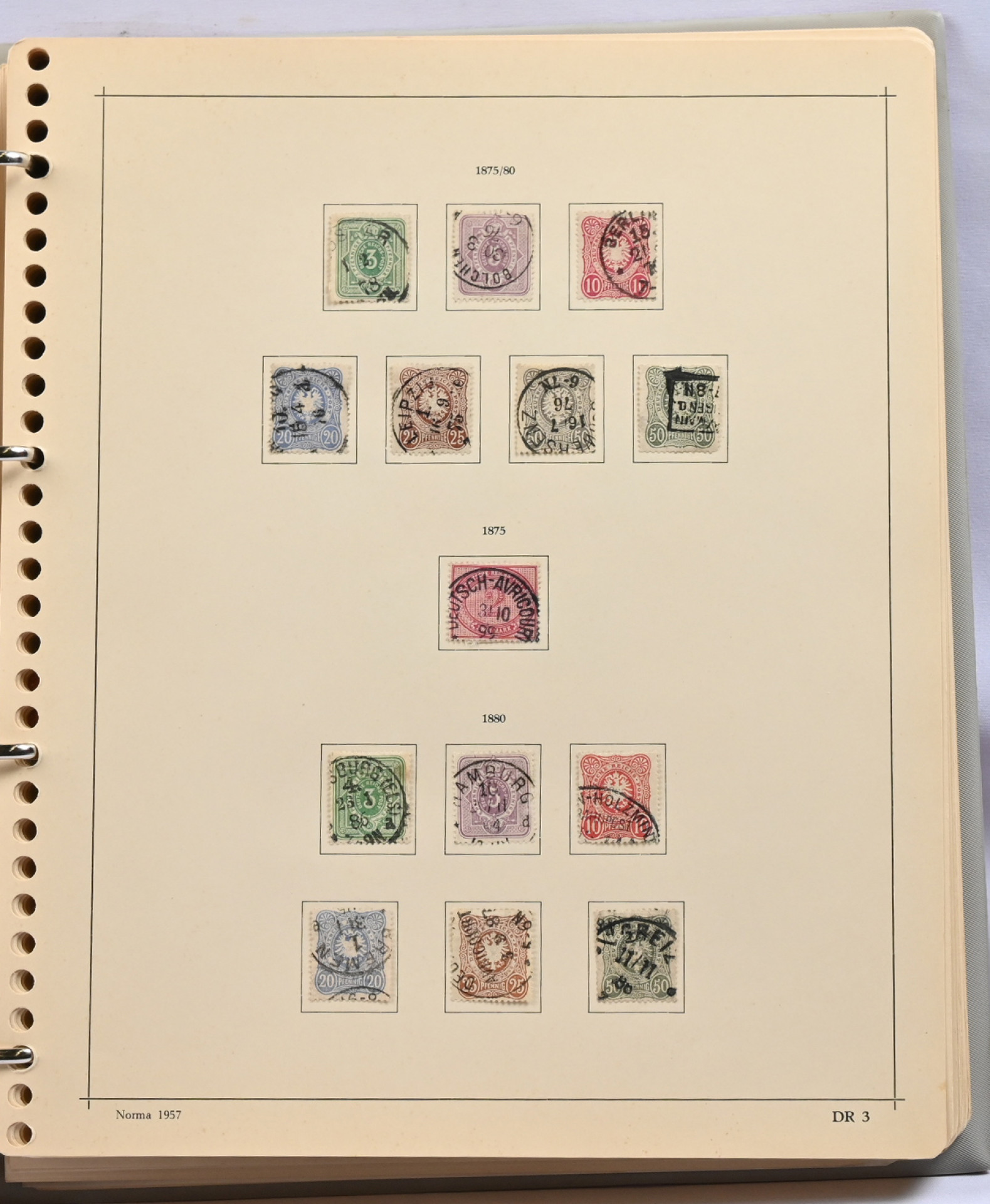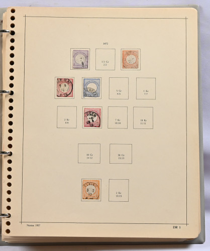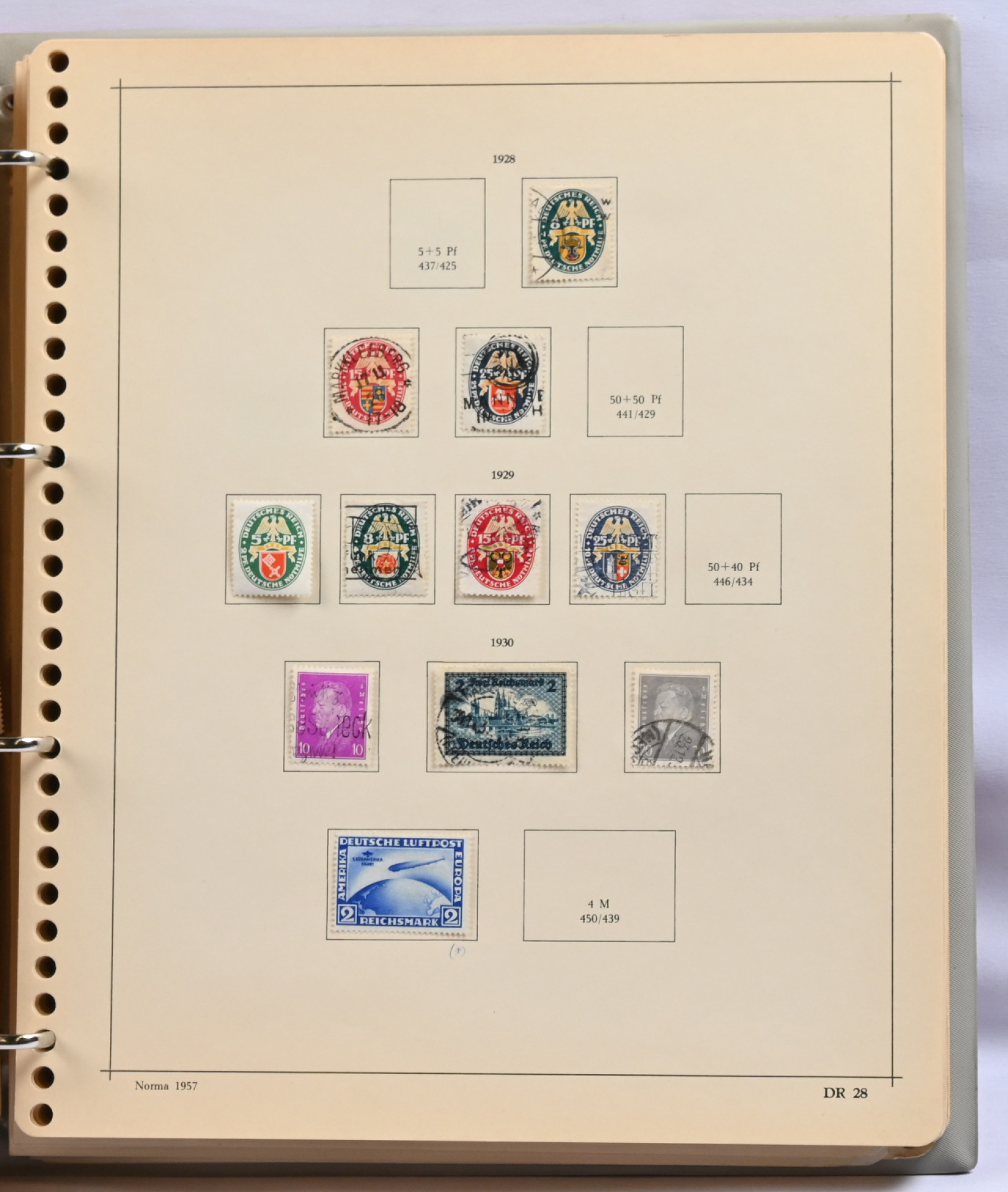 1872 - 1945 kokoelma leimattua ja leimaamatonta materiaalia vanhassa albumissa. Mukana monia hyviä keskihintaisia julkaisuja, mm. Zeppelin-merkkejä, Brustschild-julkaisua, pienoisarkkeja, myös hiukan Kenraalikuvernementtia ym.