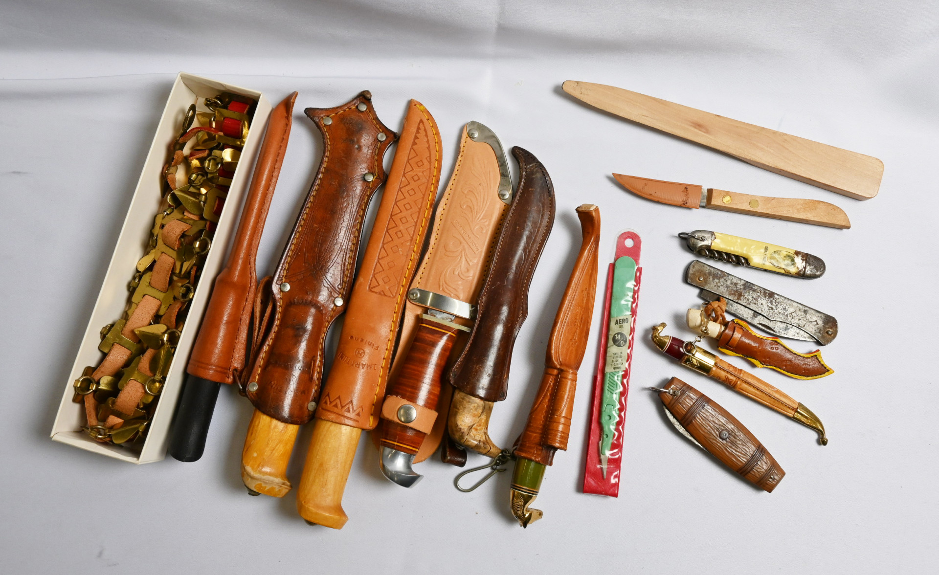 Puukkoja sekä linkku- ja muita veitsiä erä 15 kappaletta. Marttiini, Järvenpää ym. Lisäksi Järvenpään helavyö