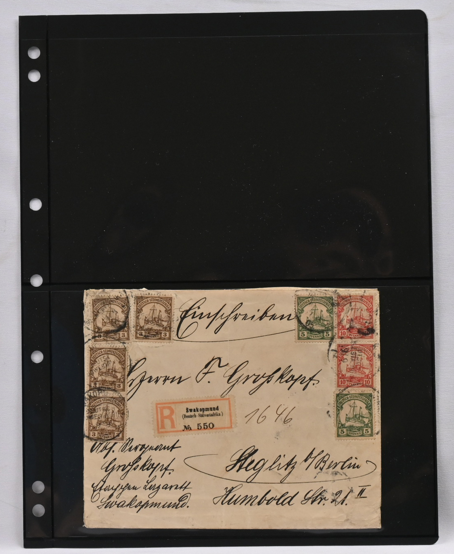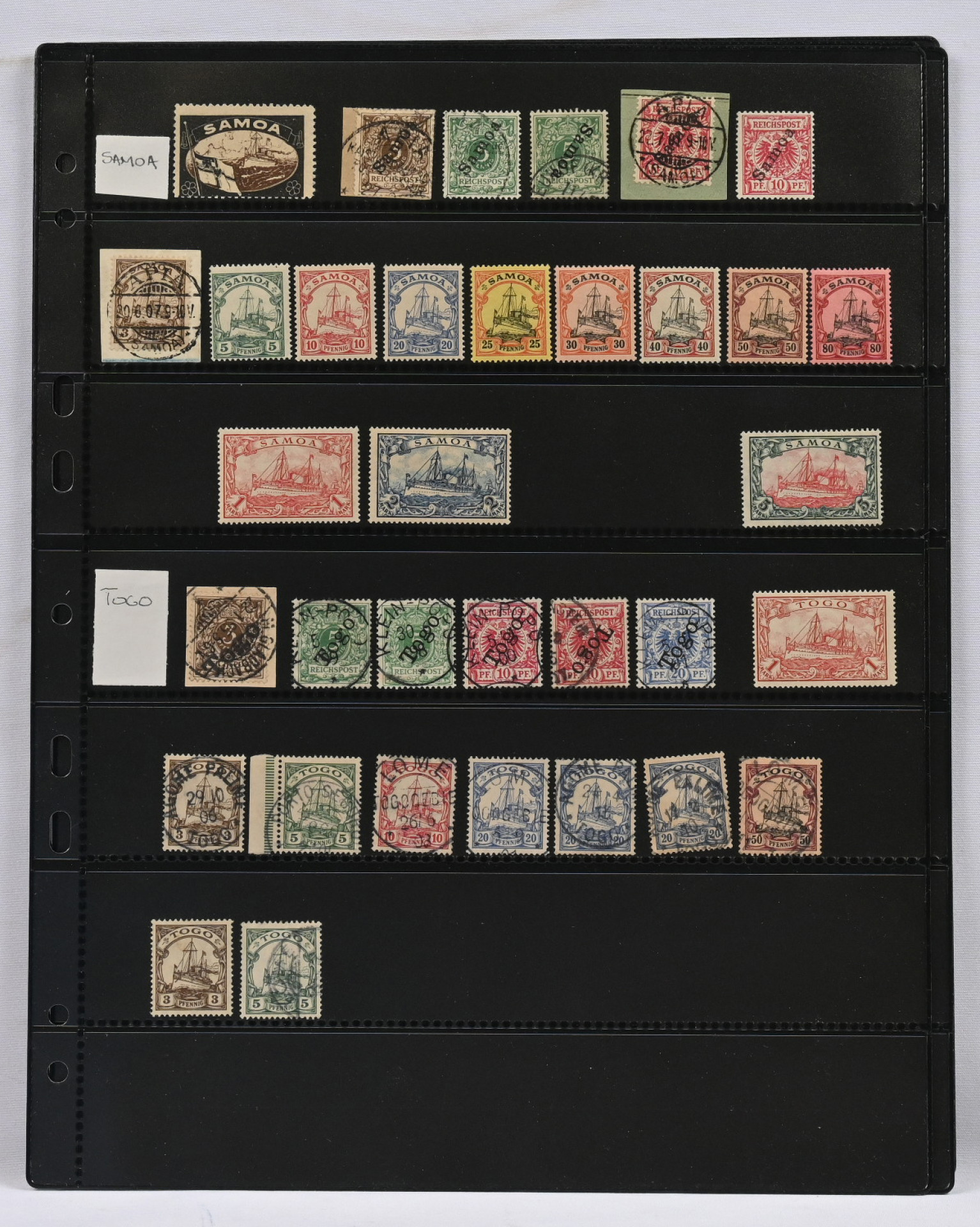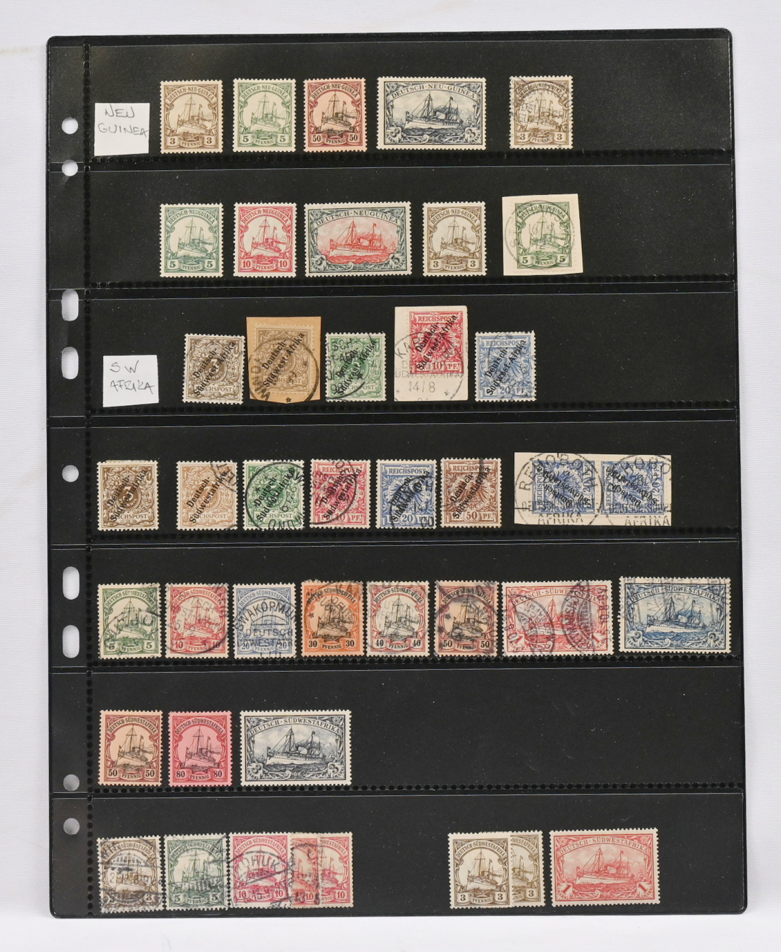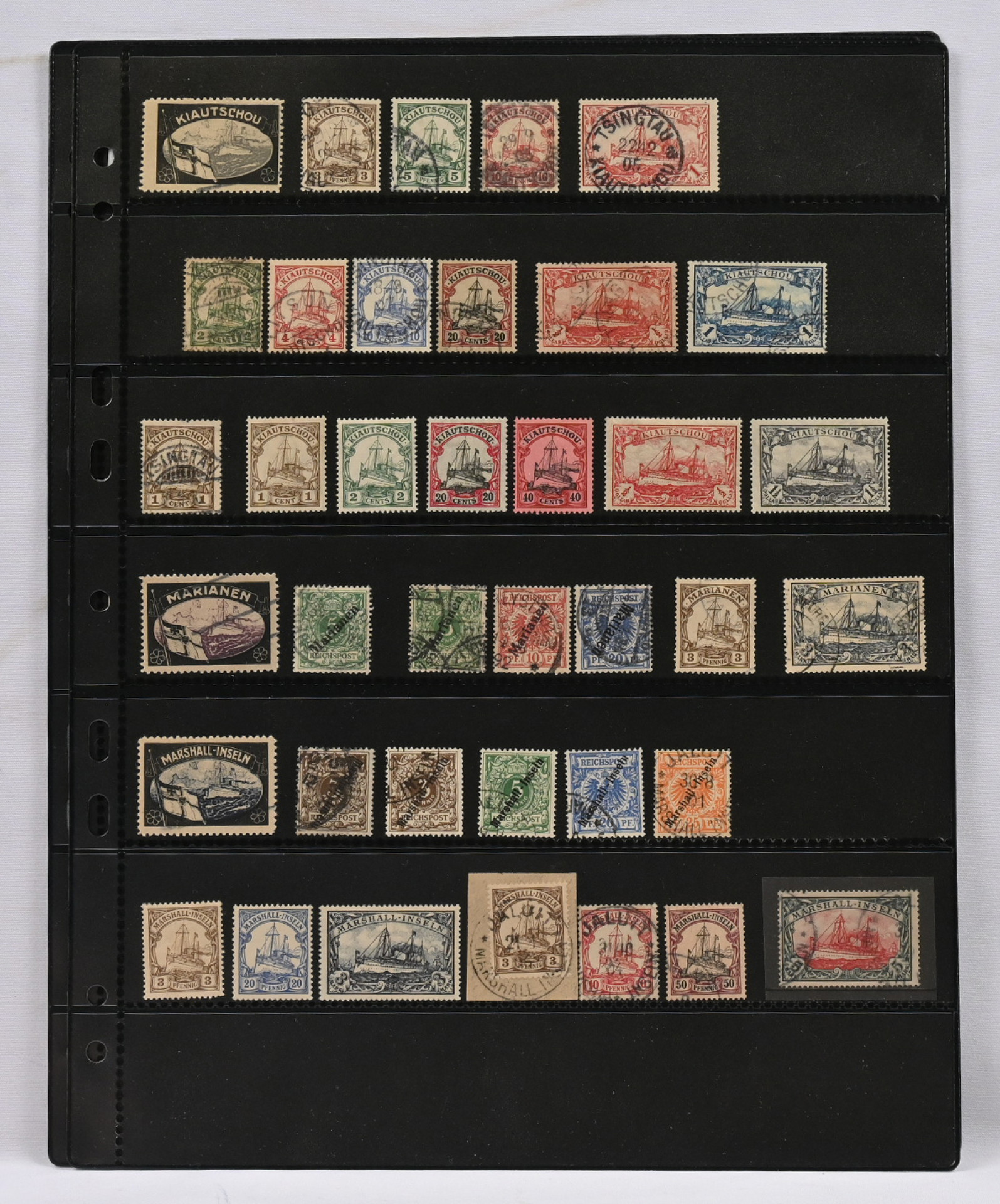 Siirtomaiden hyvä merkkierä neljällä säilytyslehdellä. Monia arvokkaampia merkkejä kuten Lounais-Afrikka Mi 20-21 o, 22 * sekä kirjattu kuori Saksaan Mi 11 - 13 8 kpl, Kamerun Mi 16, Karoliinit Mi 18, Kiatschou Mi 14 loisto, 24 ja 25, Mariaanit 4 päällepainamaa (aitous?) ja Mi 18, Marshall-saaret Mi 10 ja 11 o, 25 o, Samoa 23 * ym.