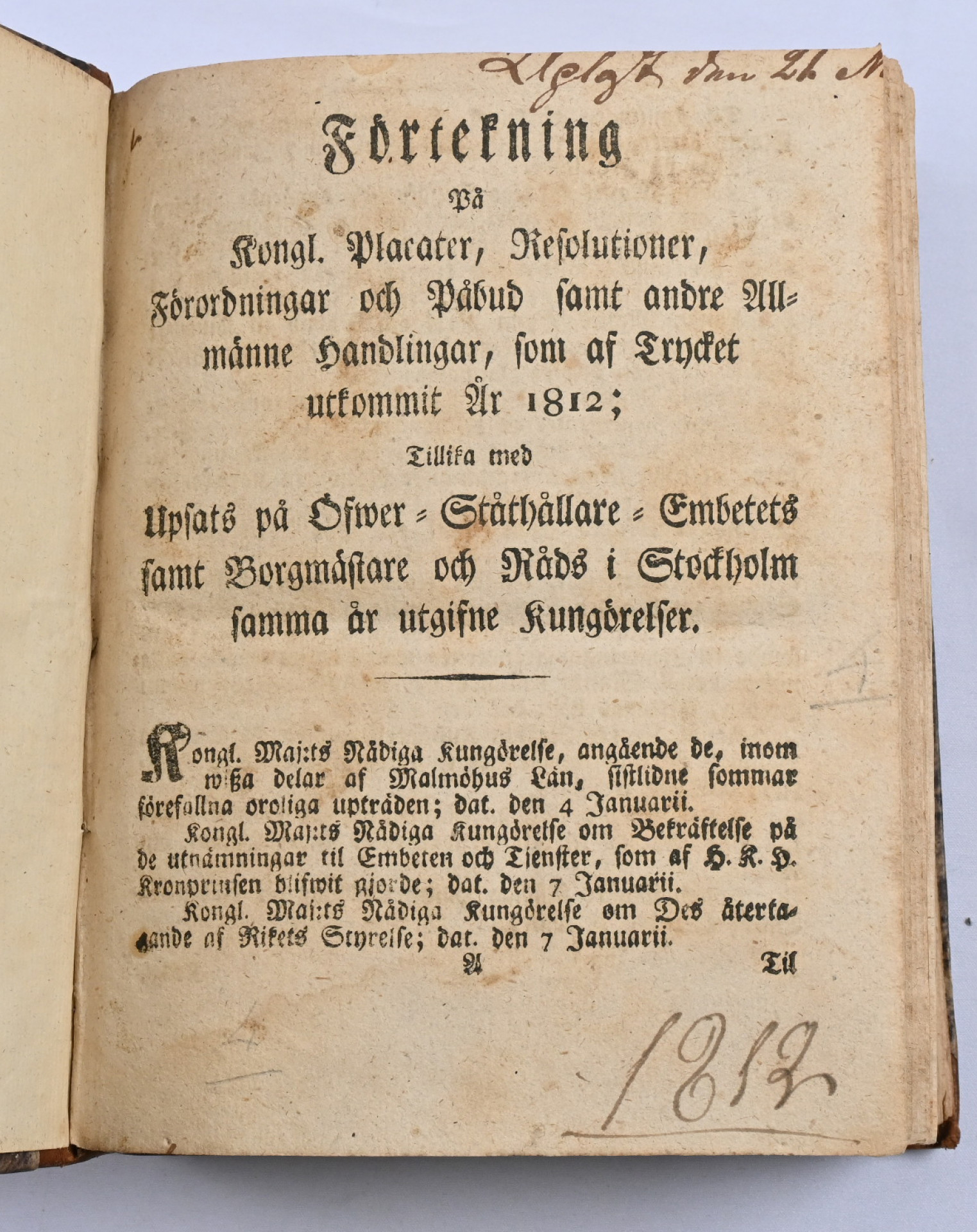 Kuninkaallisia asetuksia vuodelta 1812 sidottuna kirjaksi noin 60 kpl. Tavanomaista käyttökulumaa ja ajan patinaa
