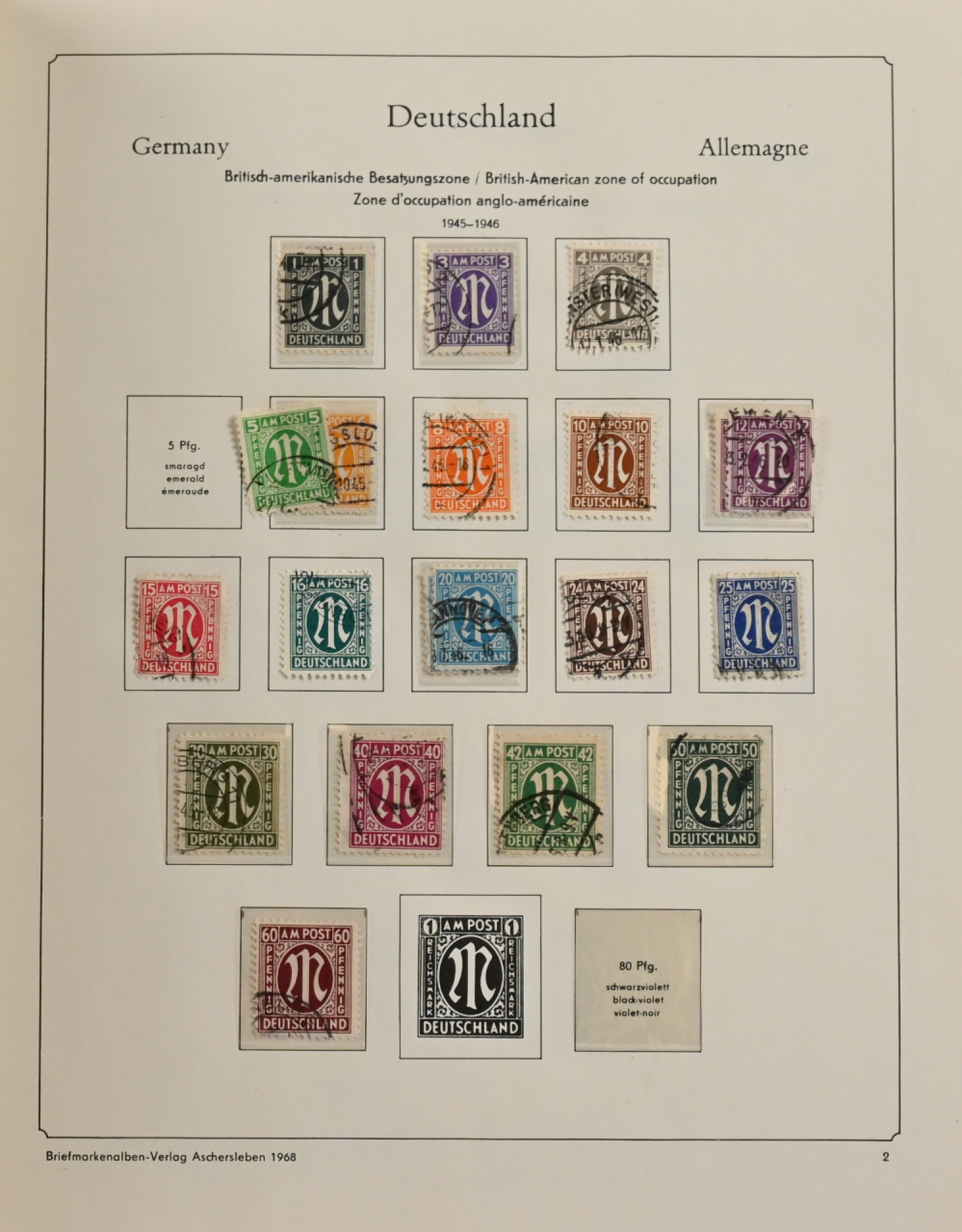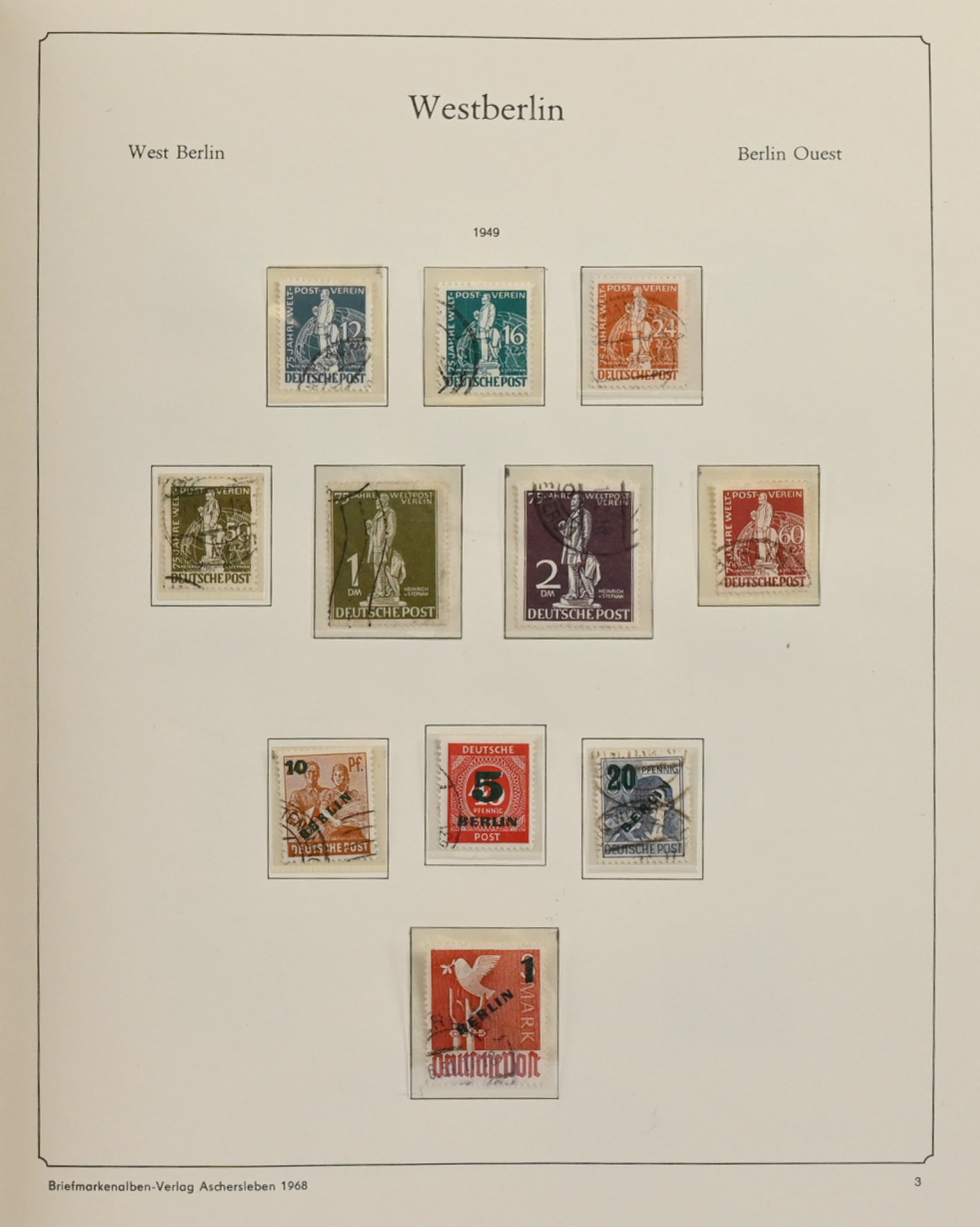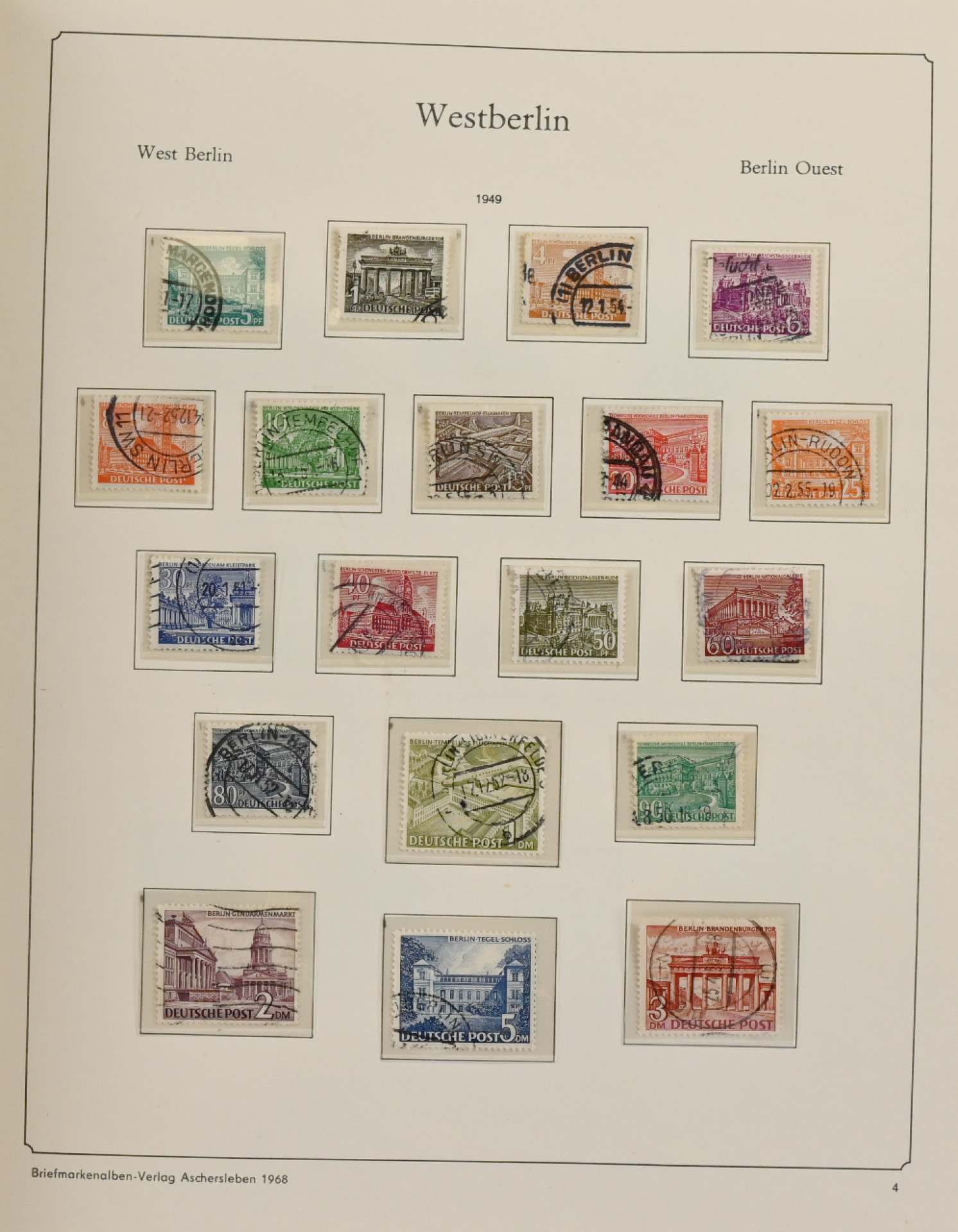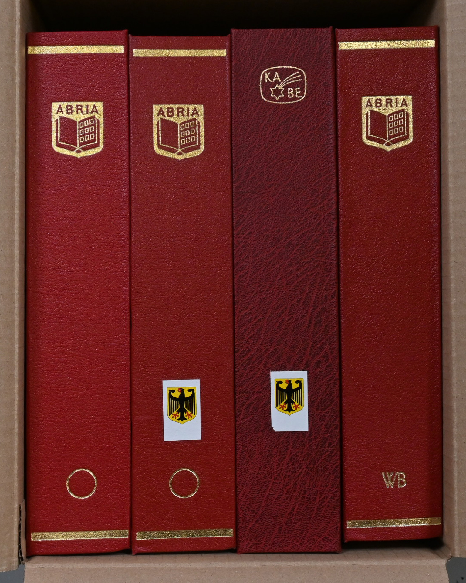 1945 - 1989 2. maailmansodan miehitysvyöhykkeet, Berlin (West) ja Länsi-Saksa leimatut kokoelmat kolmessa hyvässä taskutetussa kansiossa. Länsi-Saksa lähes täydellinen, mm. lähes kaikki alkupään paremmat merkit mukana, Berlin varsin hyvä, miehitysvyöhykkeissä vähemmän merkkejä. Lisäksi neljäs kansio yhdistyneen Saksan merkeille (tyhjä)
