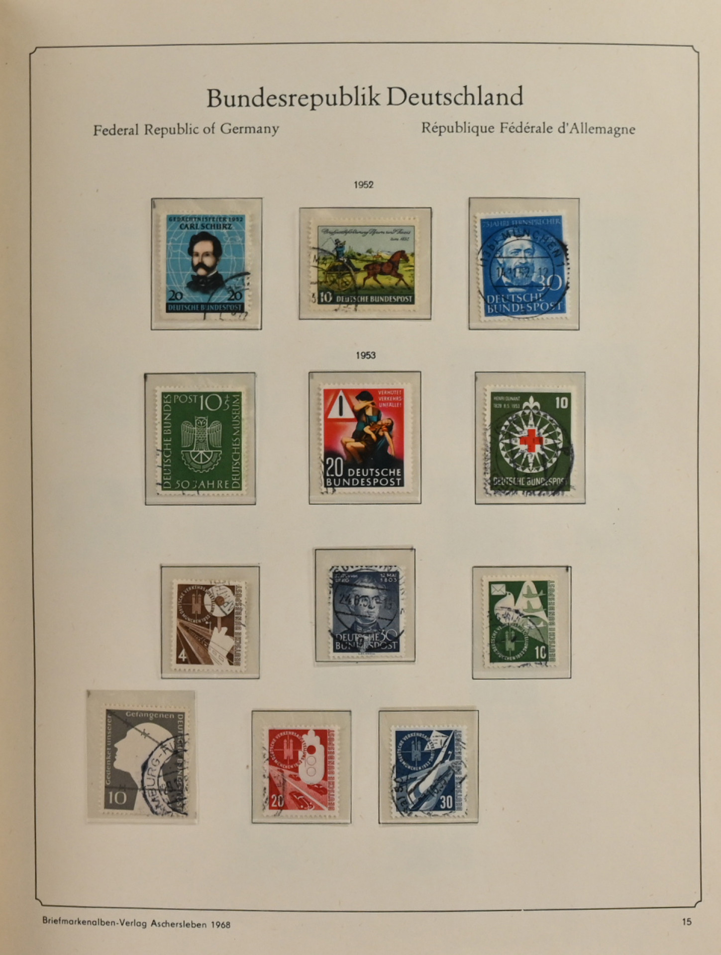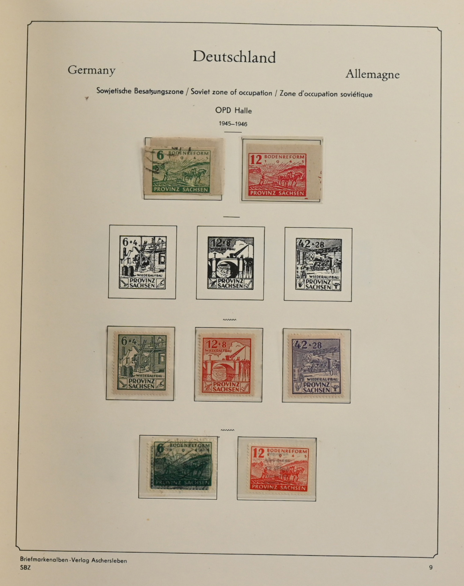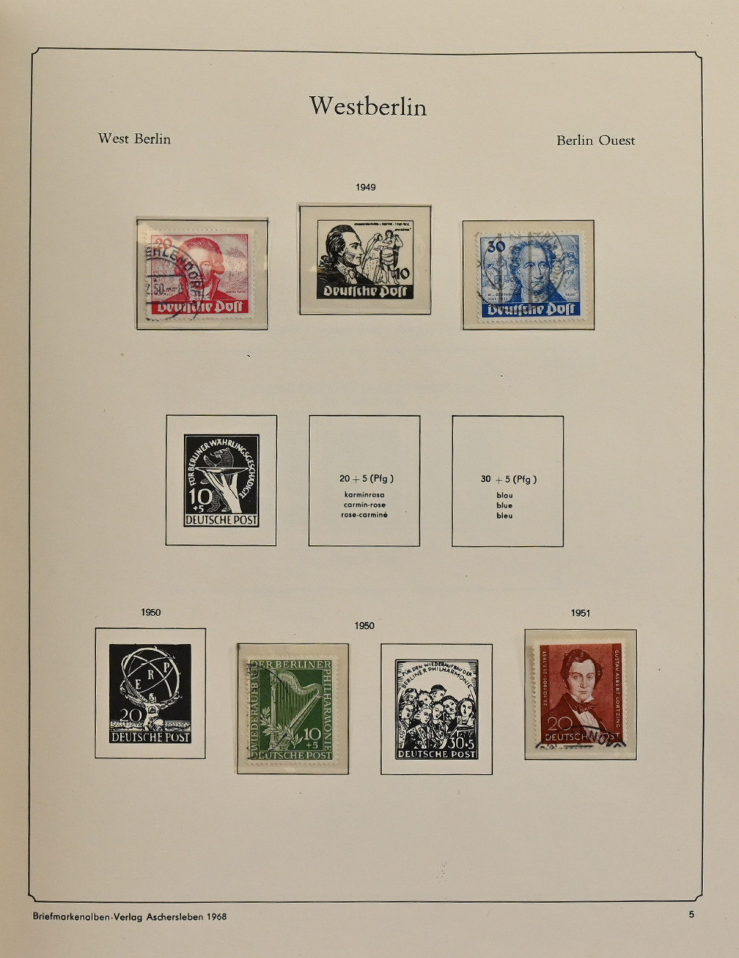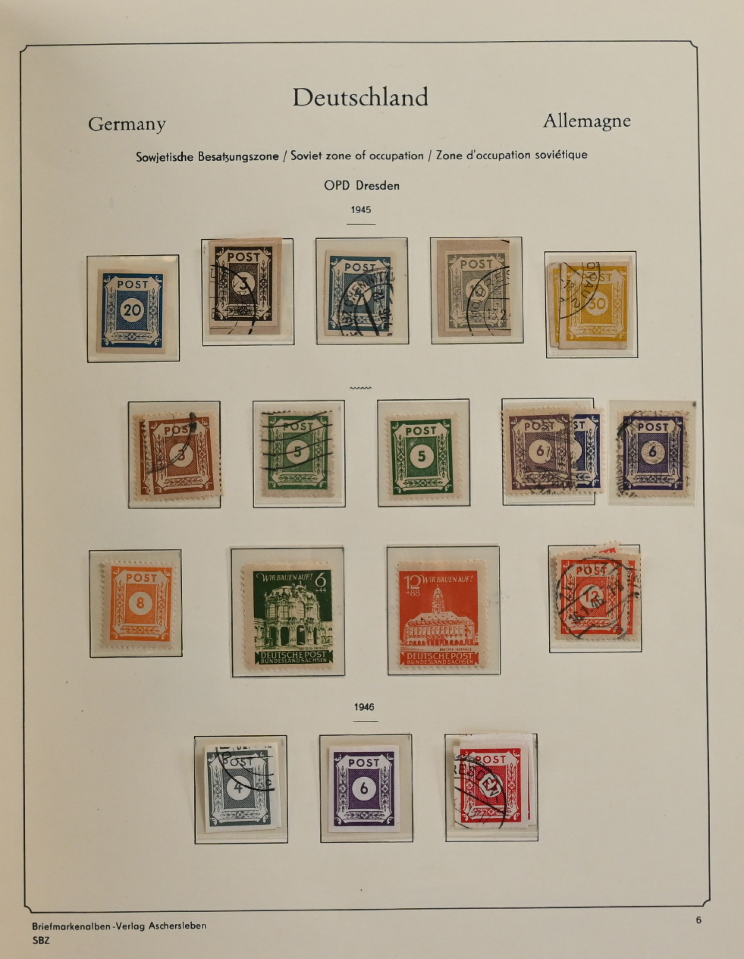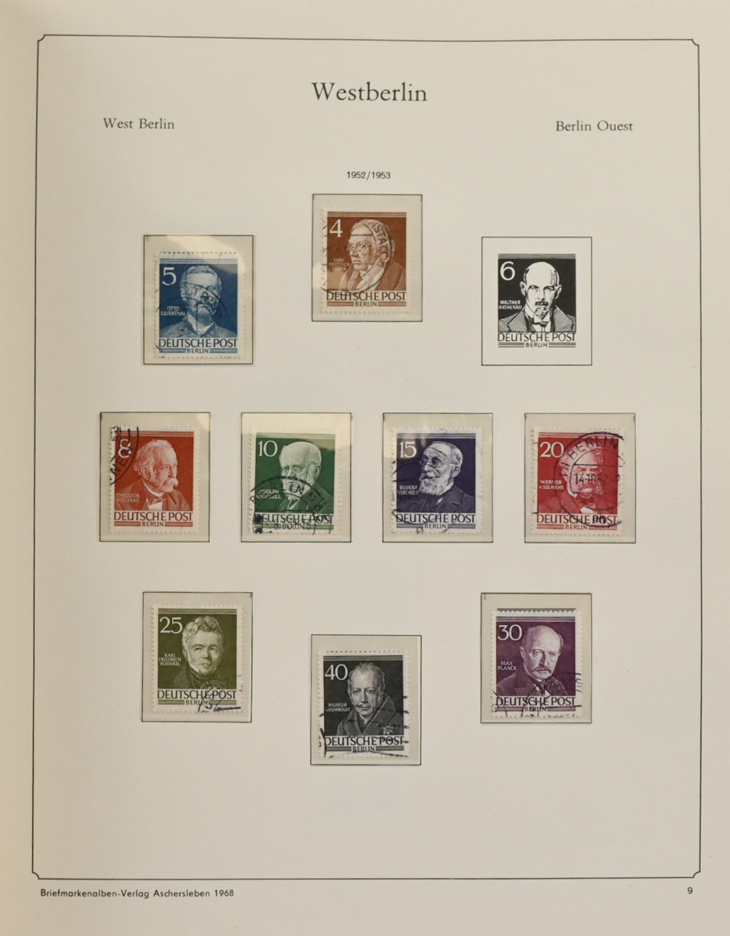 1945 - 1989 2. maailmansodan miehitysvyöhykkeet, Berlin (West) ja Länsi-Saksa leimatut kokoelmat kolmessa hyvässä taskutetussa kansiossa. Länsi-Saksa lähes täydellinen, mm. lähes kaikki alkupään paremmat merkit mukana, Berlin varsin hyvä, miehitysvyöhykkeissä vähemmän merkkejä. Lisäksi neljäs kansio yhdistyneen Saksan merkeille (tyhjä)