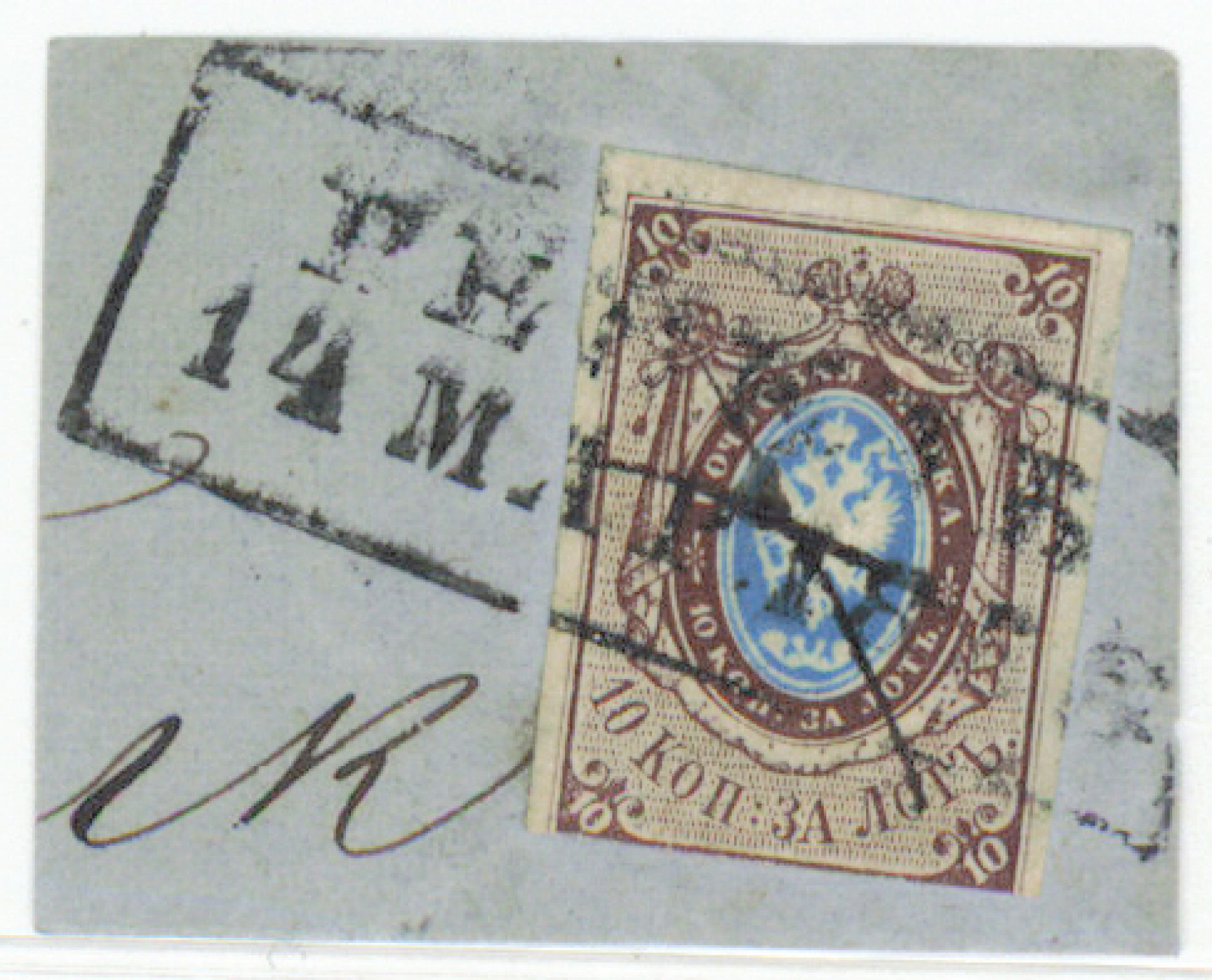 1857 10 kopeekkaa Mi 1, leimattu merkki leikkeellä, Revalin (Tallinna) laatikkoleimalla. Merkin alareuna hiukan sisäänleikattu