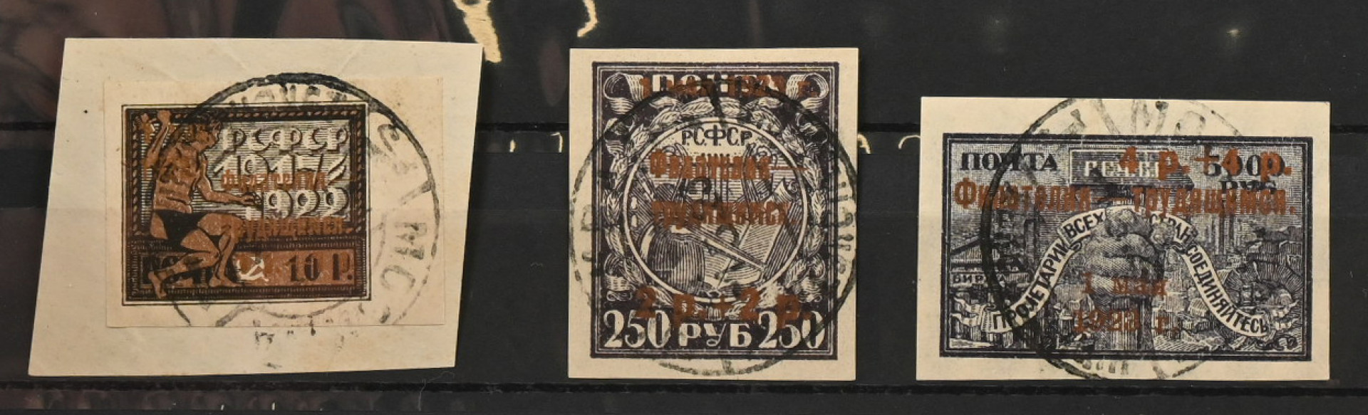 1923 päällepainamat Mi 212b, 213a ja 214a, hyvät leimatut merkit
