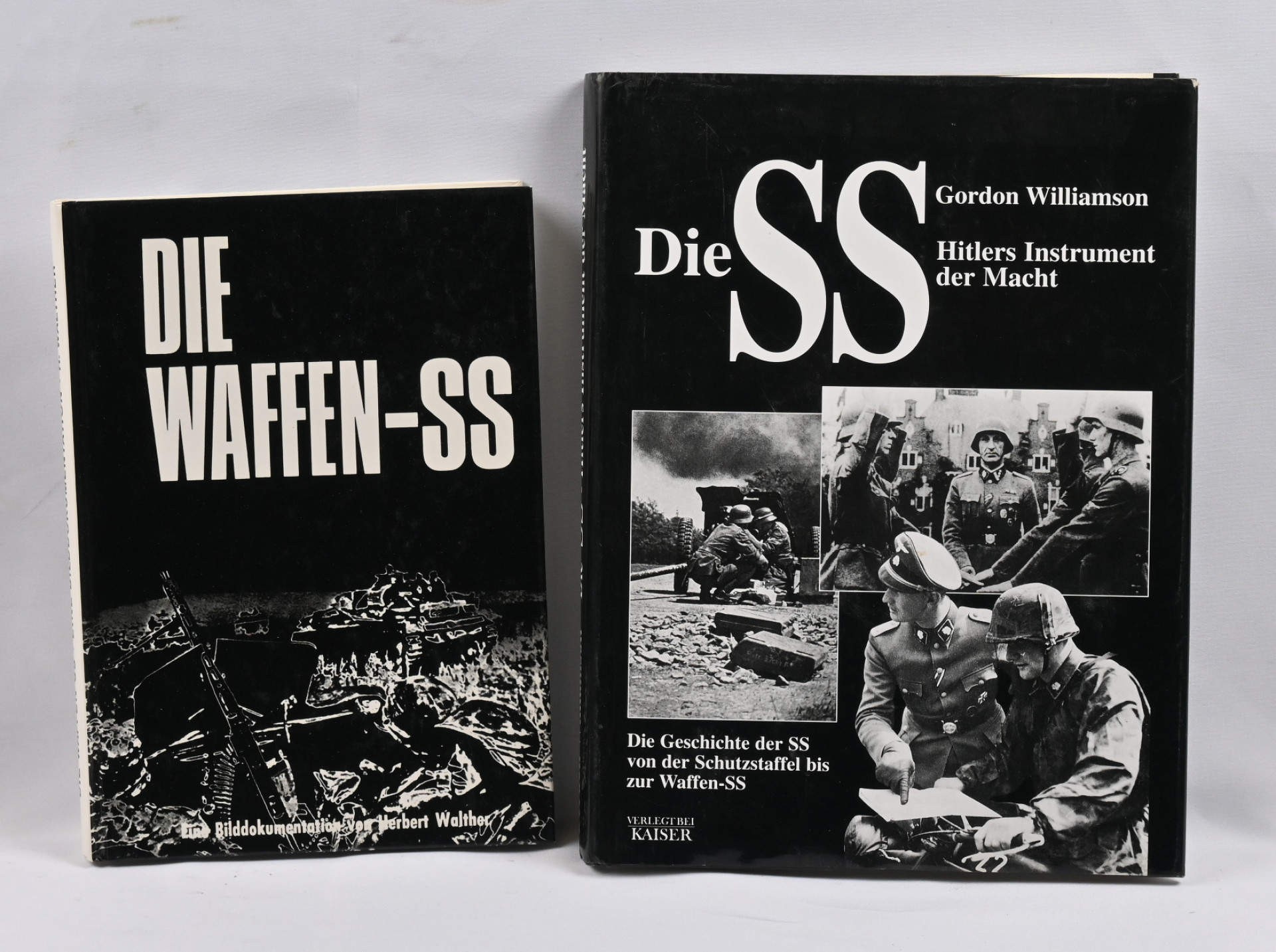 Kaksi kirjaa SS-joukoista. Herbert Walther: ”Die Waffen SS” (Podzun-Pallas 1994) ja Gordon Williamson: “Die SS - Hitlers Instrument der Macht” (Kaiser 1998). Mielenkiintoiset, runsaasti kuvitetut teokset. Kovakantiset, hyväkuntoiset.