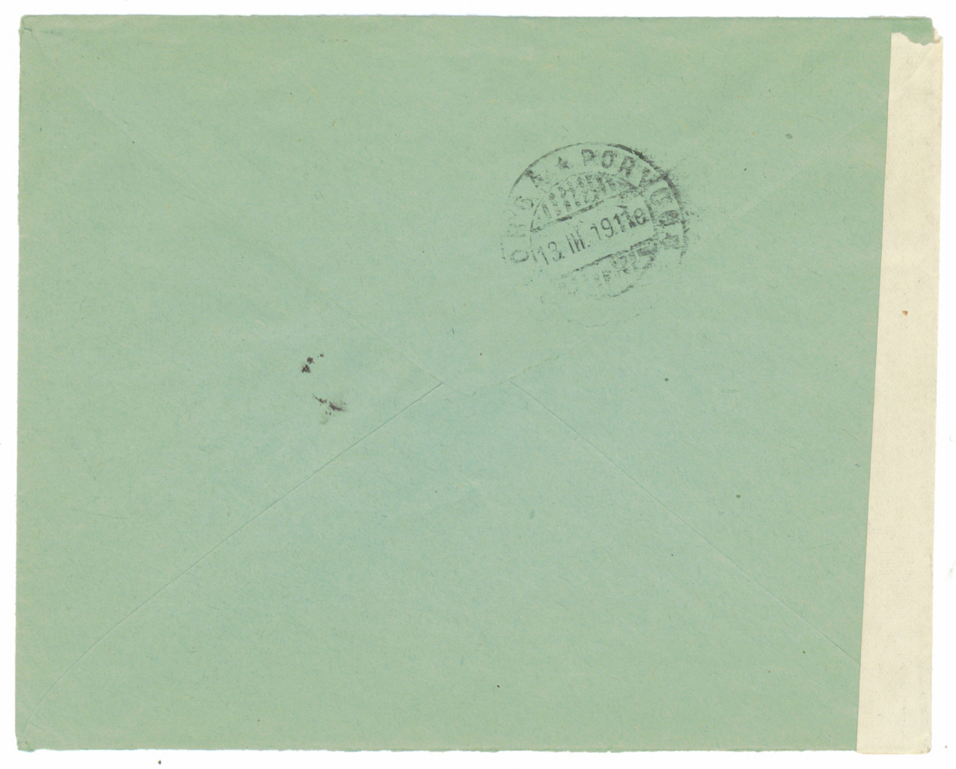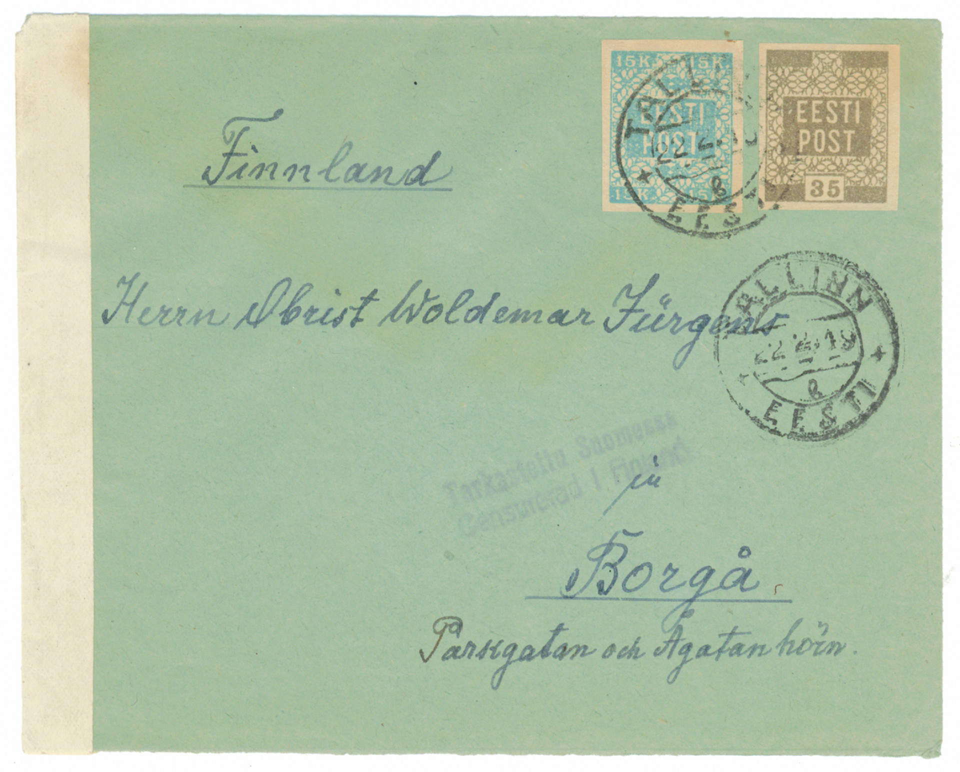 1918 15 kopeekkaa ja 35 penniä Mi 2 ja 3 harvinaisella sekapostitekuorella Suomeen, Tallinn 22.2.1919, tuloleima Helsinki 13.3.1919. Sensuurileima ja -liuska.