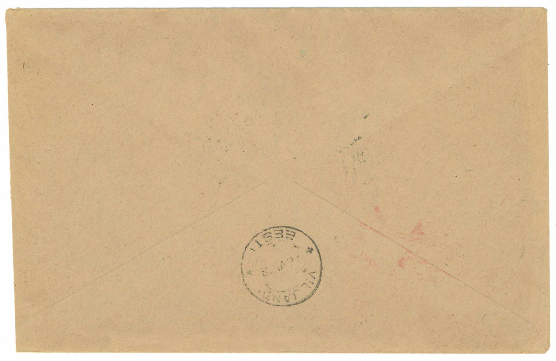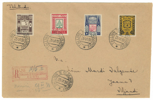 1938 Kirjattu kirje 25.VI.38, frankeerattu koko Caritas 1938 sarjalla Mi 131-134, laulufestivaalien leimaus