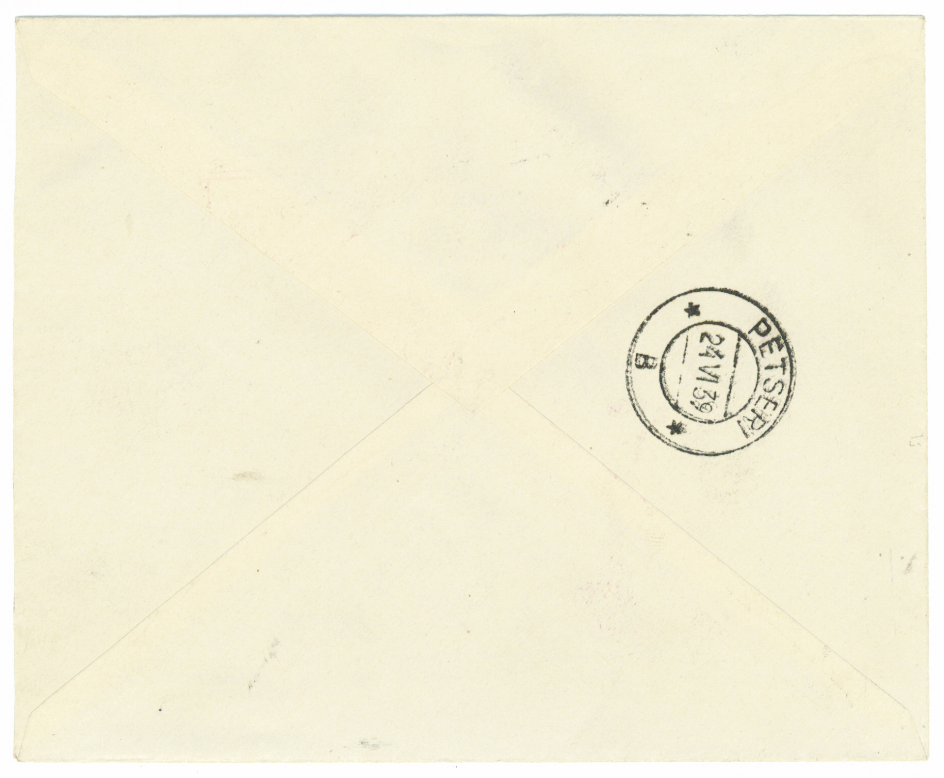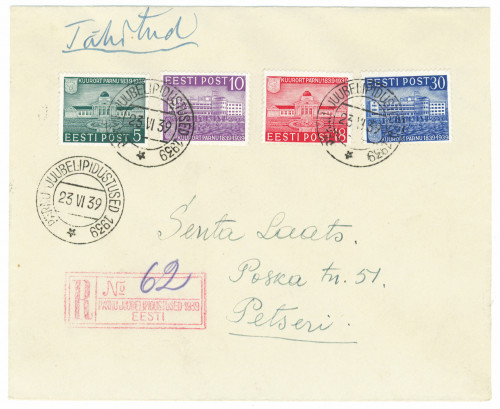 1939 Kirjattu kirje 23.VI.39 Pärnusta Petseriin, tilapäinen postitoimistoleima PÄRNU JUUBELIPIDUSTUSED. Frankeerattu koko Pärnu-sarjalla Mi 148-151