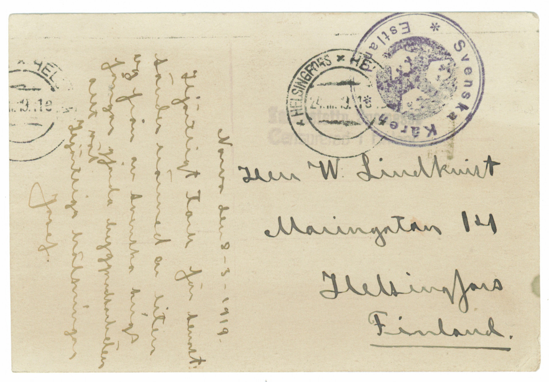 Ruotsin vapaaehtoiset Virossa, Vapaaehtoiskaartin leima ”Svenska Kåren Estland” kenttäpostikortilla Helsinkiin, tuloleima 24.3.1919. Hieno ja hyvin harvinainen!