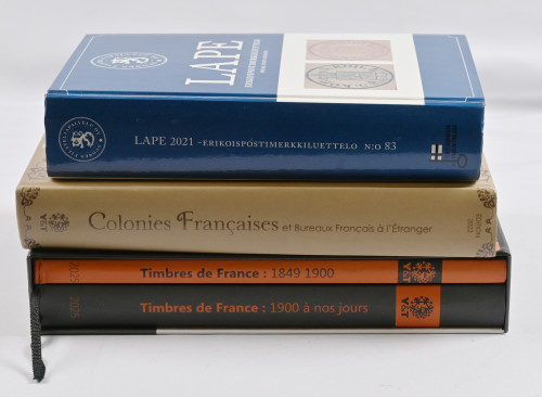 Kolme hyvää luetteloa: LAPE 2021 -erikoispostimerkkiluettelo sekä Yvert & Tellierin 2025 kaksiosainen kovakantinen Ranska-luettelo sekä Yvert & Tellierin Ranskan siirtomaat -luettelo vuodelta 2022