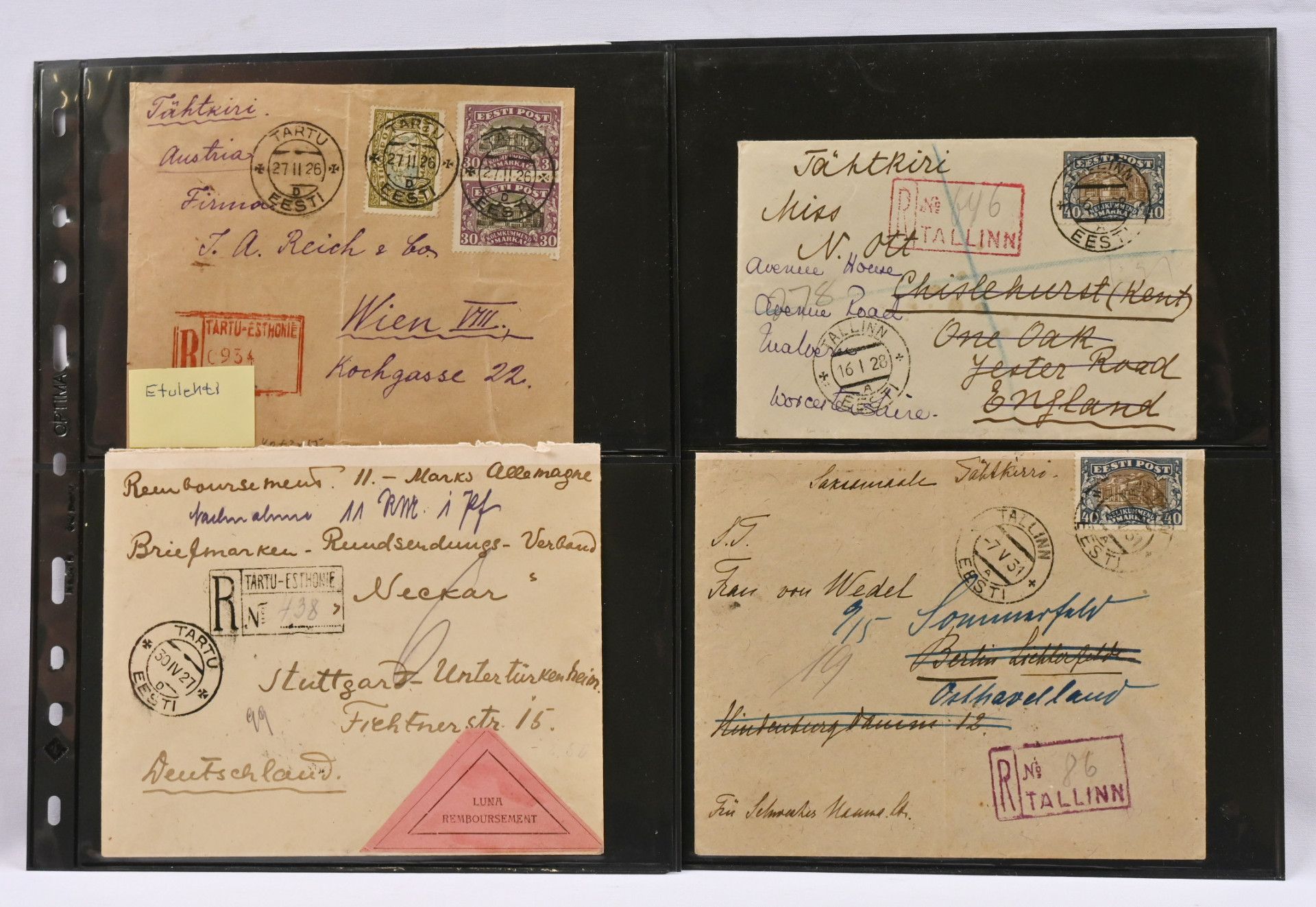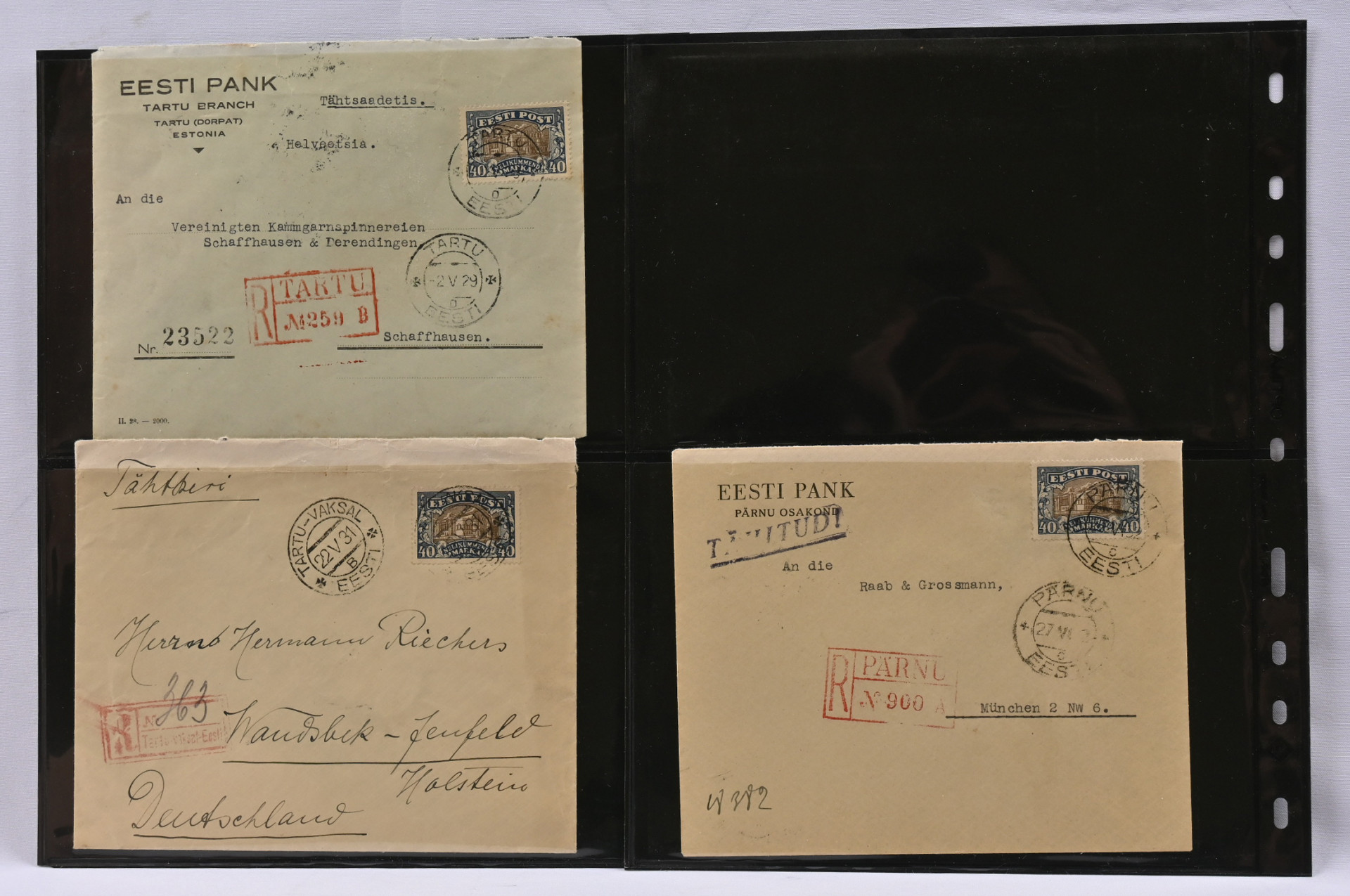 1926 - 1932 kuusi kirjattua postilähetystä ja yksi etusivu, kaikki frankeerattu 30 markan ja 40 markan teatterimerkeillä Mi 55 ja 62. Mukana postiennakko, uudelleenlähetetty, erikoiskirjausleima, monet lähetetty Saksaan. Viisi lähetyksistä on 40 markan yksittäispostitteita.