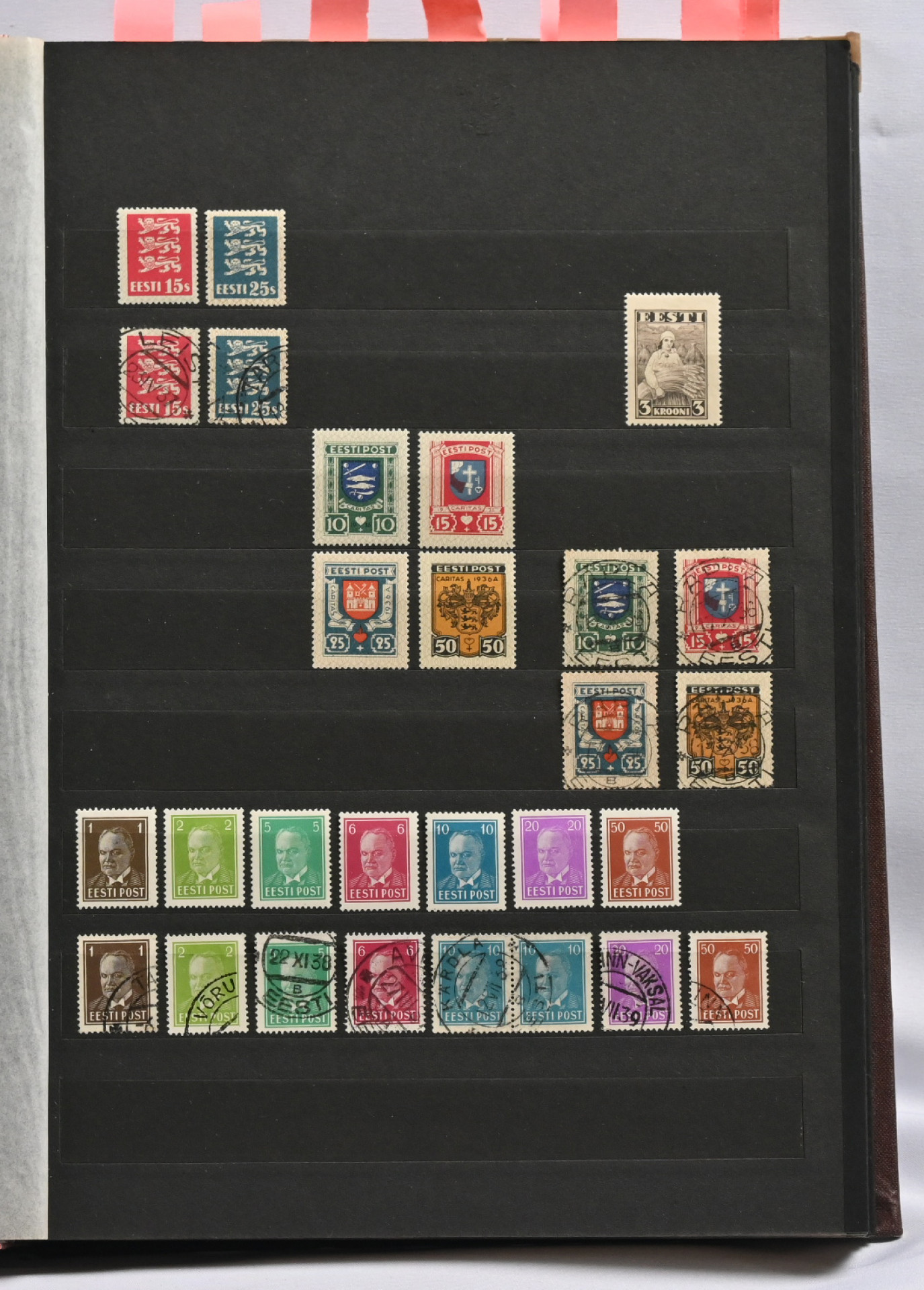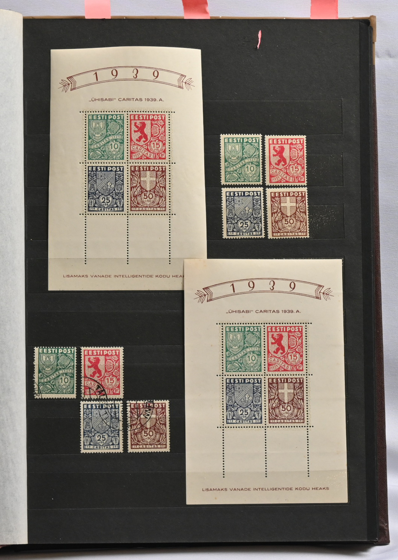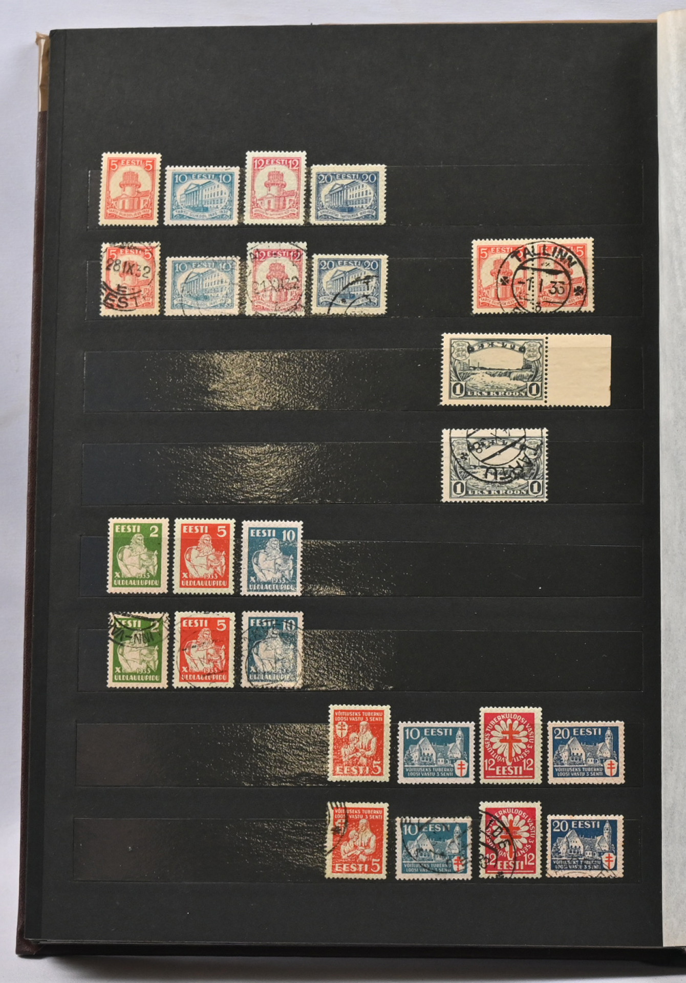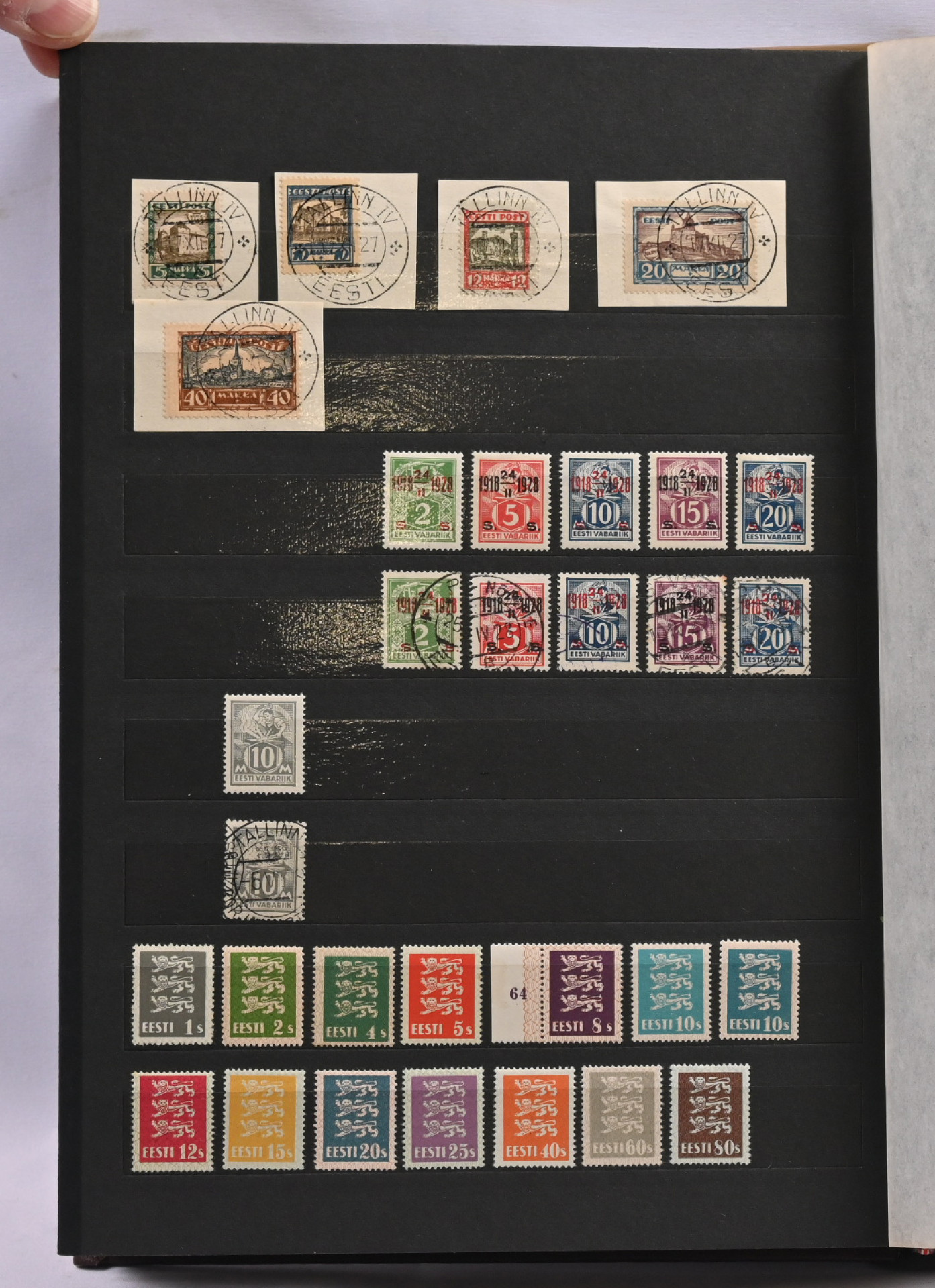 1918 - 1940 Hyvä **/*/o kokoelma säiliökirjassa. Käytännössä täydellinen päälajien osalta. Suurin osa merkeistä sekä leimattuna että käyttämättömänä (**/*). Kaikki pienoisarkit, Caritas-merkkien ryhmiä (mm. 1937 postituoreet kuusilot), kaikki Päts-merkit postituoreena jne. Jotkut käyttämättömistä merkeistä saaneet kosteutta ja ovat osin tarttuneet kiinni sivuihin. Irrotettaessa saattaa tarttua mustaa paperia. Kuitenkin hieno kokoelma. Nähtävä!