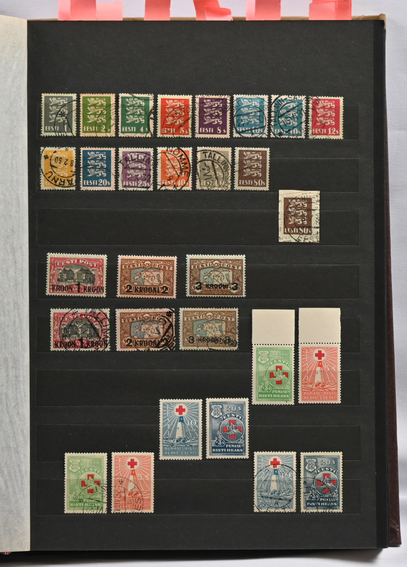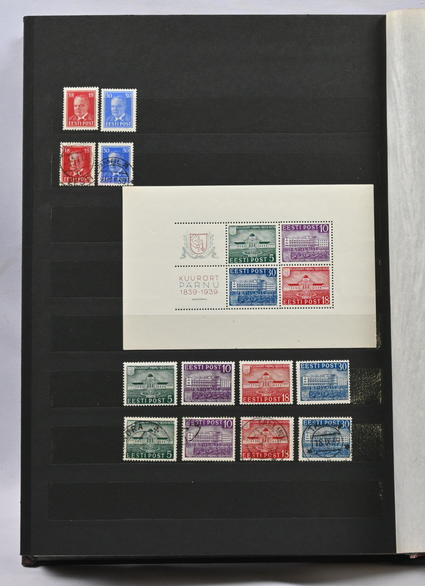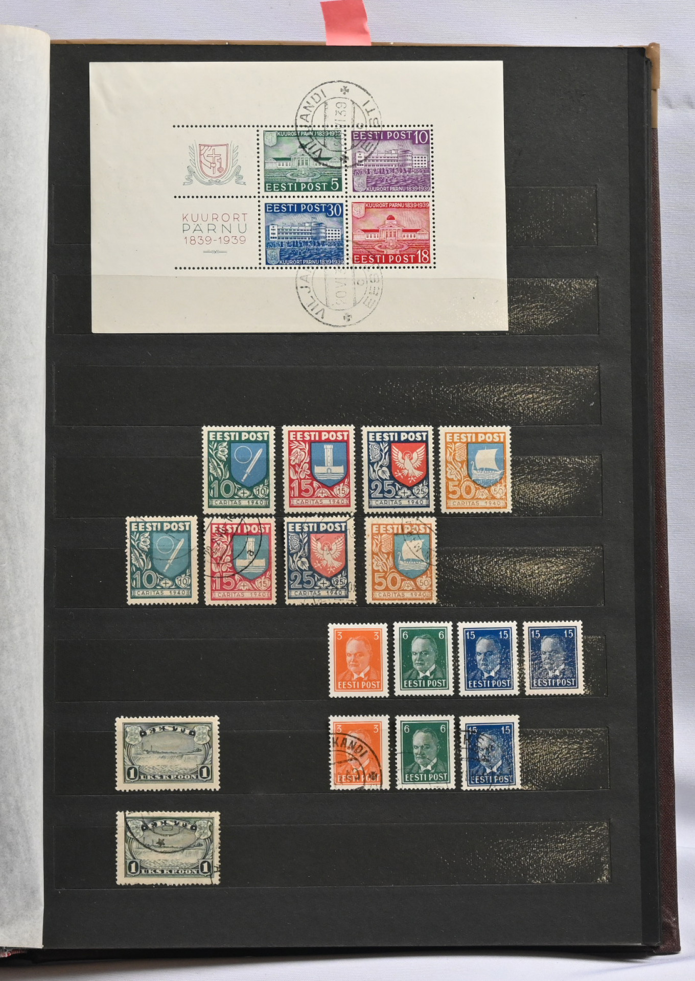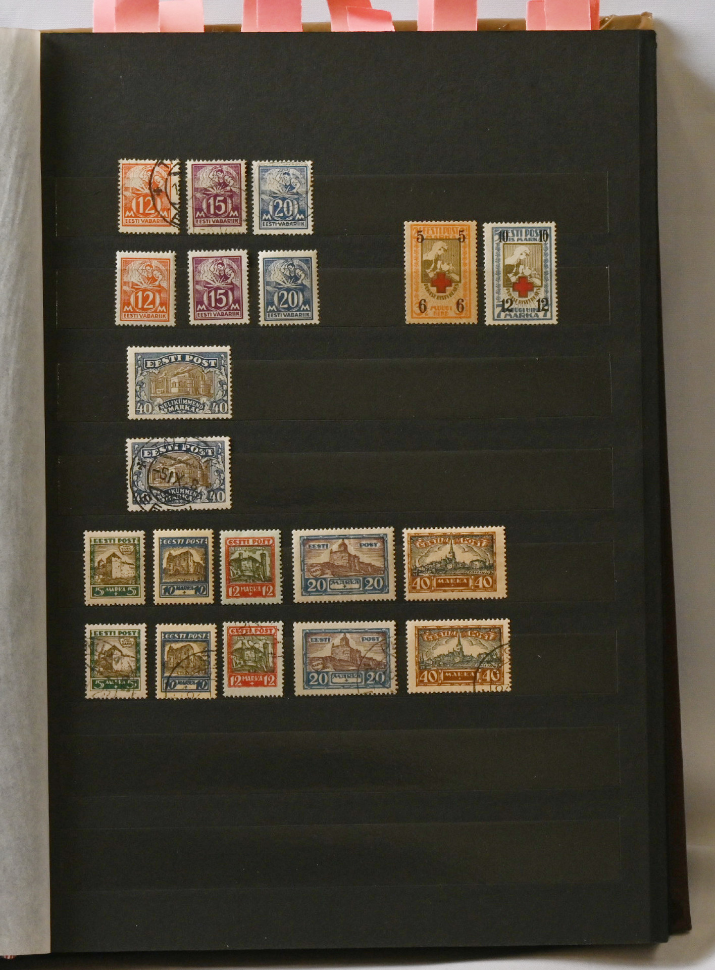 1918 - 1940 Hyvä **/*/o kokoelma säiliökirjassa. Käytännössä täydellinen päälajien osalta. Suurin osa merkeistä sekä leimattuna että käyttämättömänä (**/*). Kaikki pienoisarkit, Caritas-merkkien ryhmiä (mm. 1937 postituoreet kuusilot), kaikki Päts-merkit postituoreena jne. Jotkut käyttämättömistä merkeistä saaneet kosteutta ja ovat osin tarttuneet kiinni sivuihin. Irrotettaessa saattaa tarttua mustaa paperia. Kuitenkin hieno kokoelma. Nähtävä!