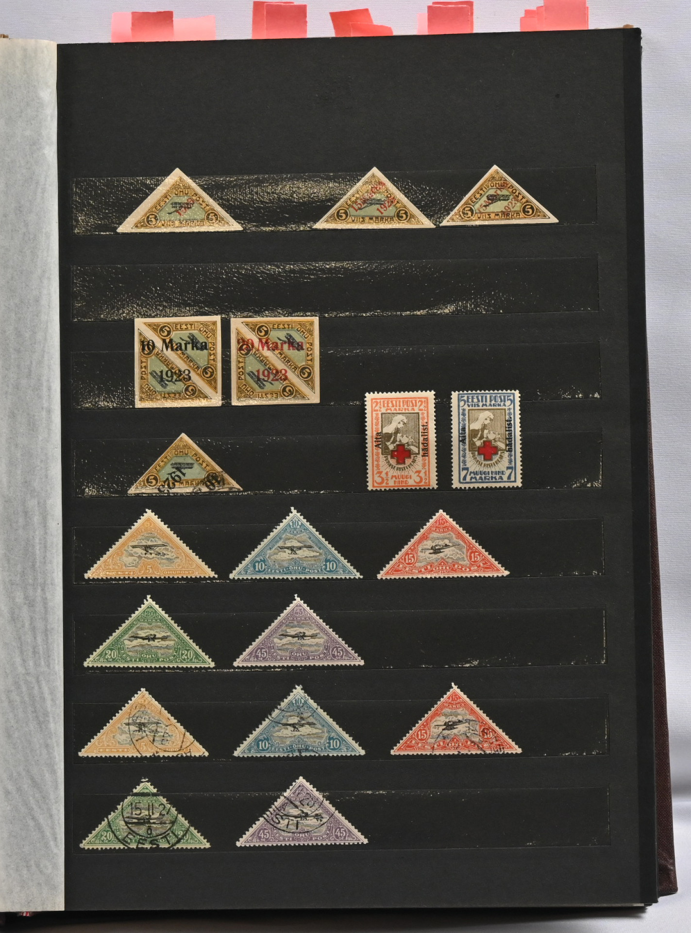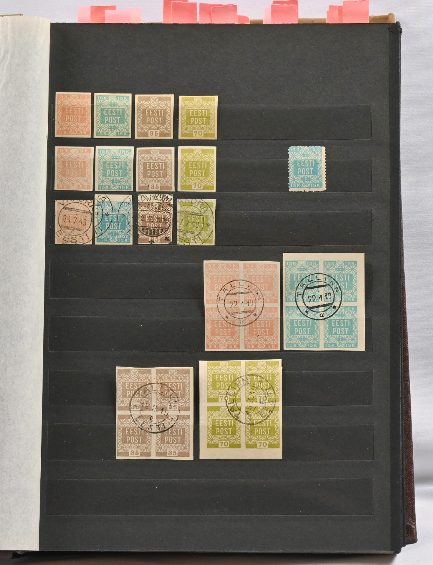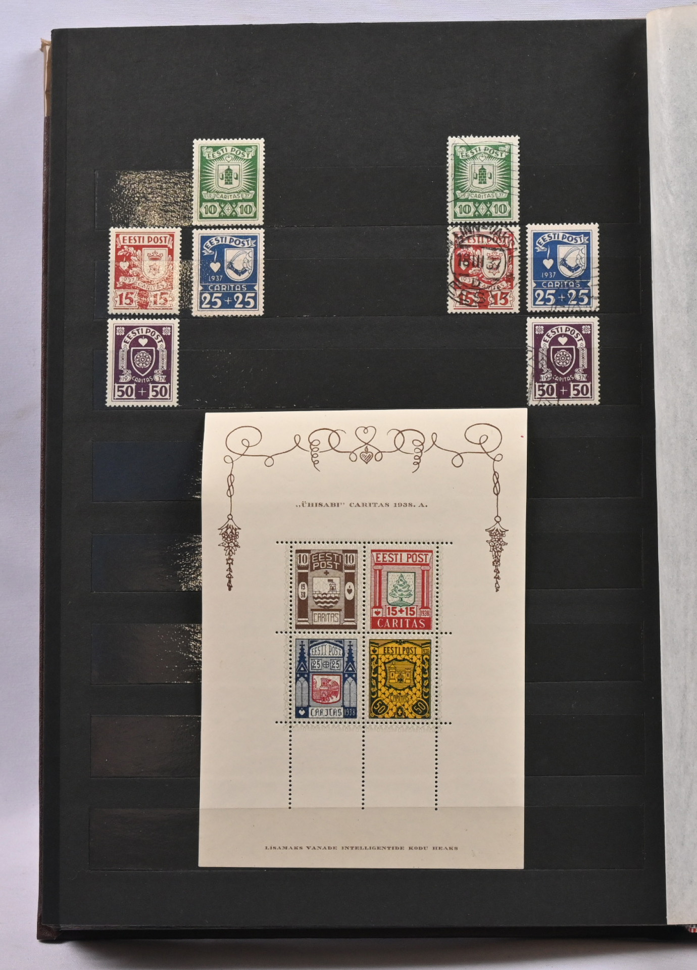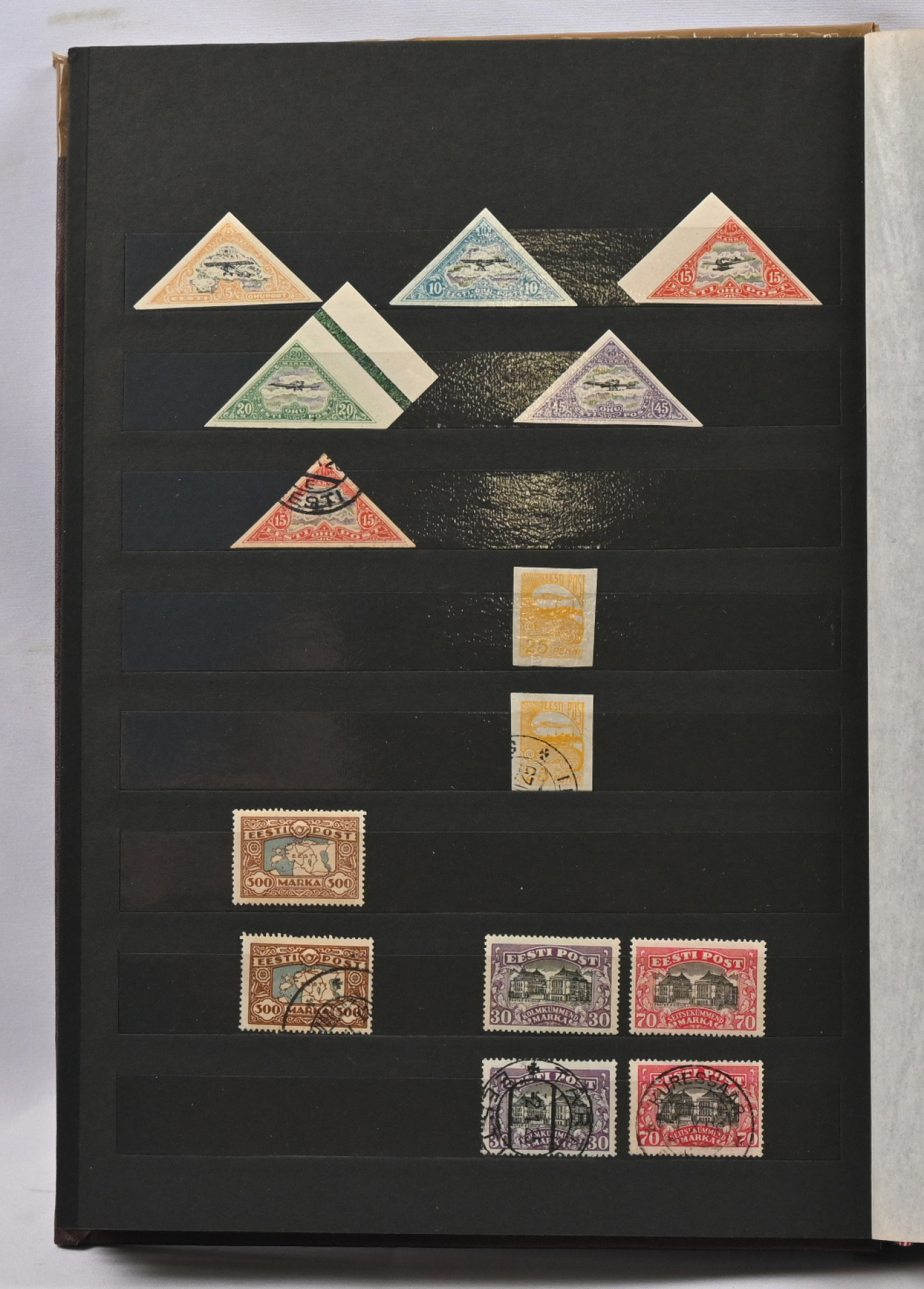 1918 - 1940 Hyvä **/*/o kokoelma säiliökirjassa. Käytännössä täydellinen päälajien osalta. Suurin osa merkeistä sekä leimattuna että käyttämättömänä (**/*). Kaikki pienoisarkit, Caritas-merkkien ryhmiä (mm. 1937 postituoreet kuusilot), kaikki Päts-merkit postituoreena jne. Jotkut käyttämättömistä merkeistä saaneet kosteutta ja ovat osin tarttuneet kiinni sivuihin. Irrotettaessa saattaa tarttua mustaa paperia. Kuitenkin hieno kokoelma. Nähtävä!